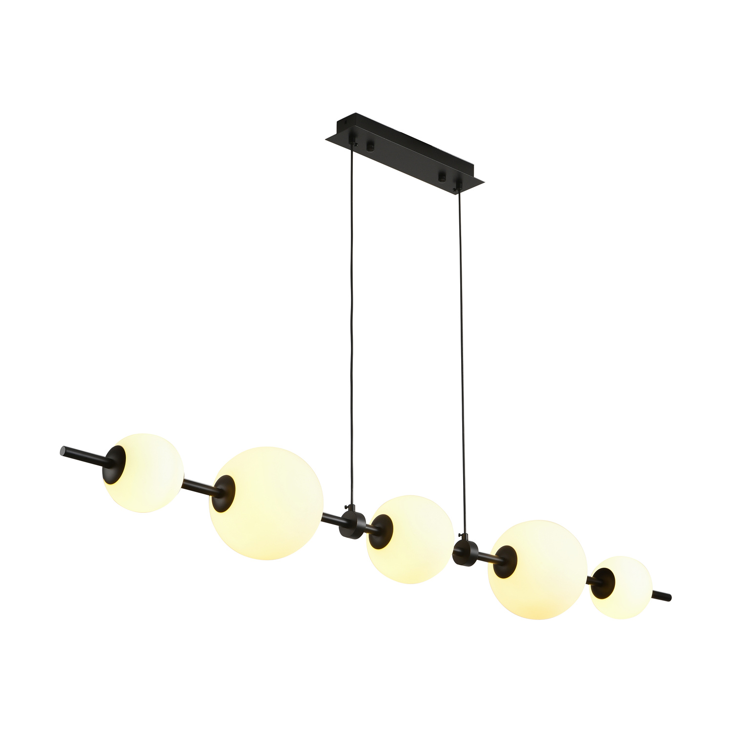 Elegancka, nowoczesna biała lampa wisząca MILA składa się z długiej, poziomej metalowej listwy, do której przymocowanych jest kilka kulistych kloszy.