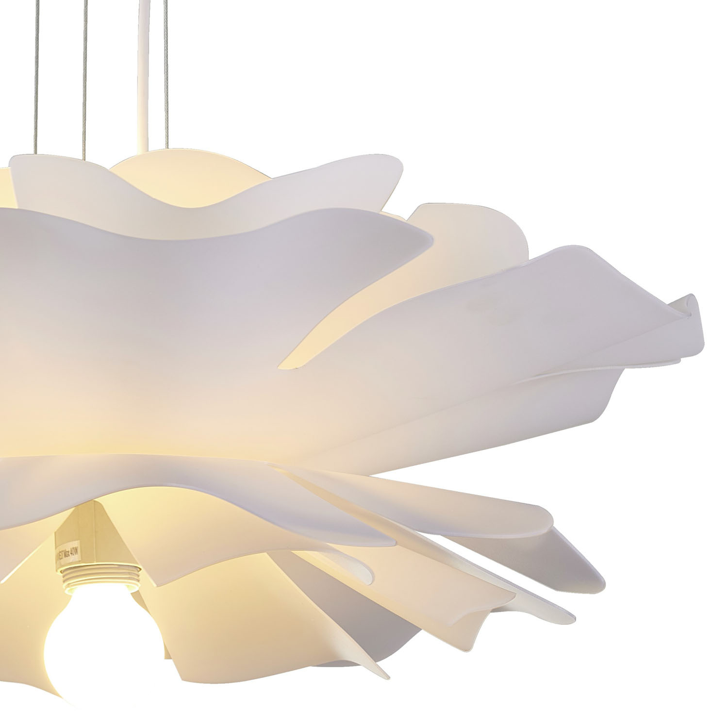 Lampa wisząca PEONY biała 50 cm w kształcie kwiatu to eleganckie i nowoczesne oświetlenie sufitowe, które idealnie pasuje do salonu, sypialni, jadalni oraz nowoczesnych aranżacji wnętrz. Jej unikalny design inspirowany kwiatem piwonii sprawia, że lampa staje się centralnym elementem dekoracyjnym każdego pomieszczenia, łącząc funkcjonalność z estetyką.