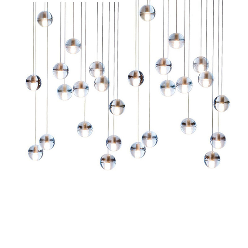 Transparentne kule są zawieszone na kablach w delikatnym, przeźroczystym oplocie.