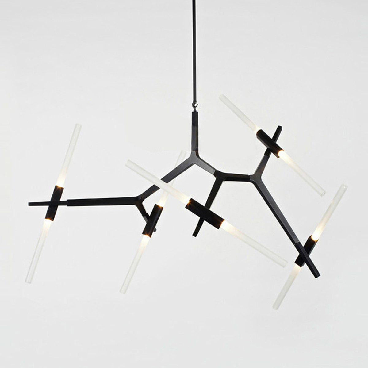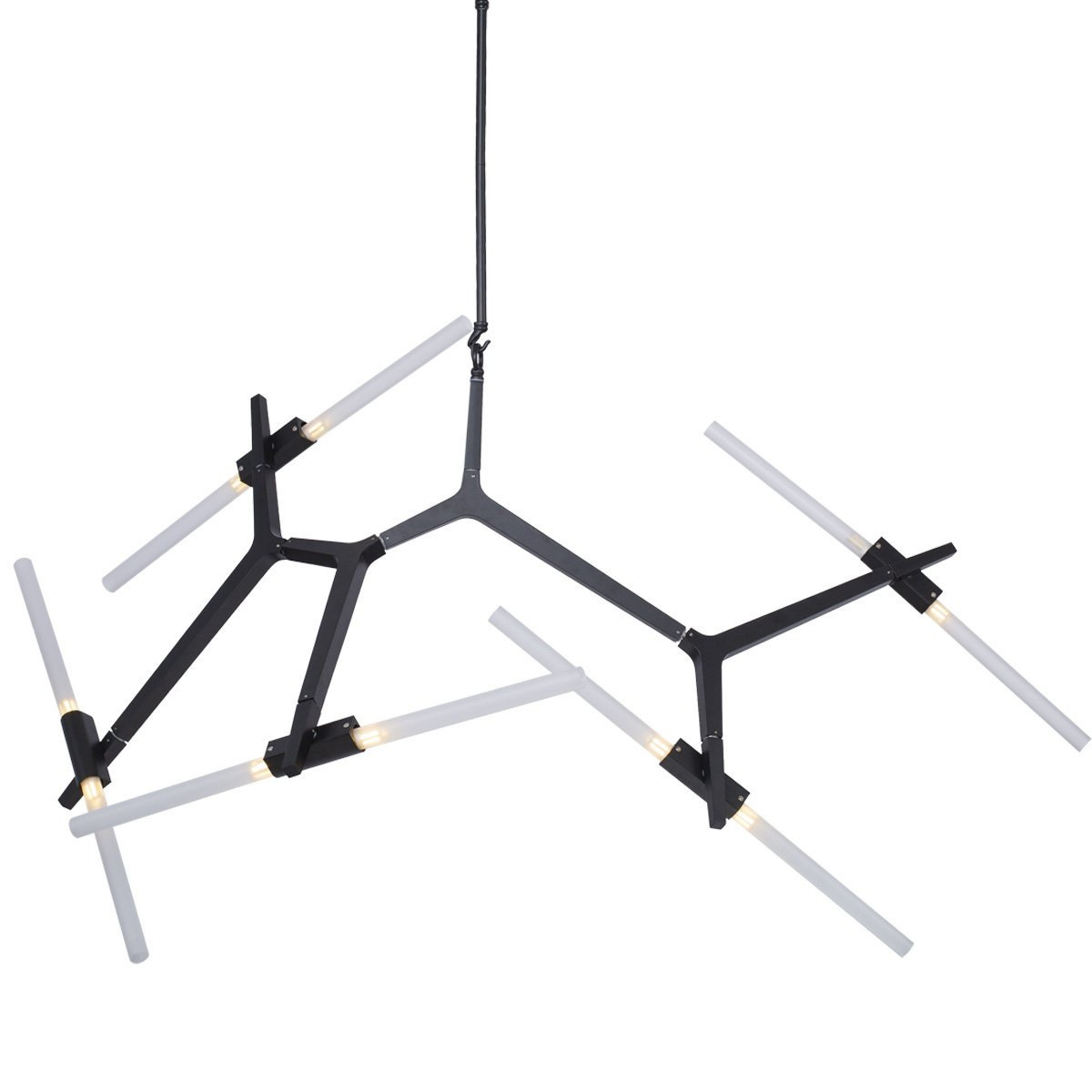 Designerska lampa wisząca w kolorze czarnym o asymetrycznej formie z możliwością regulacji ramion w wielu płaszczyznach.