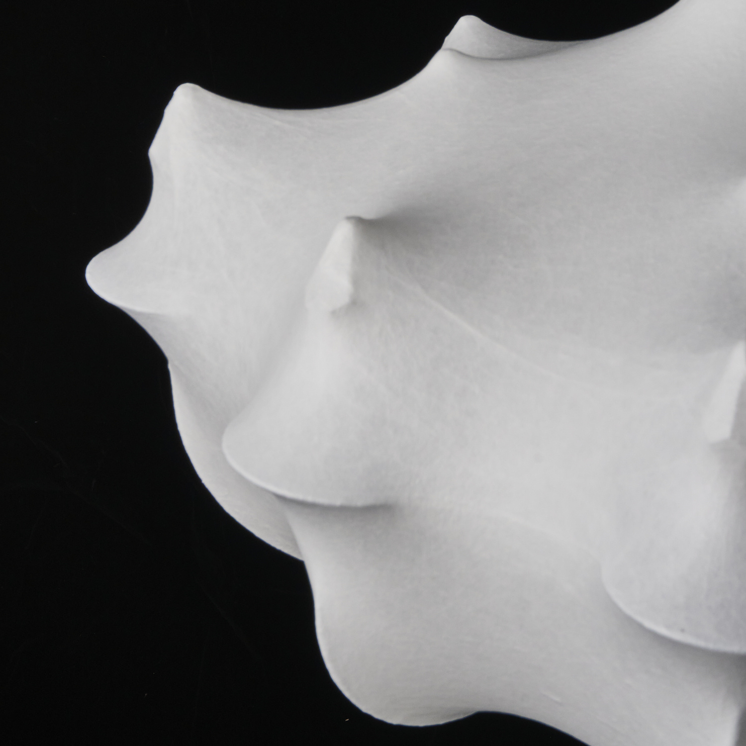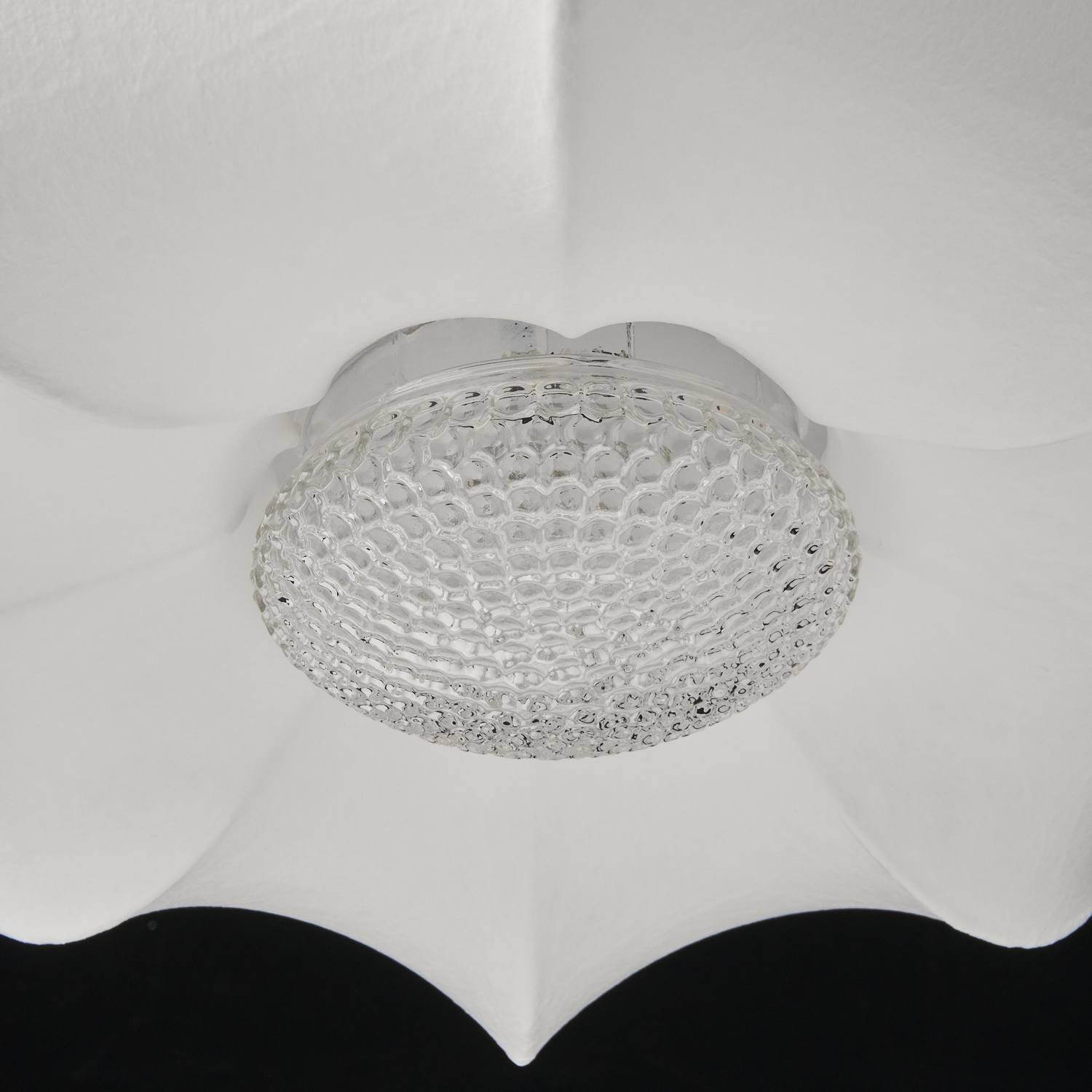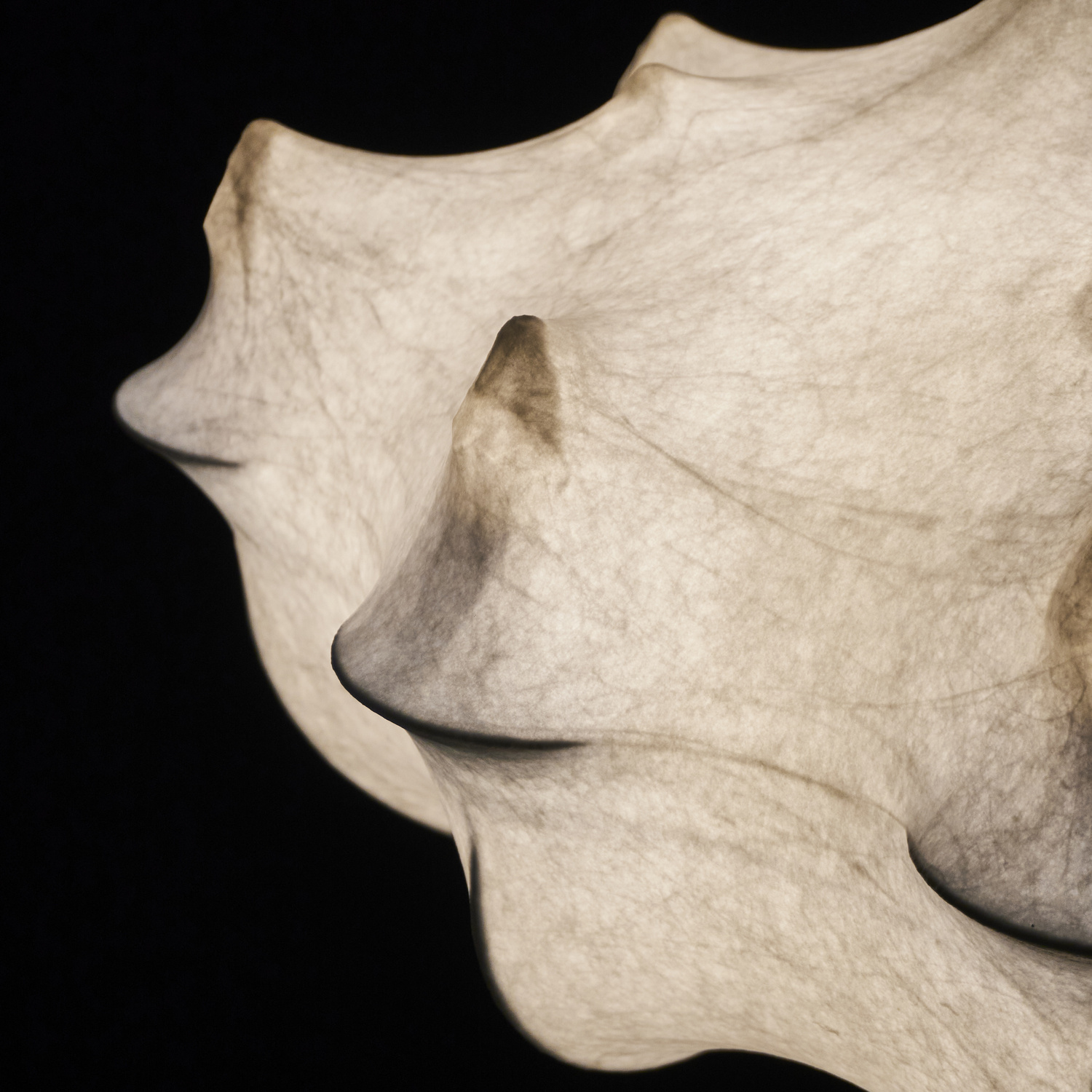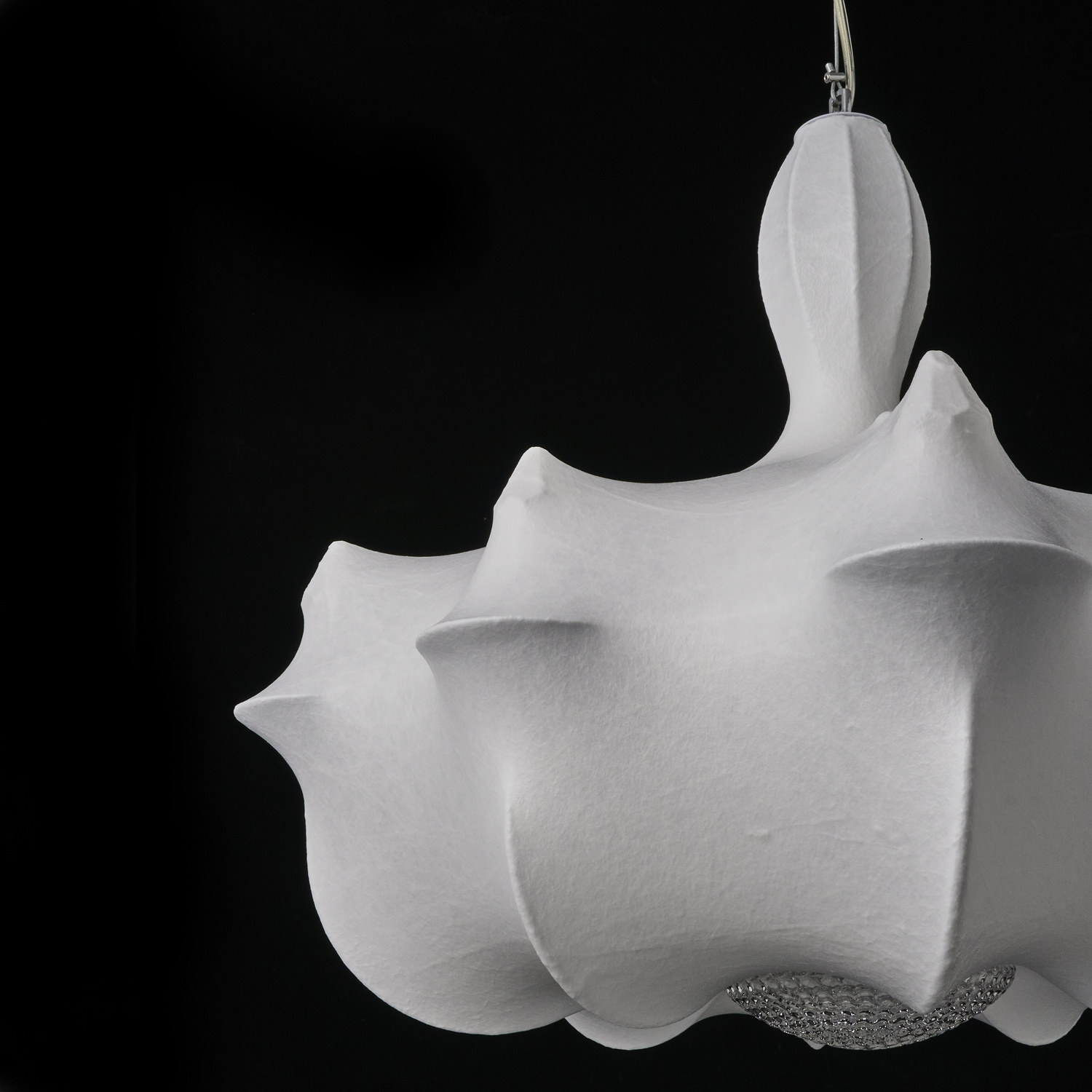 Tkanina imitująca delikatną pajęczynę sprawia, że forma lampy nabiera wyjątkowej lekkości.