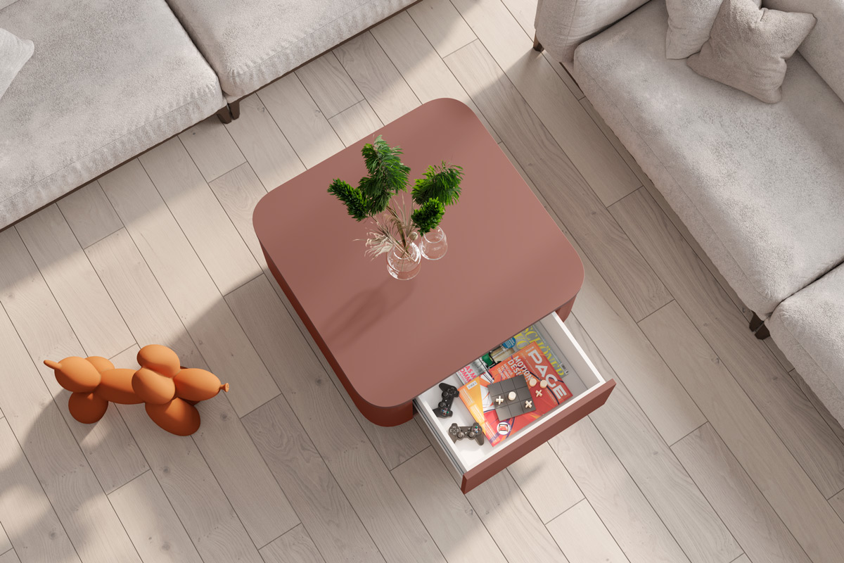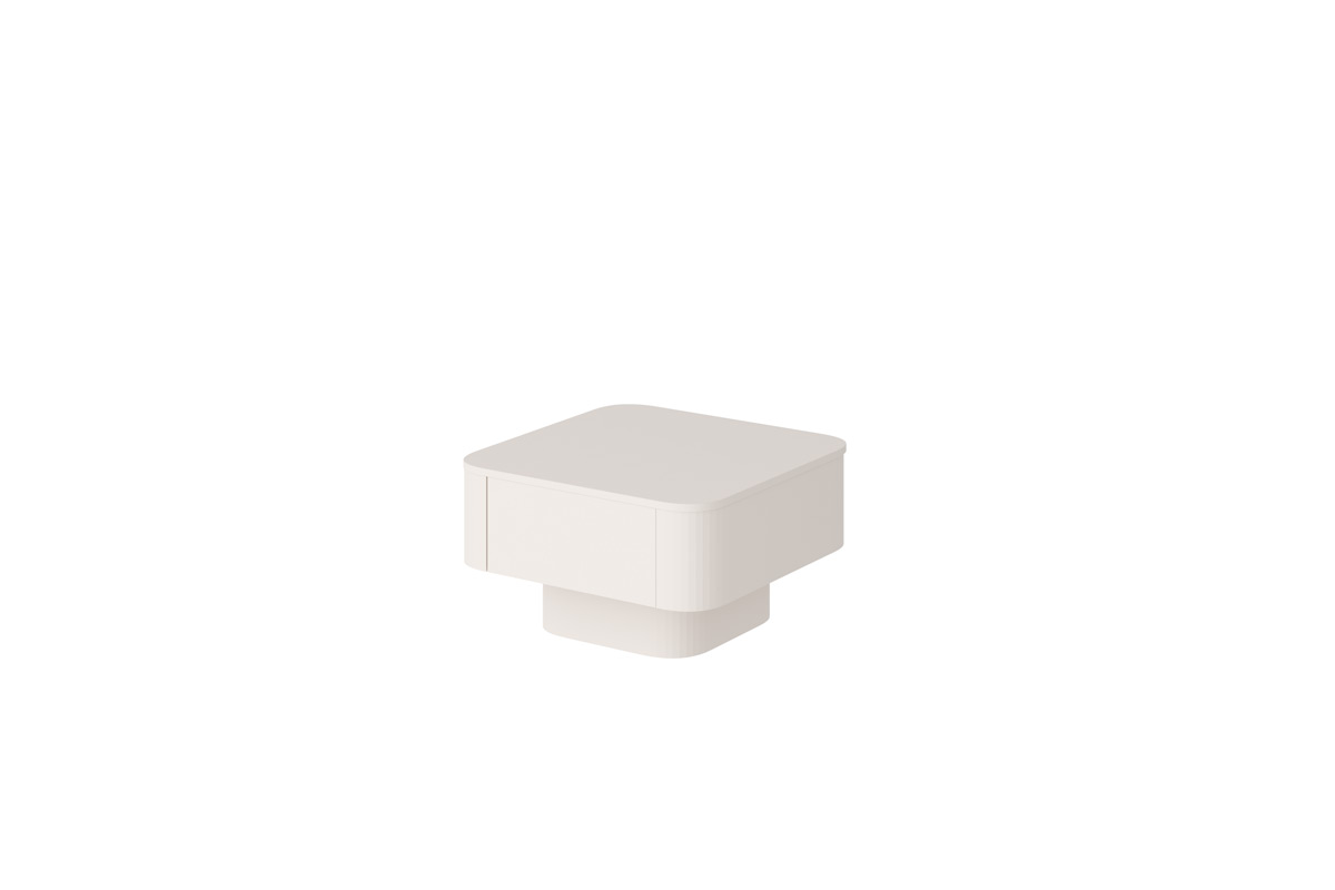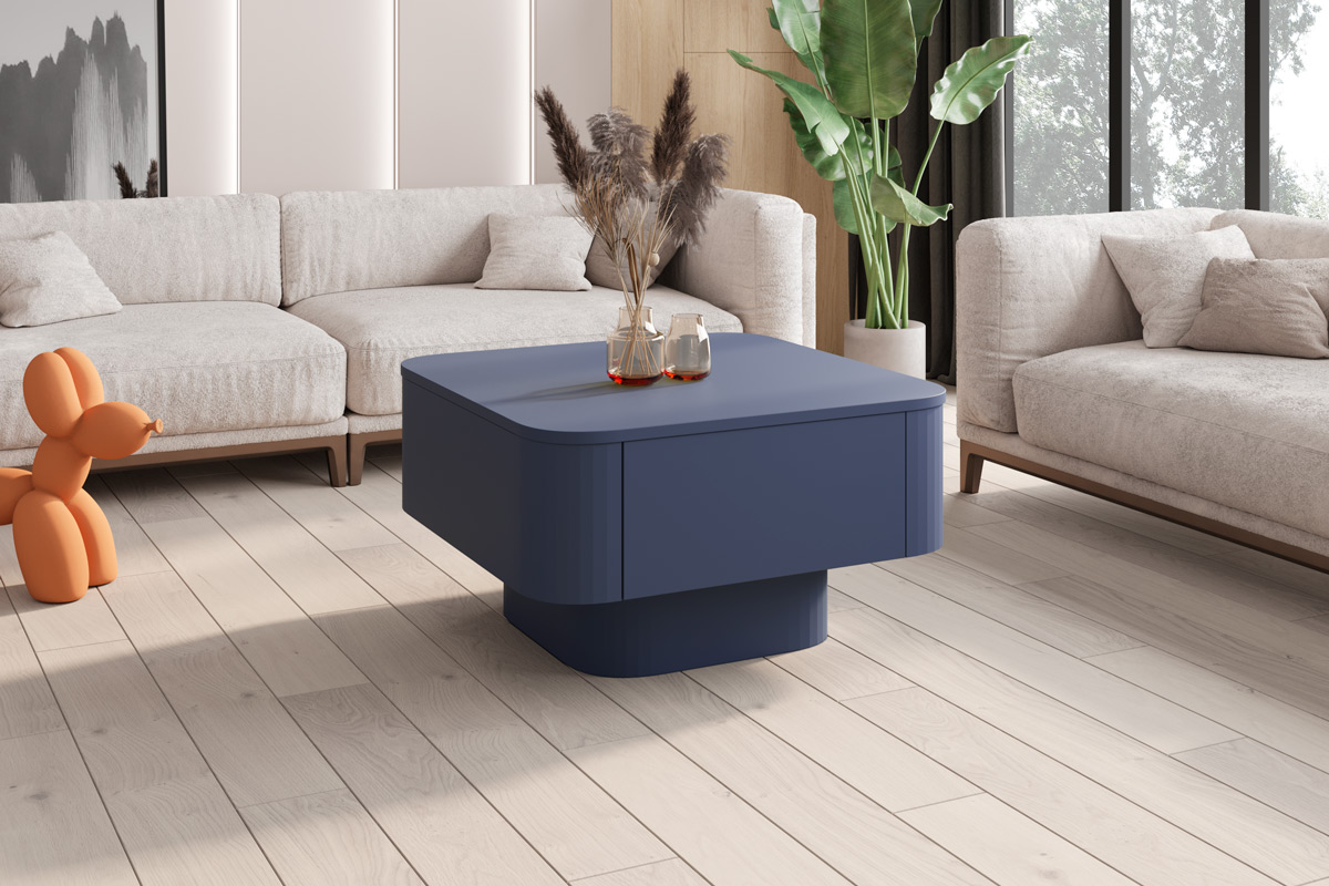 Ława Grado z kolekcji Amore Colore to intrygujący mebel, który przyciąga uwagę swoim nietuzinkowym designem. Jej blat ma formę zaoblonego kwadratu, co nadaje jej miękkości i harmonii. Wykonana z eleganckiego materiału o aksamitnym, głębokim macie, ława emanuje nowoczesnym minimalizmem i subtelną elegancją.