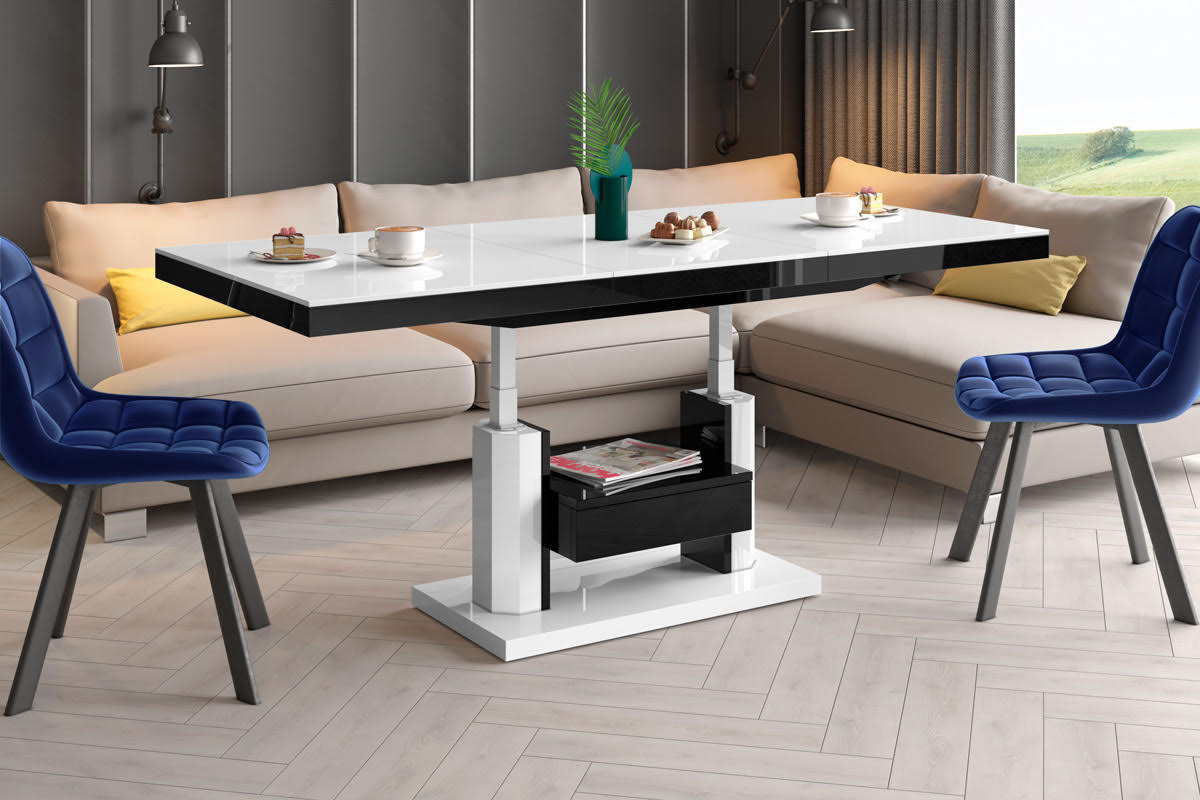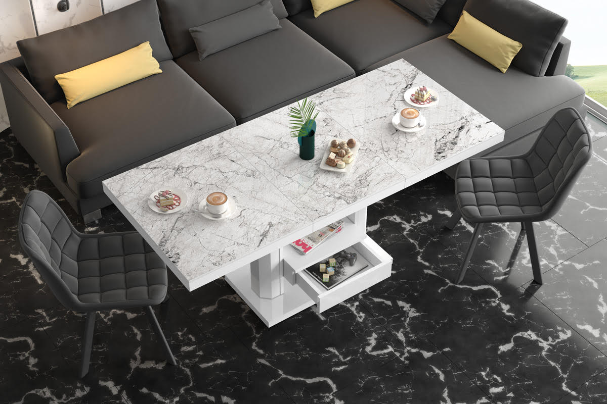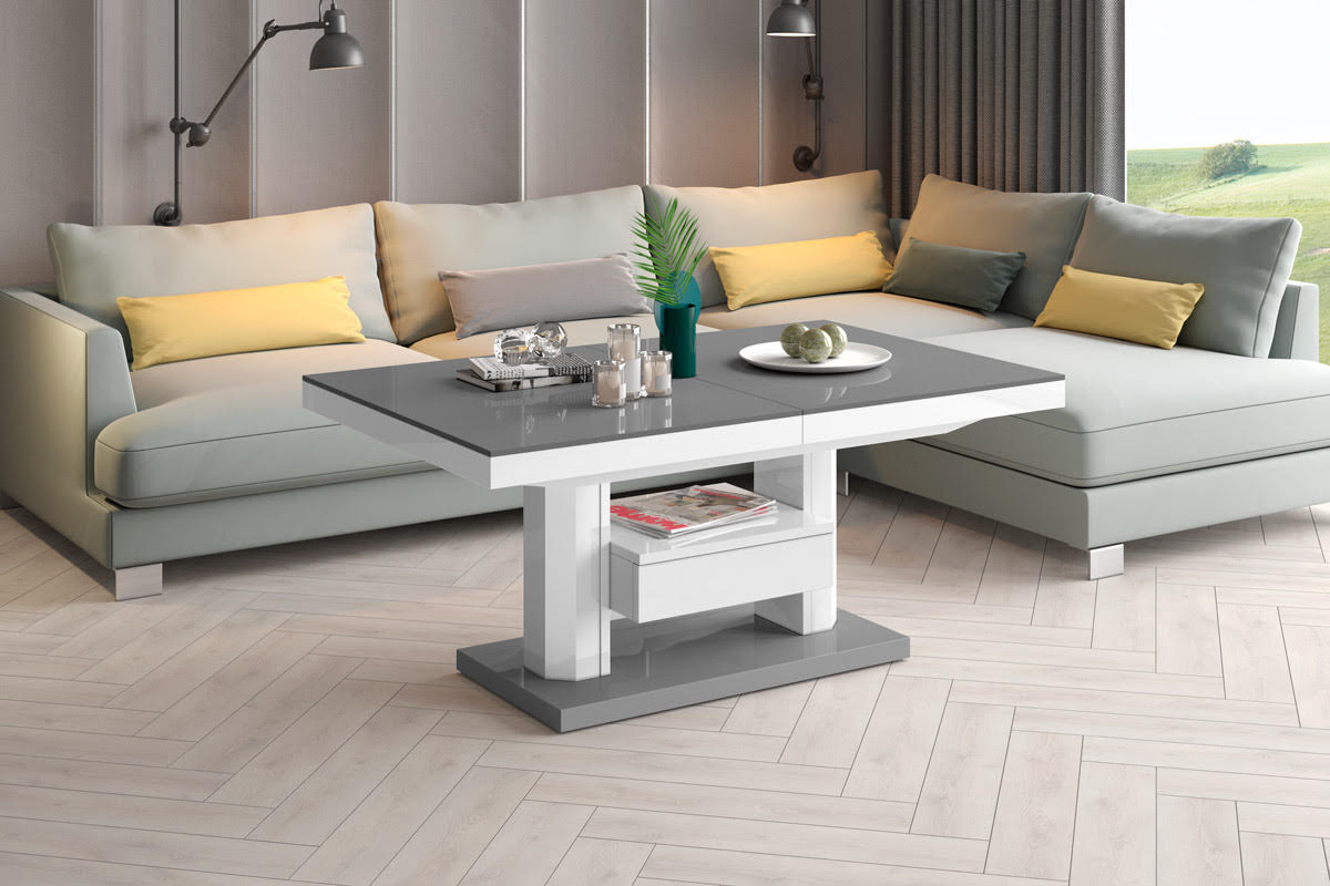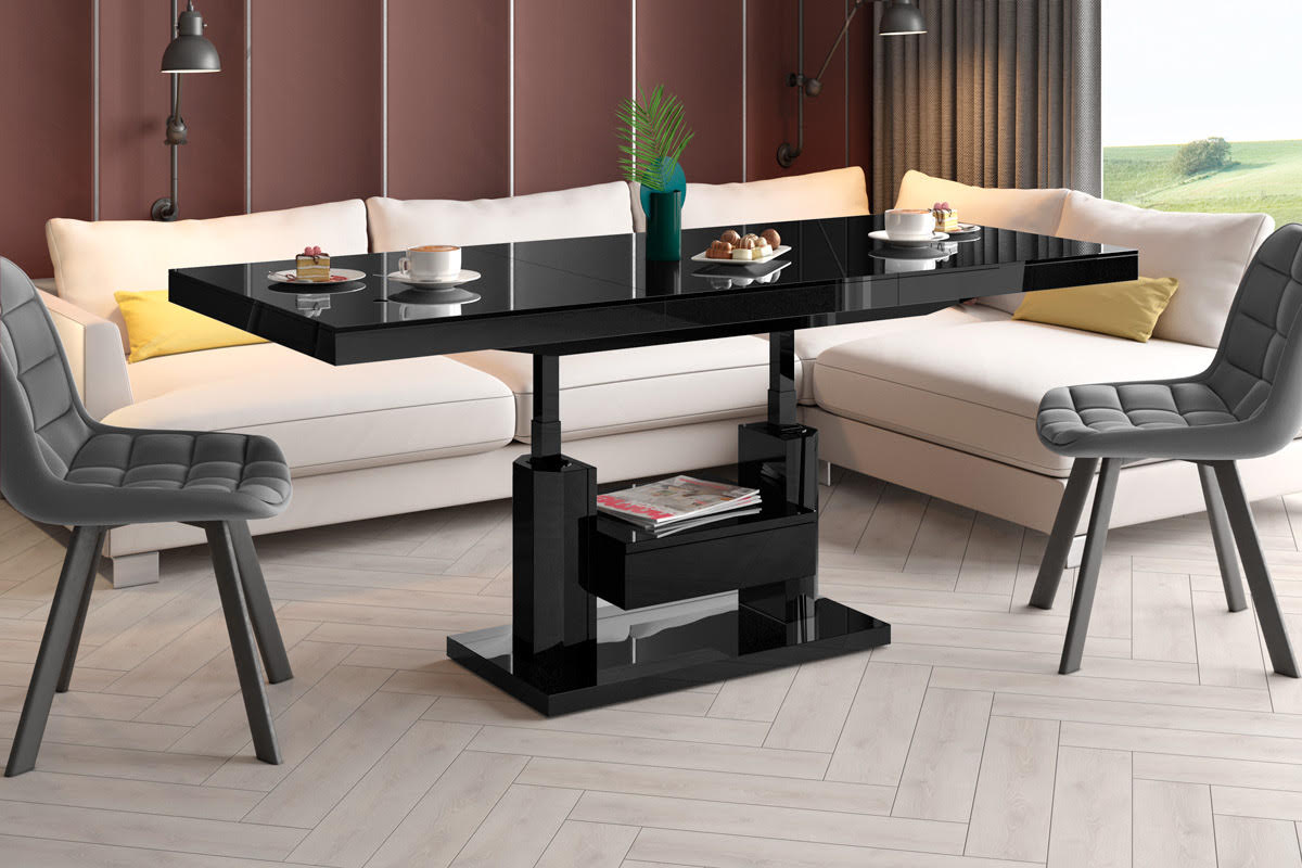 Ławostół Quadro Max to najnowsza propozycja producenta mebli Hubertus. Wychodząc naprzeciw oczekiwaniom klientów, bestsellerowy model  ławostół Quadro Lux – został doposażony w funkcjonalną szufladę i półkę. Ławostół posiada funkcję rozkładania i podnoszenia i w krótkiej chwili może zmienić się z eleganckiego stolika kawowego w pełnowymiarowy stół.