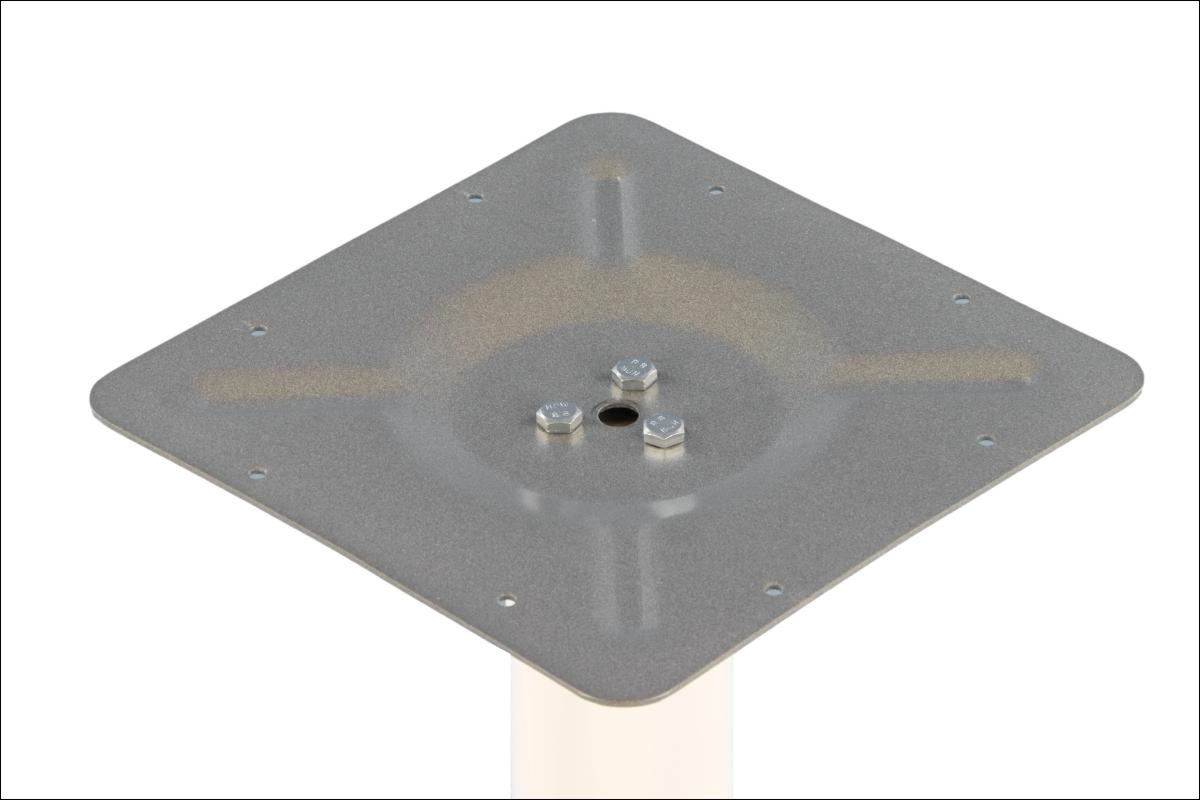 NY-B006 to podstawa stolika wykonana z blachy stalowej tłoczonej malowanej proszkowo. Dolny talerz o średnicy 46 cm wyposażono w regulowane stopki i obciążono żeliwem, dzięki czemu podstawa zyskuje dużą stabilność. Podstawa połączona jest nogą z górnym elementem (o wymiarach 24x24 cm), przeznaczonym do montażu blatu.