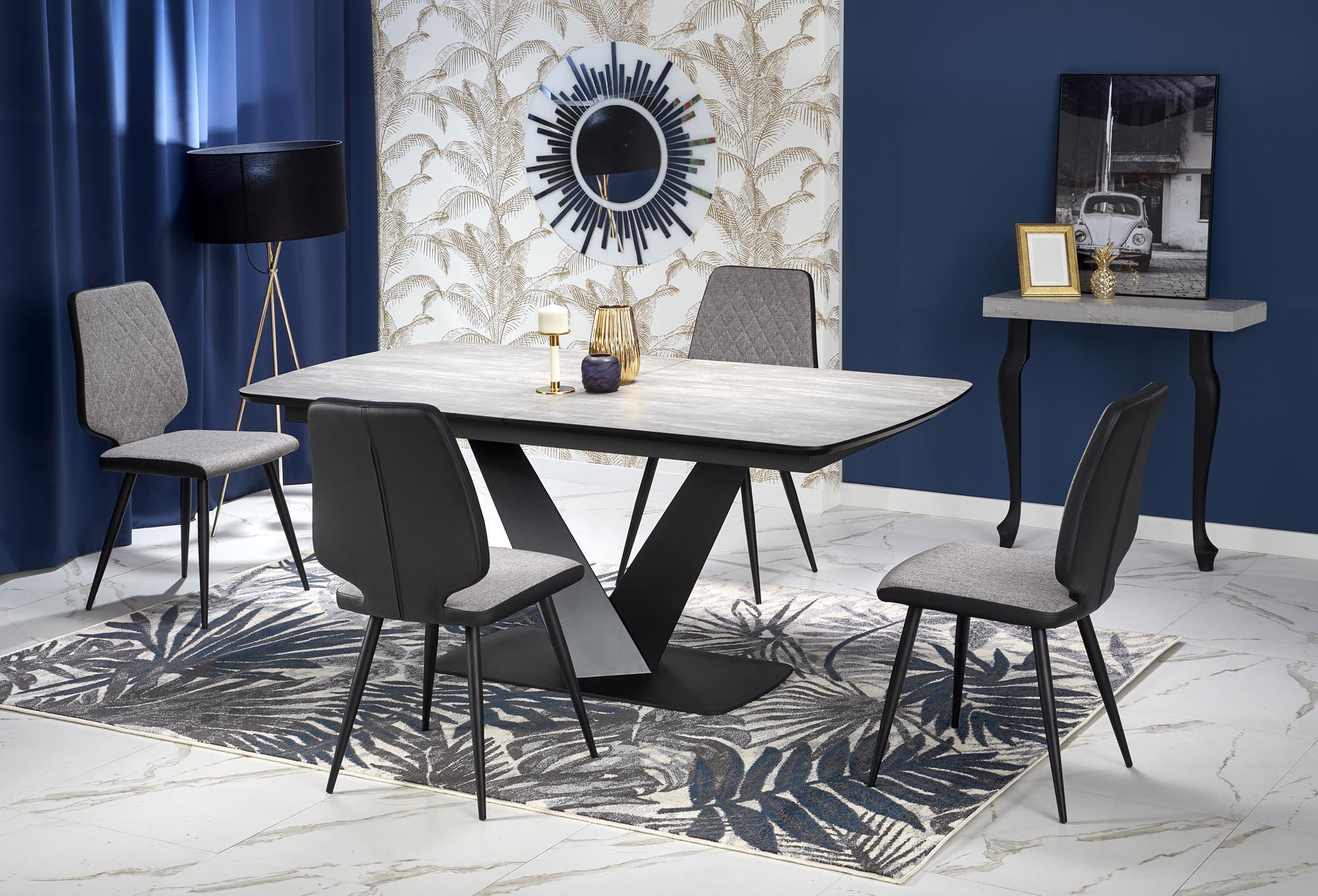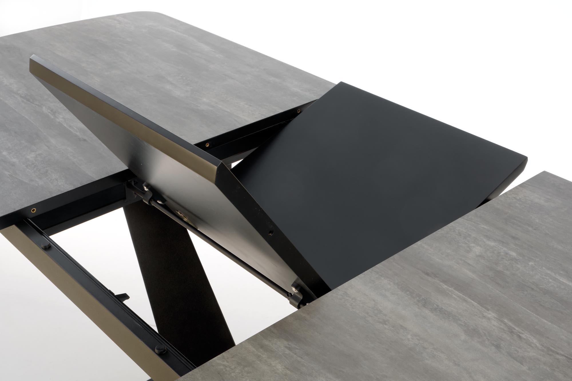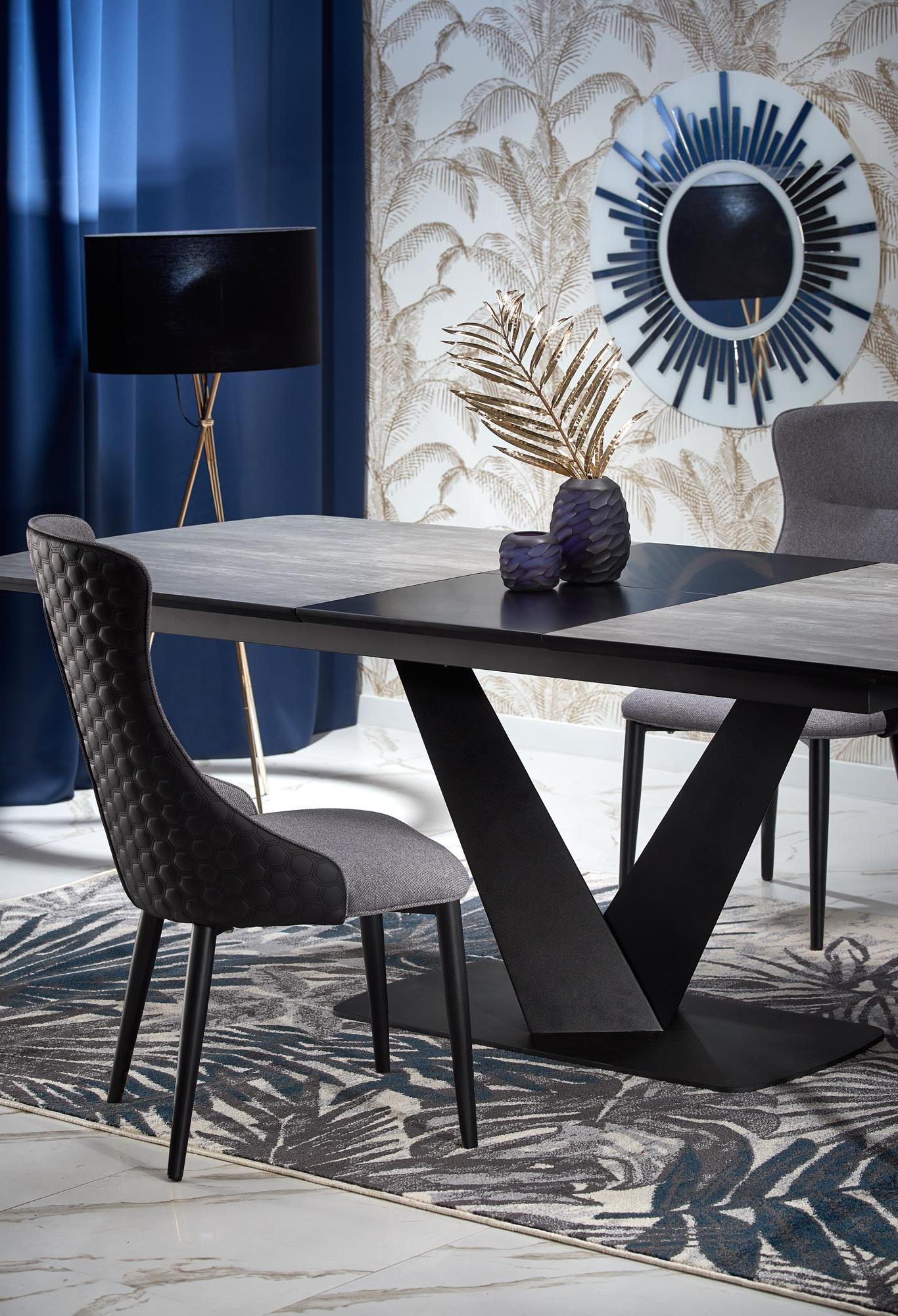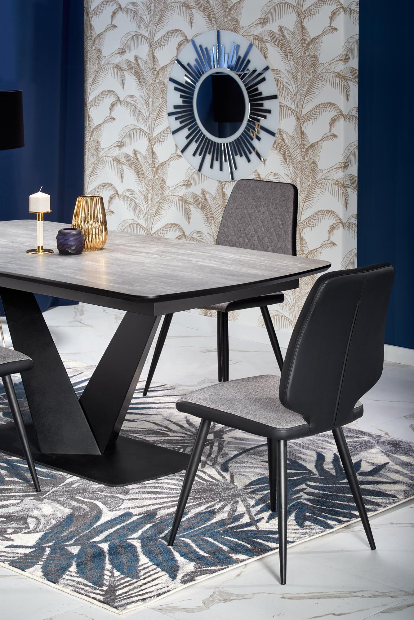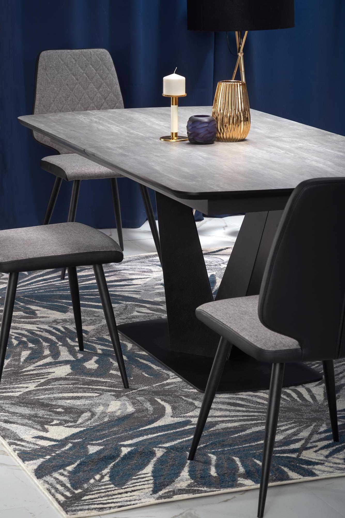 Stół wykonano z materiału: MDF lakierowany + płyta HPL / stal malowana proszkowo, kolor blat - ciemny popiel / czarny, nogi - czarny
