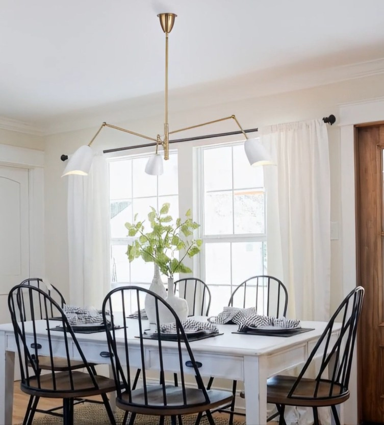 Żyrandol charakteryzuje się nowoczesnym, industrialnym stylem z elementami mid-century modern.