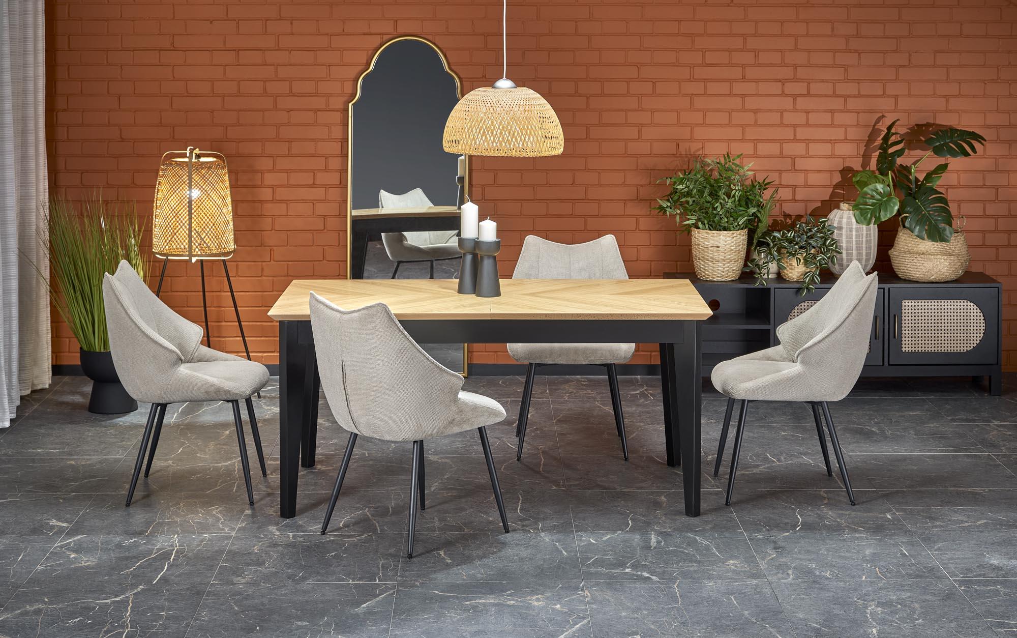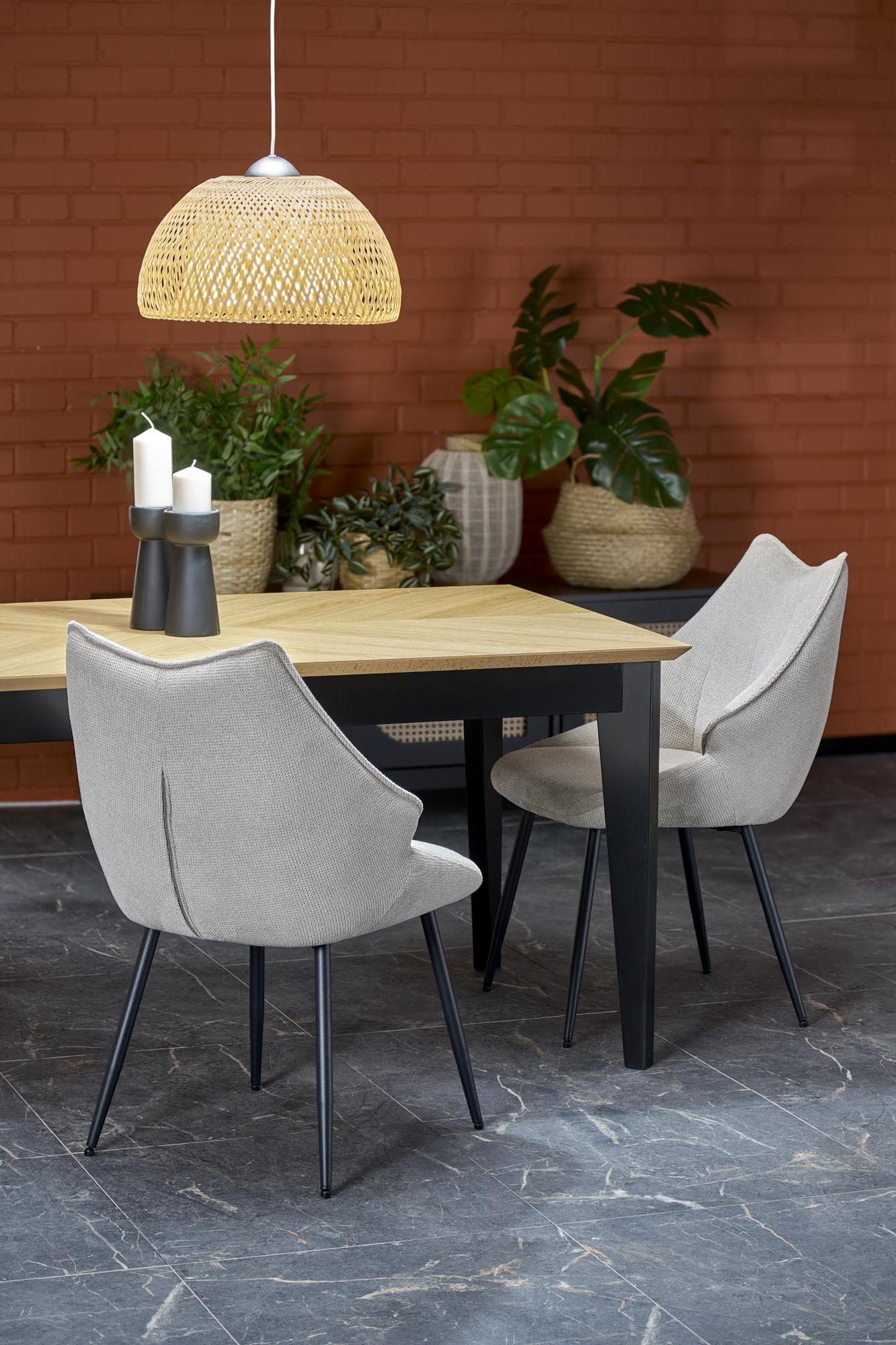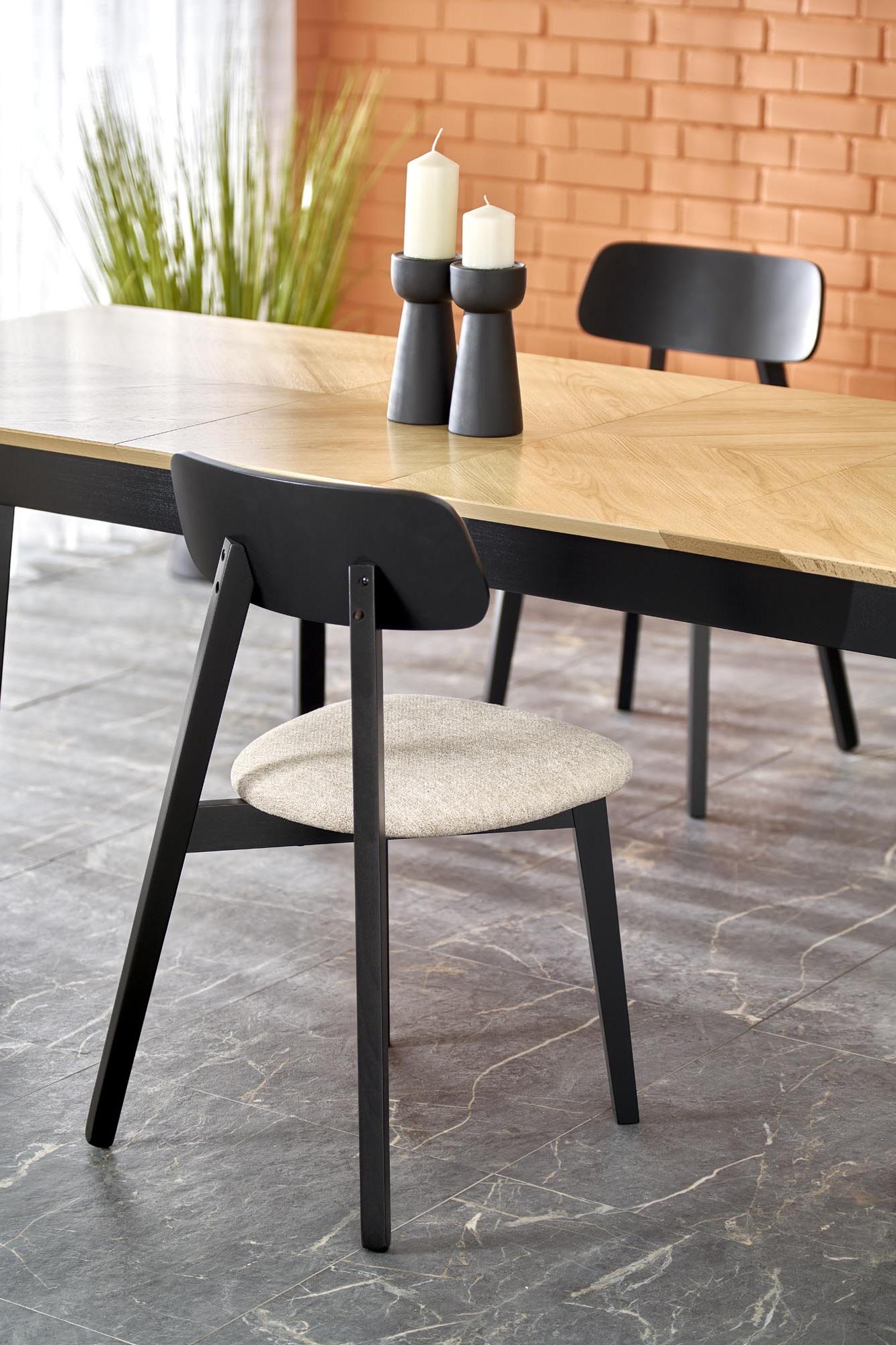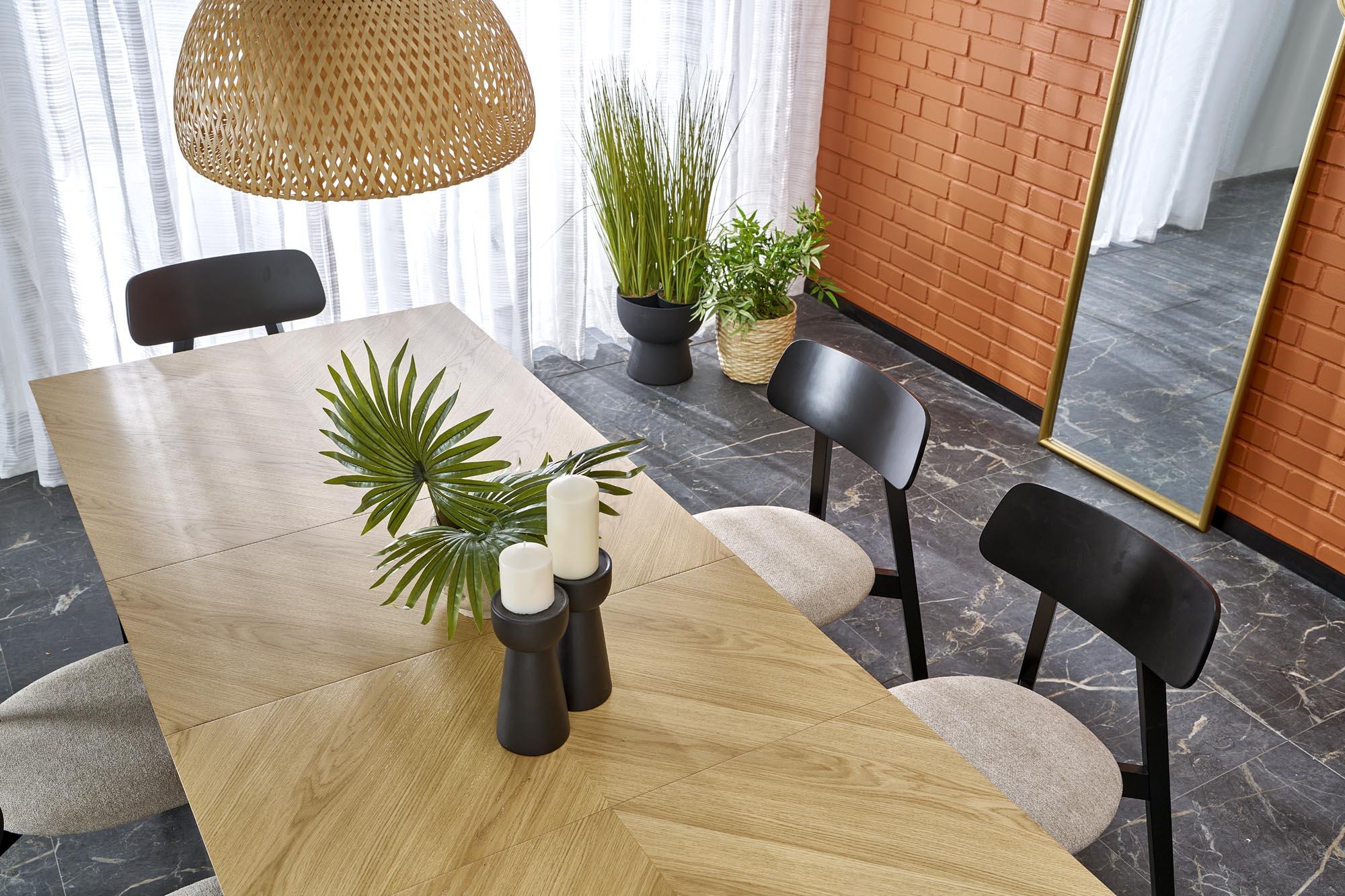 Stół wykonano z materiału: płyta meblowa + okleina naturalana - dębowa / drewno lite - bukowe, kolor blat - naturalny, nogi - czarny