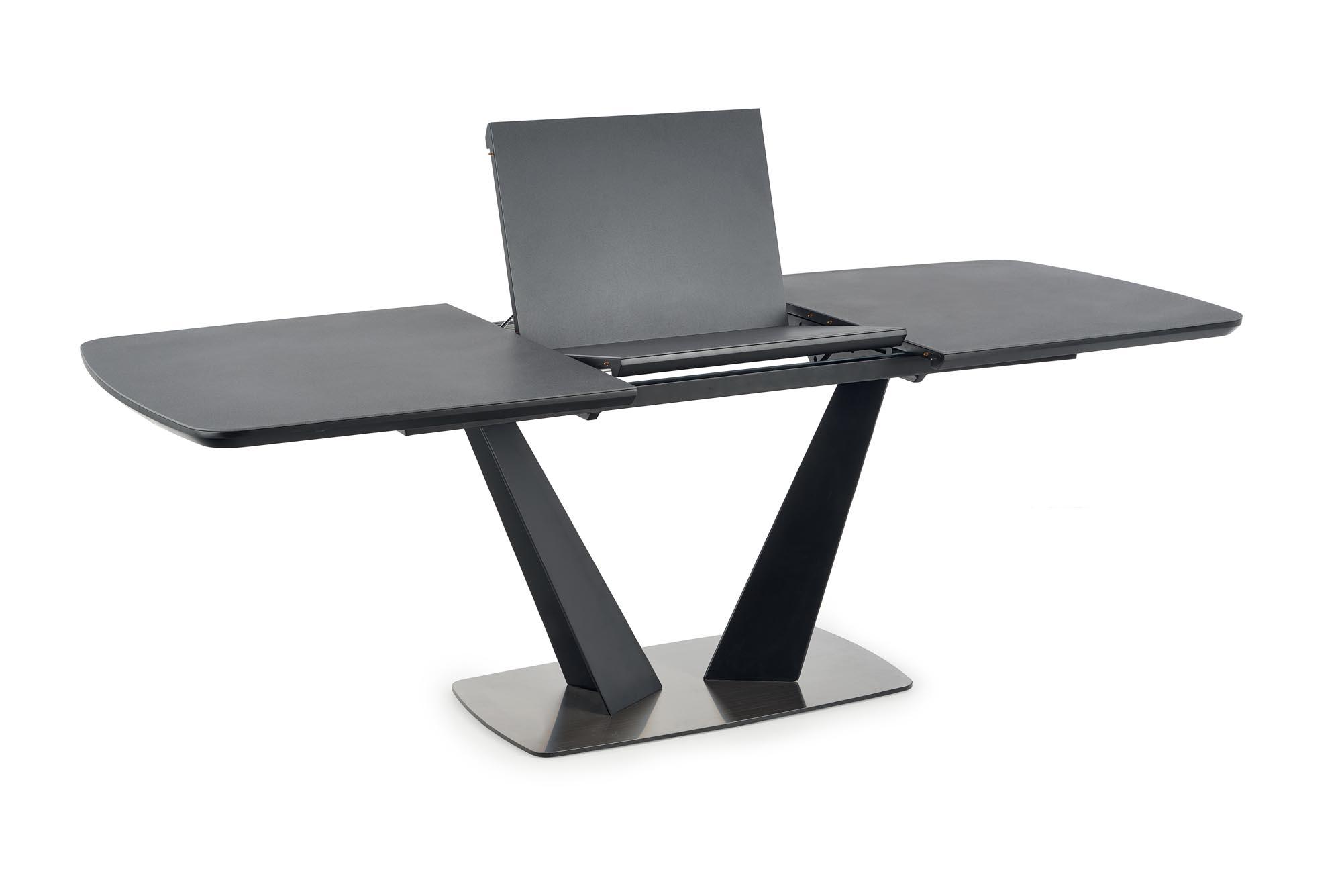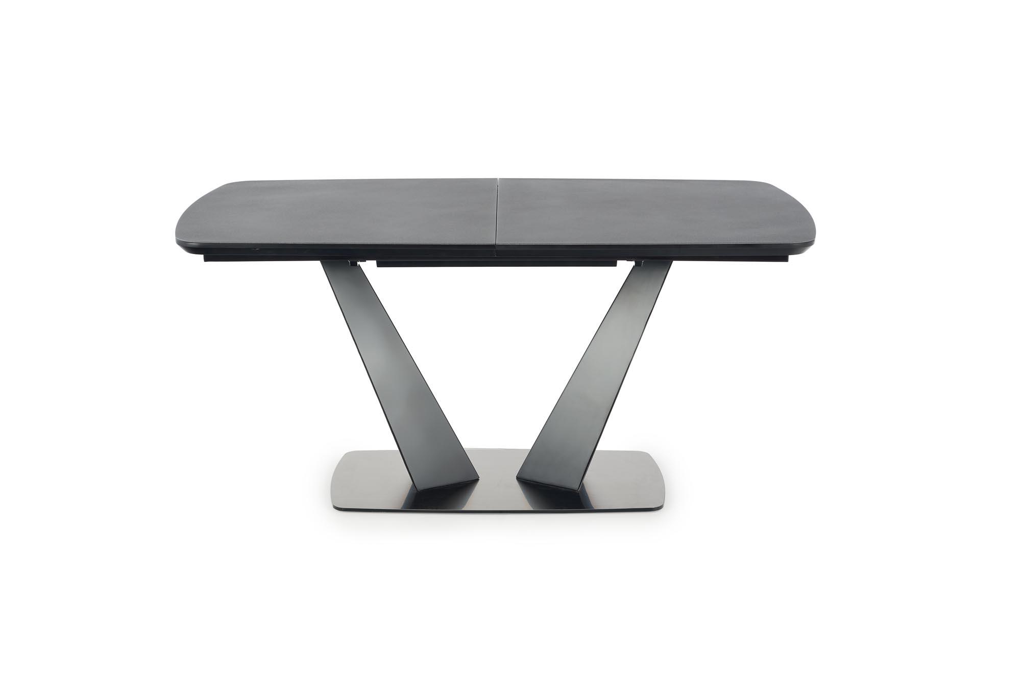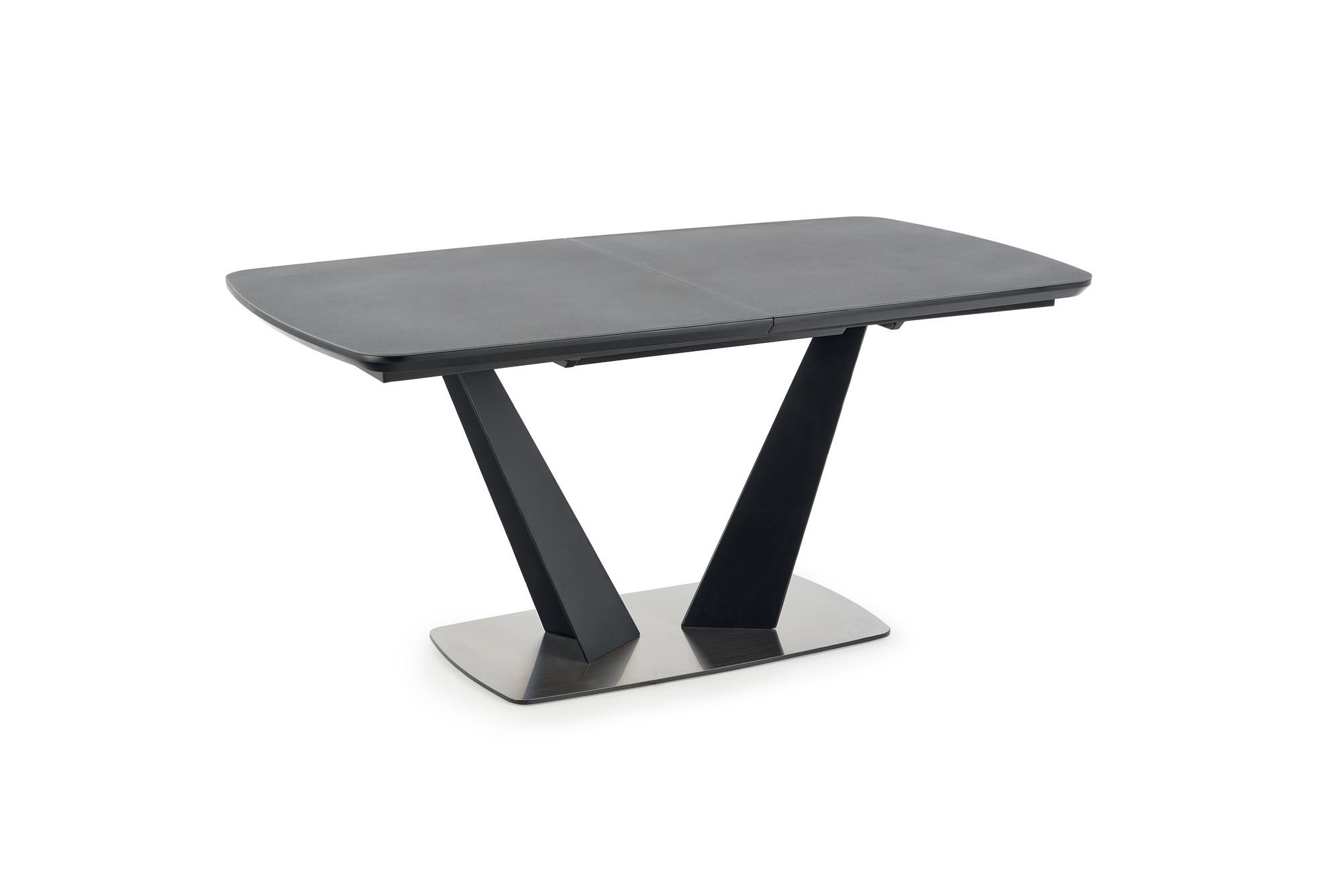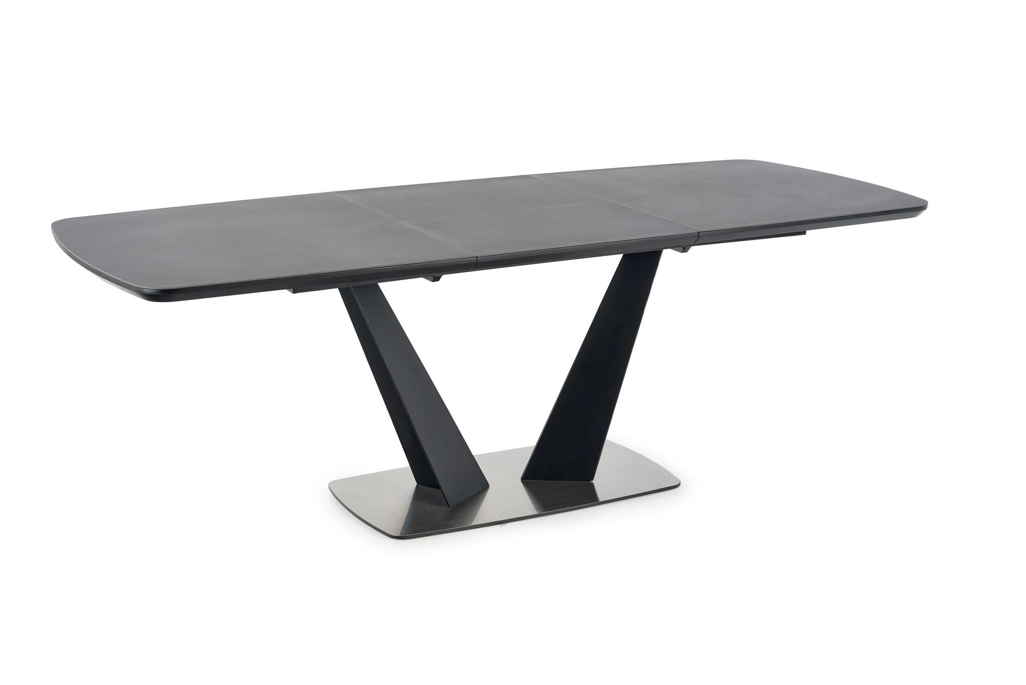Stół wykonano z materiału: szkło / MDF lakierowany / stal malowana proszkowo / stal nierdzewna, kolor blat - ciemny popiel, nogi - czarny