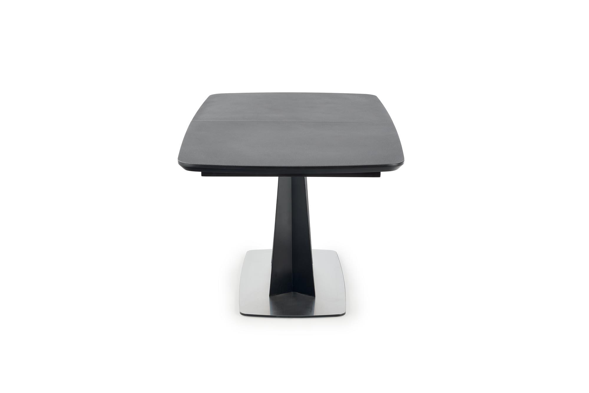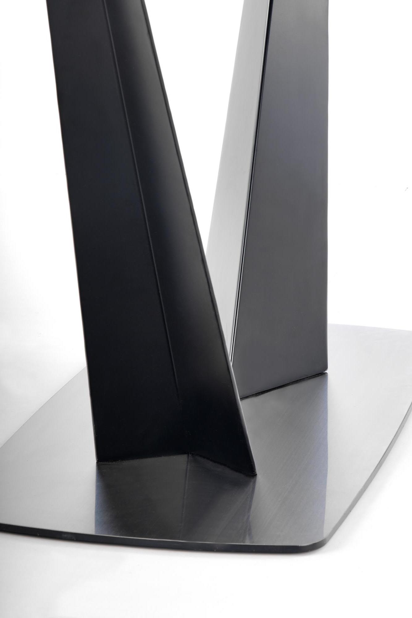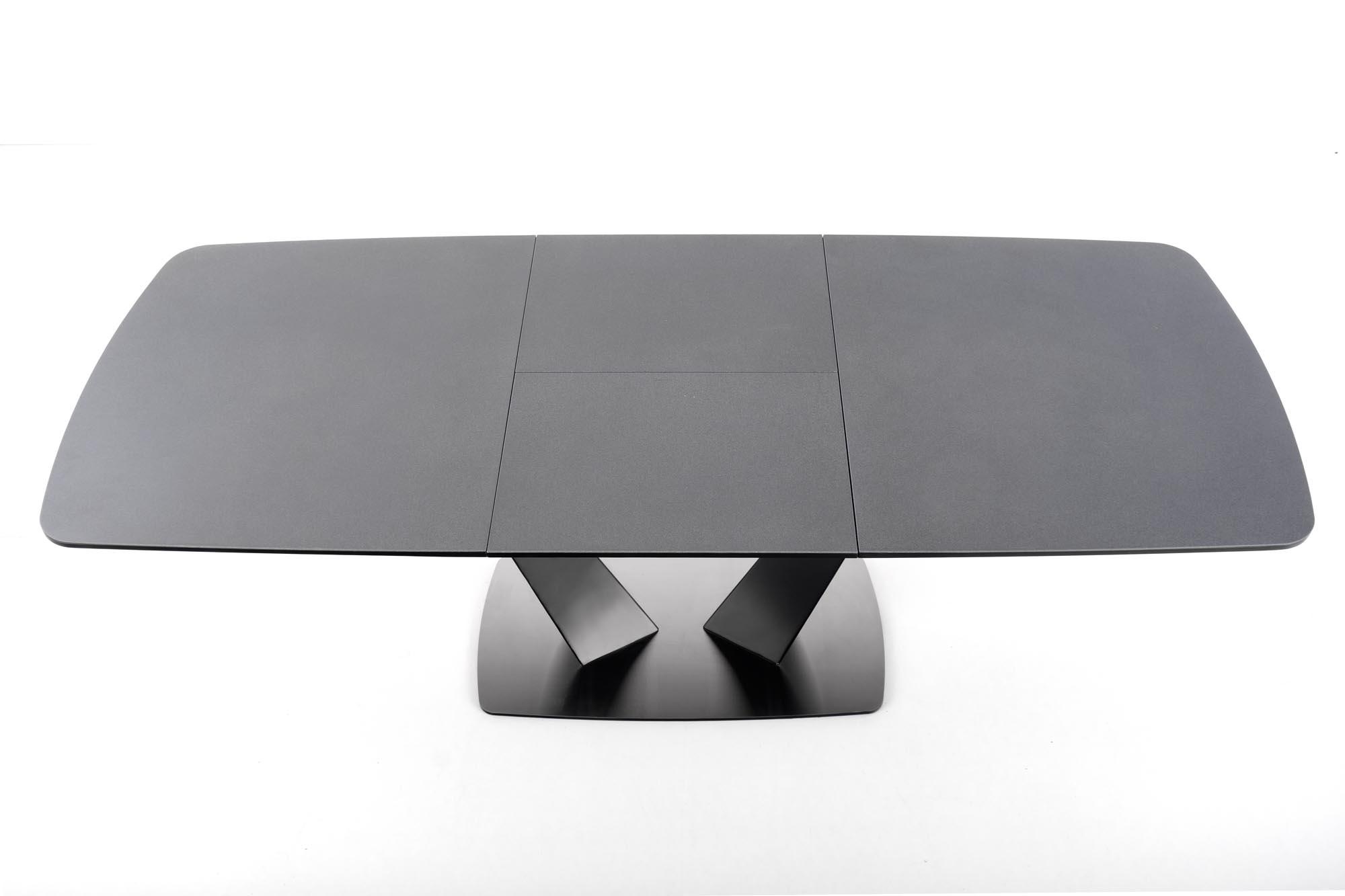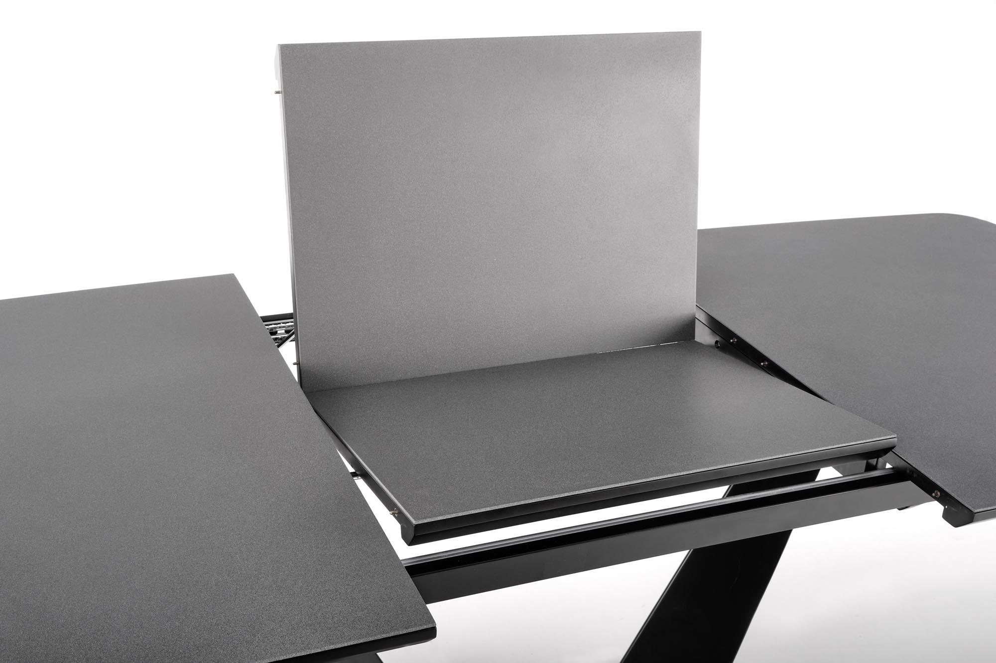 Stół wykonano z materiału: szkło / MDF lakierowany / stal malowana proszkowo / stal nierdzewna, kolor blat - ciemny popiel, nogi - czarny