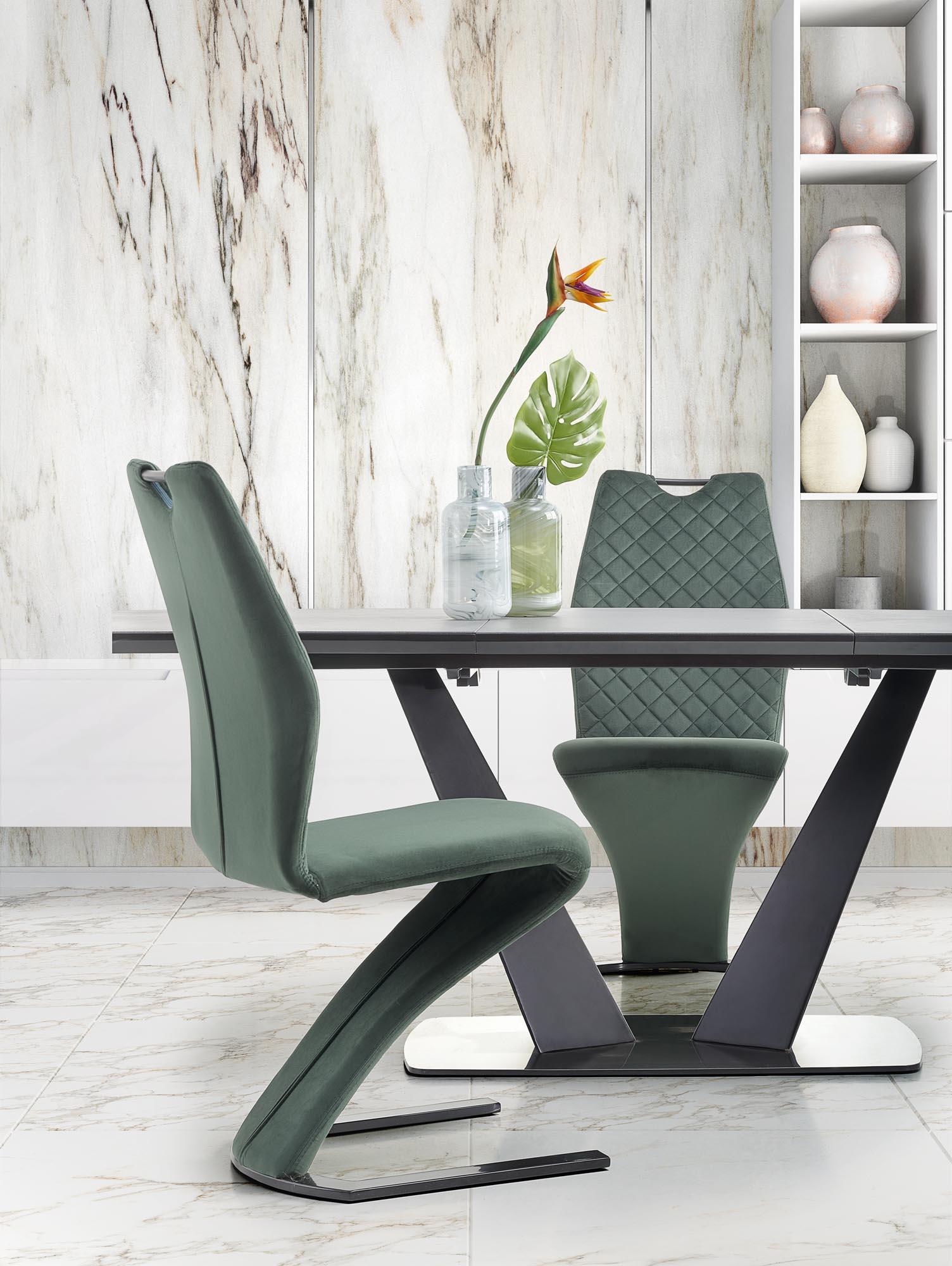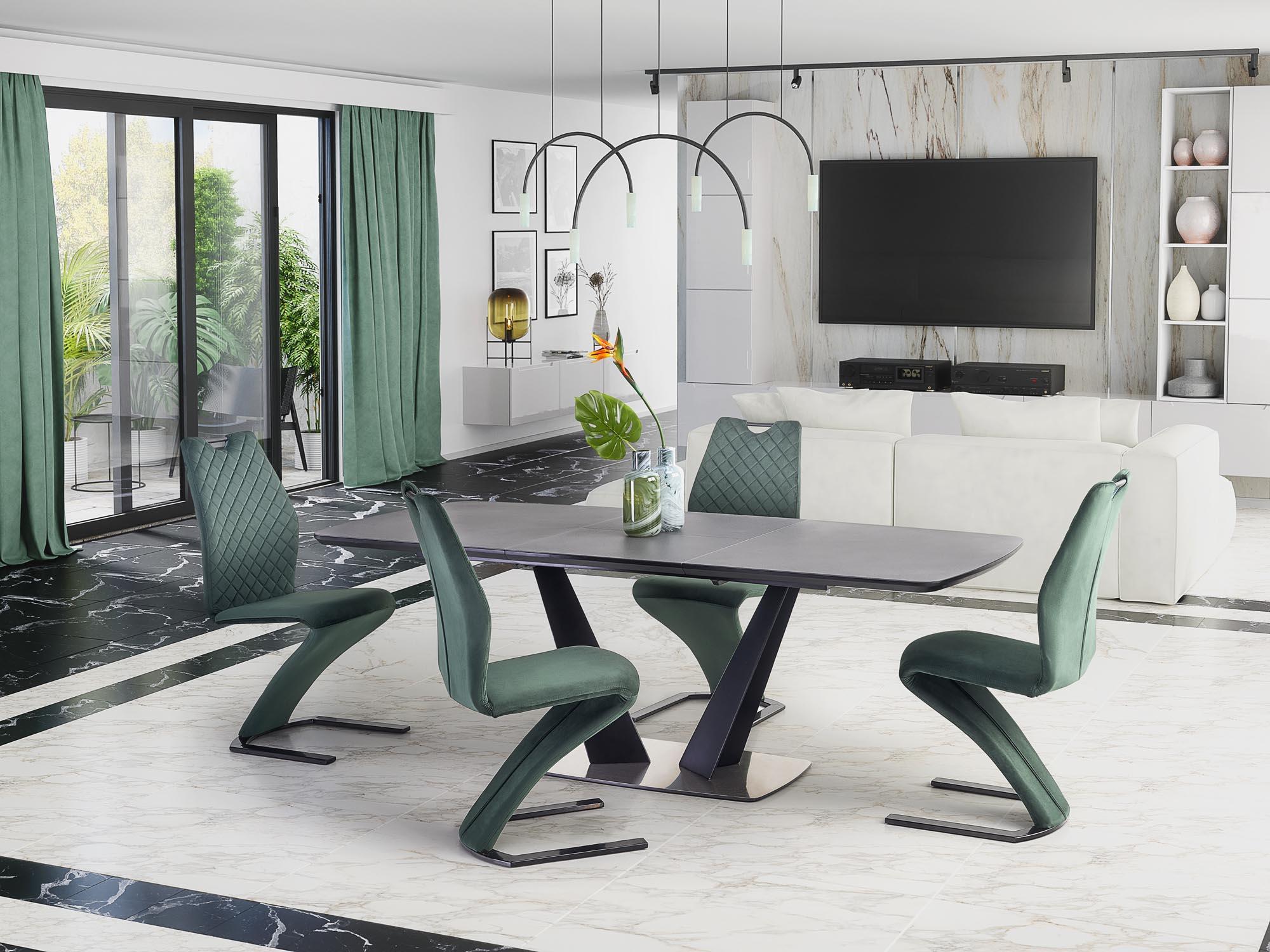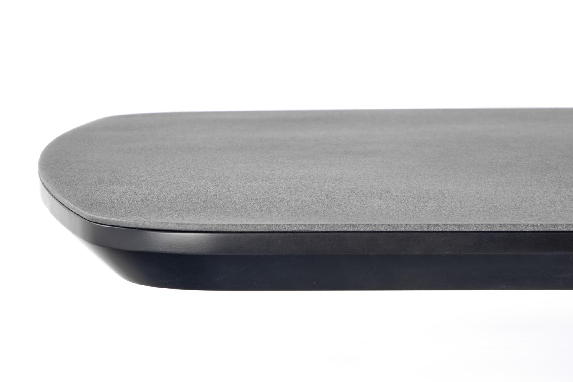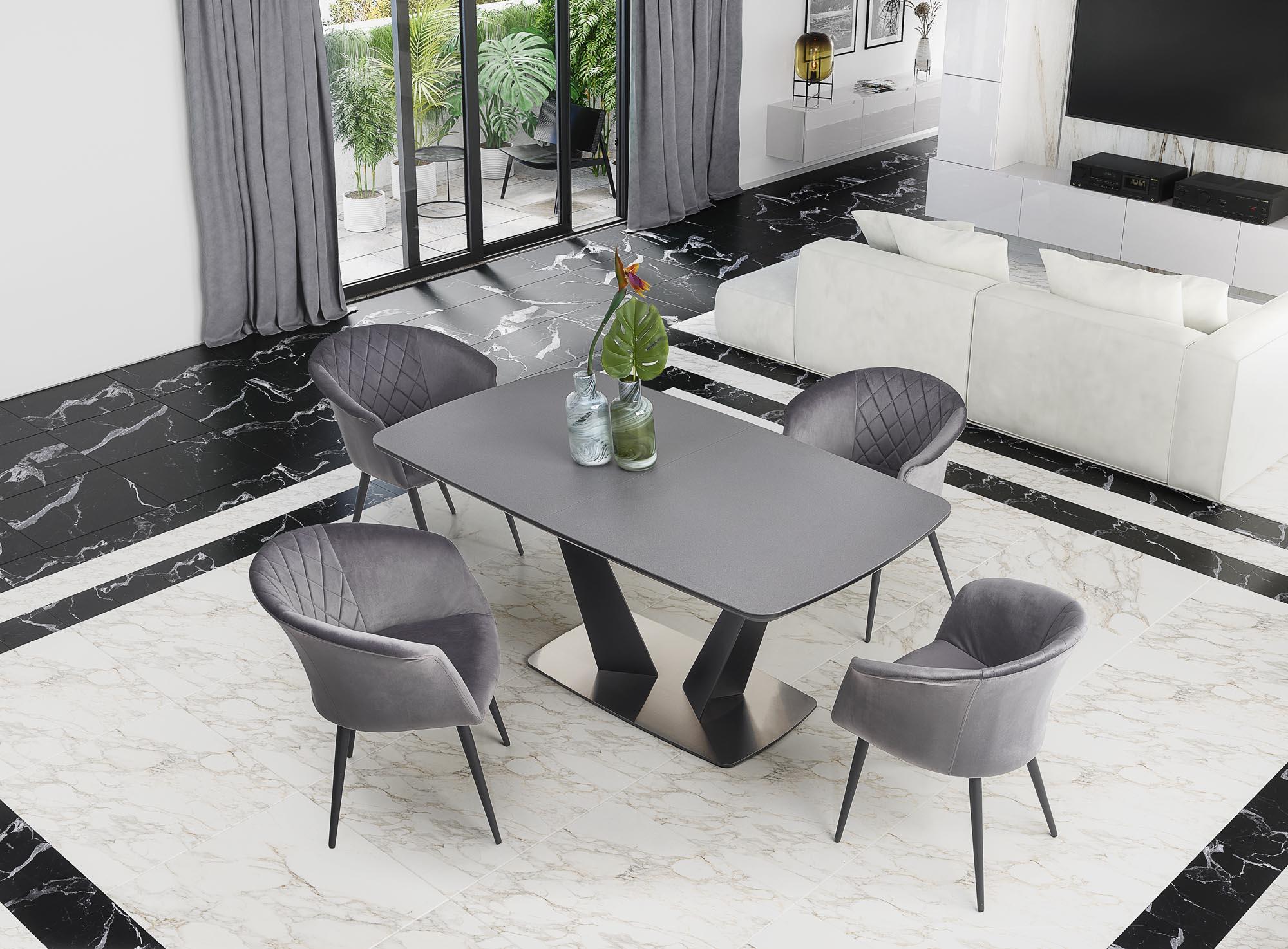 Stół wykonano z materiału: szkło / MDF lakierowany / stal malowana proszkowo / stal nierdzewna, kolor blat - ciemny popiel, nogi - czarny