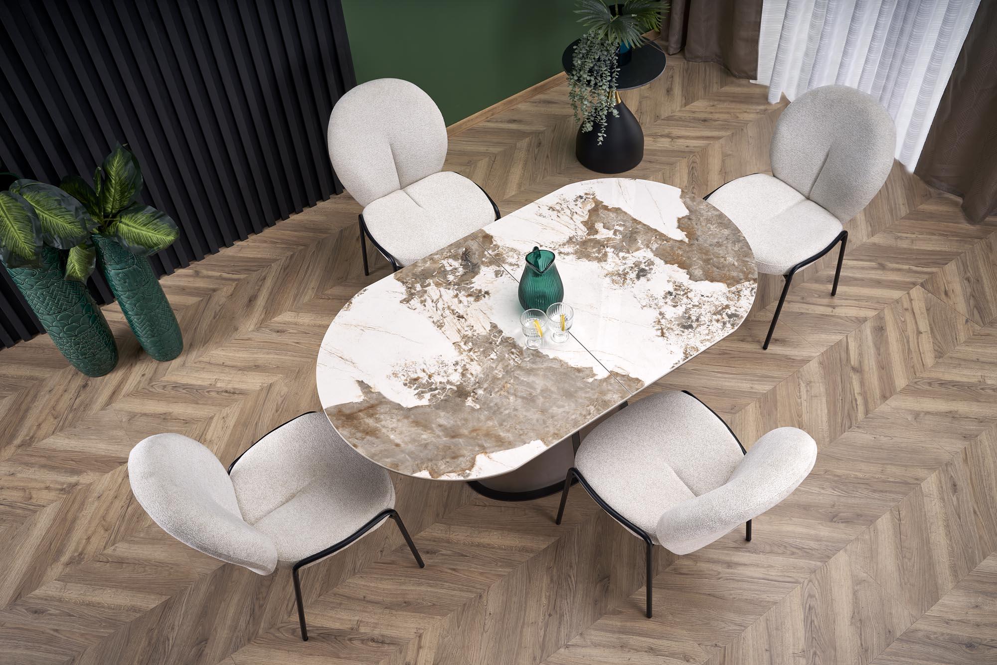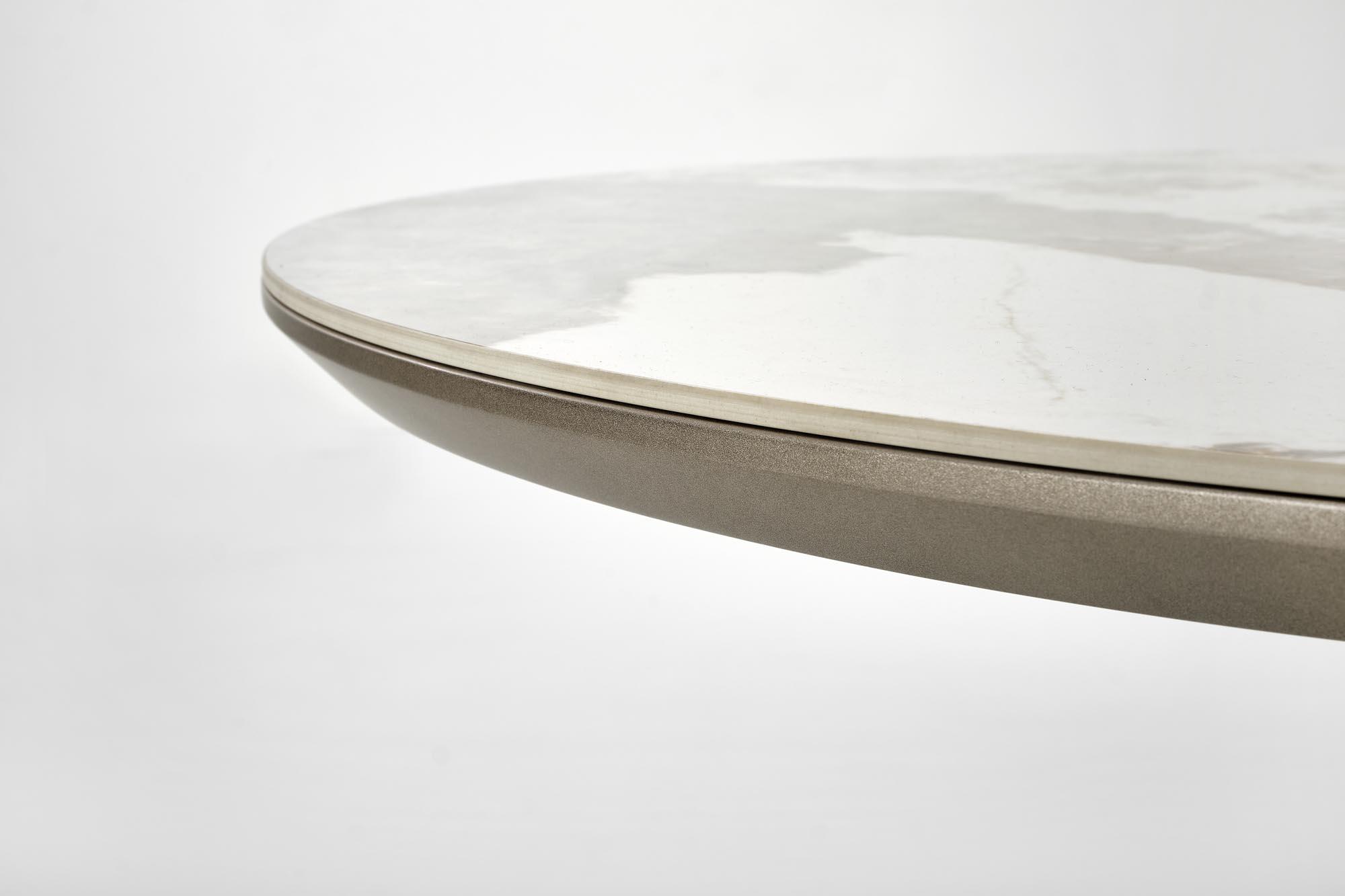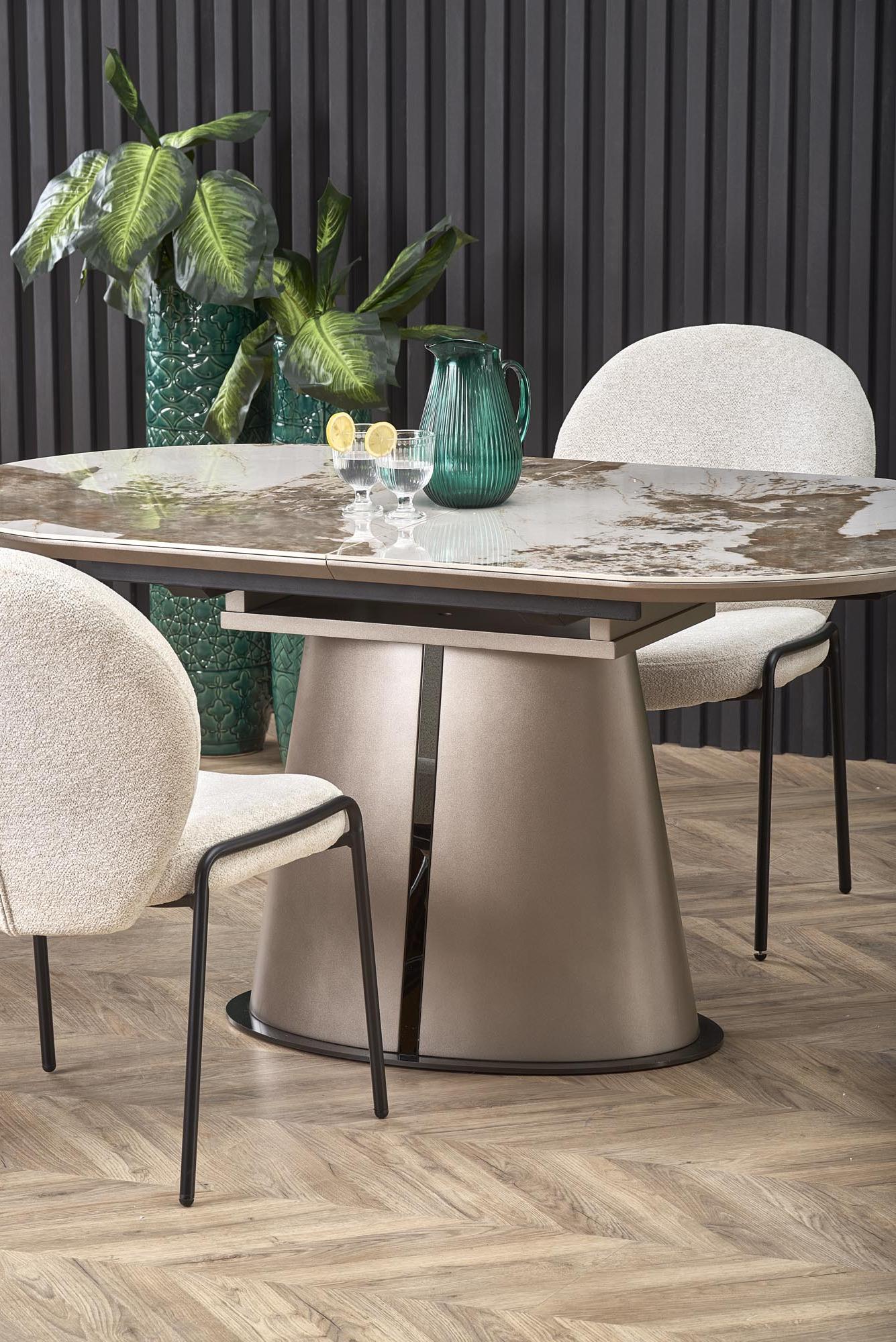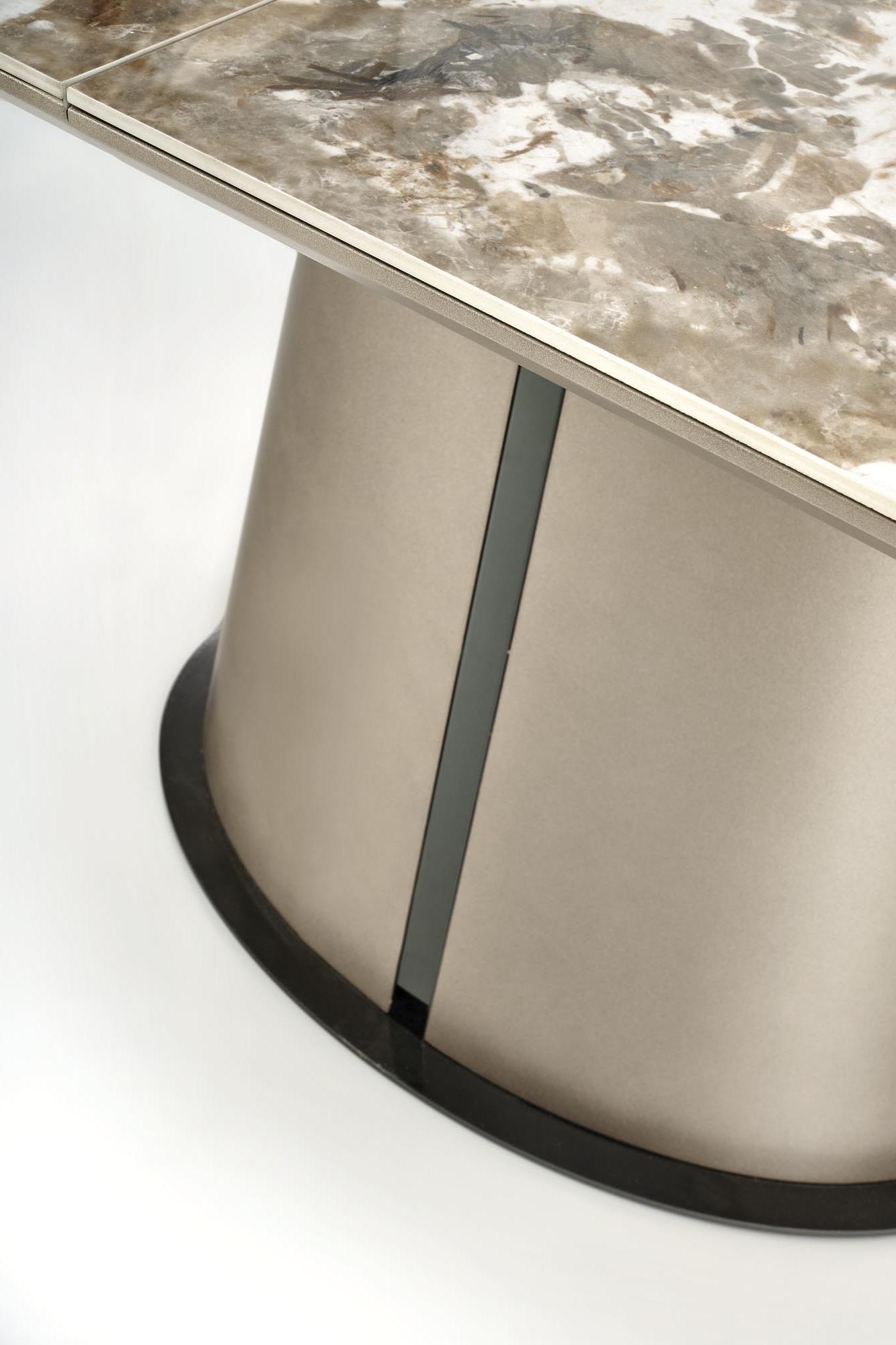 Stół wykonano z materiału: ceramika / MDF lakierowany / stal malowana proszkowo, kolor blat - beżowy marmur / cappuccino, noga - cappuccino - czarny