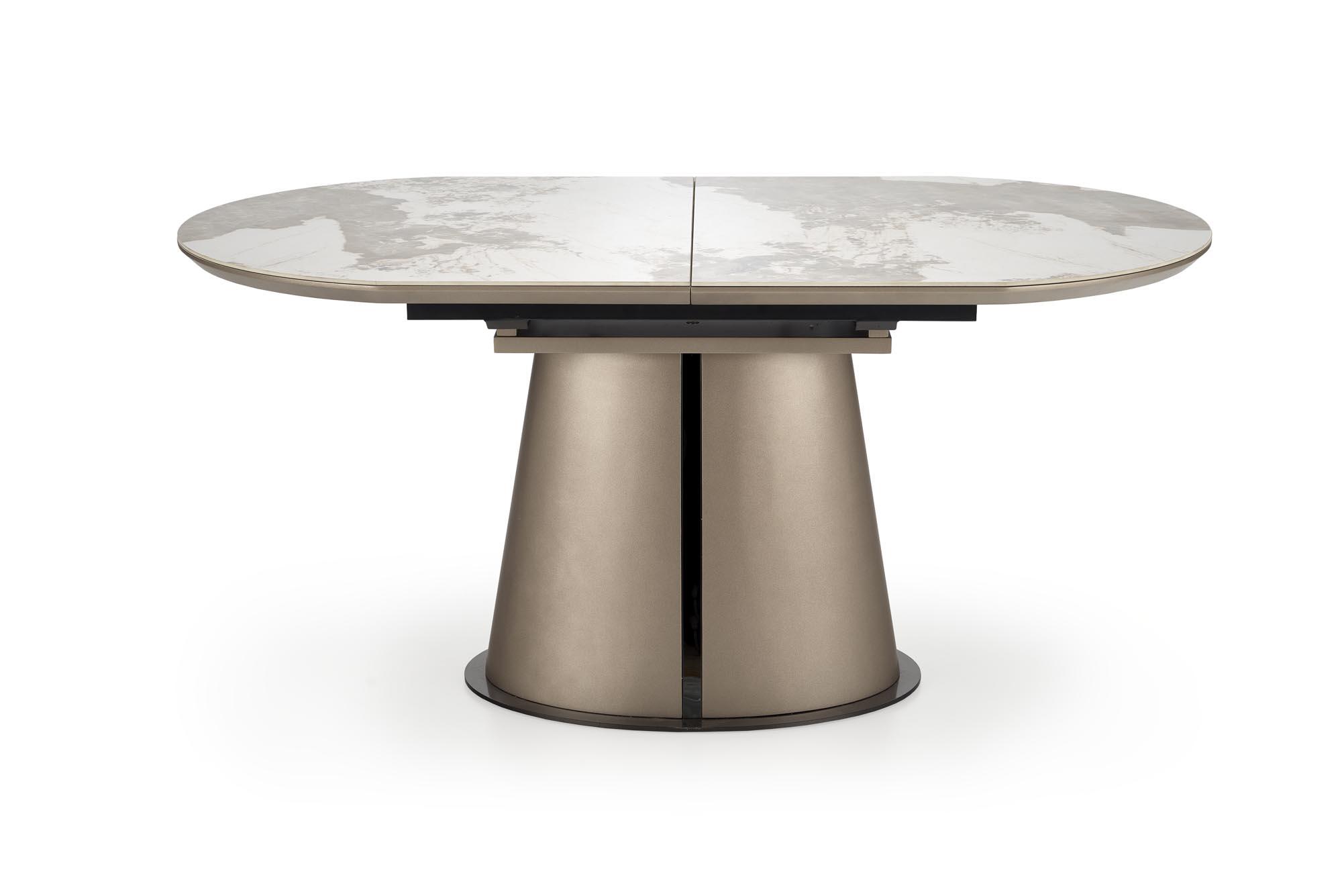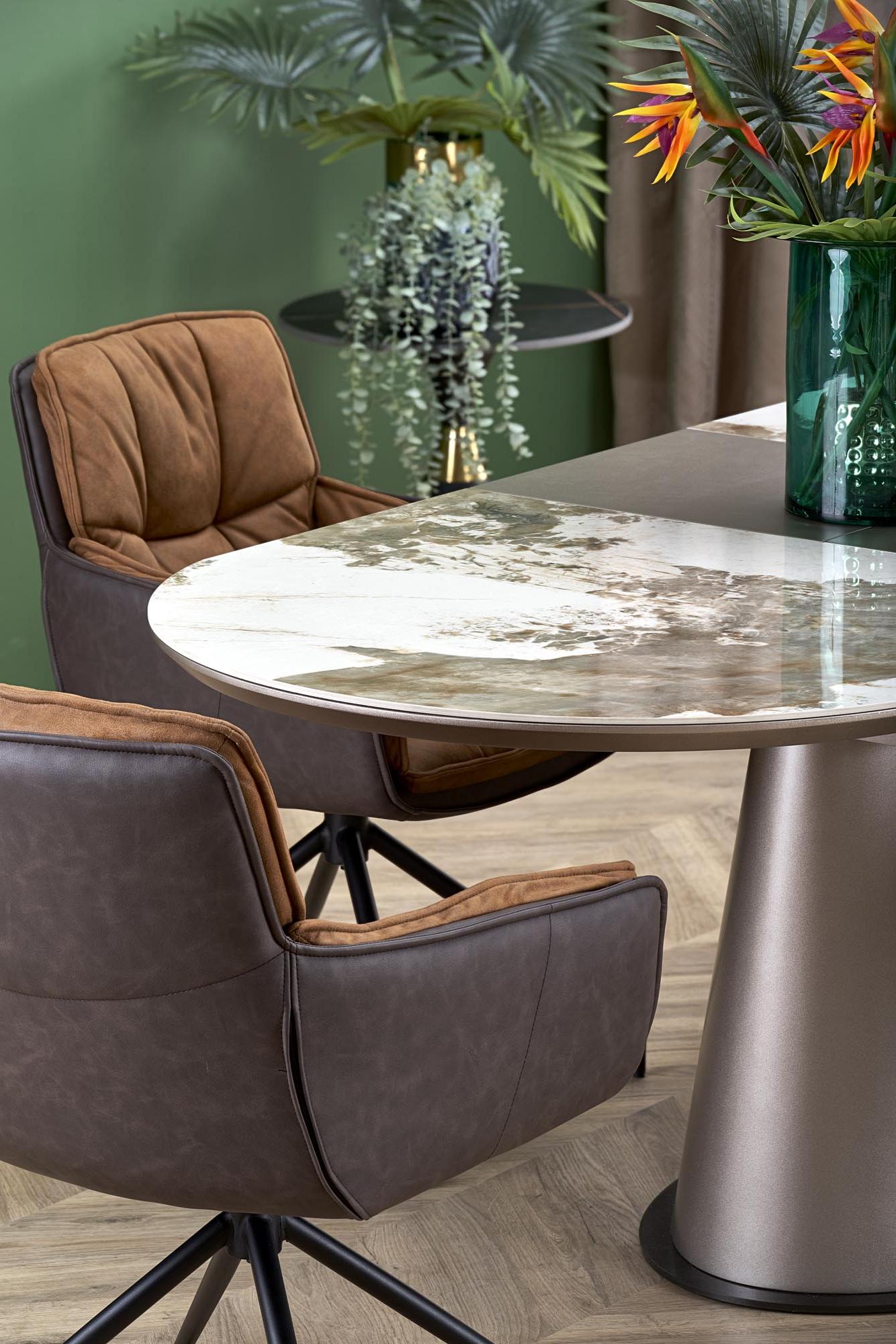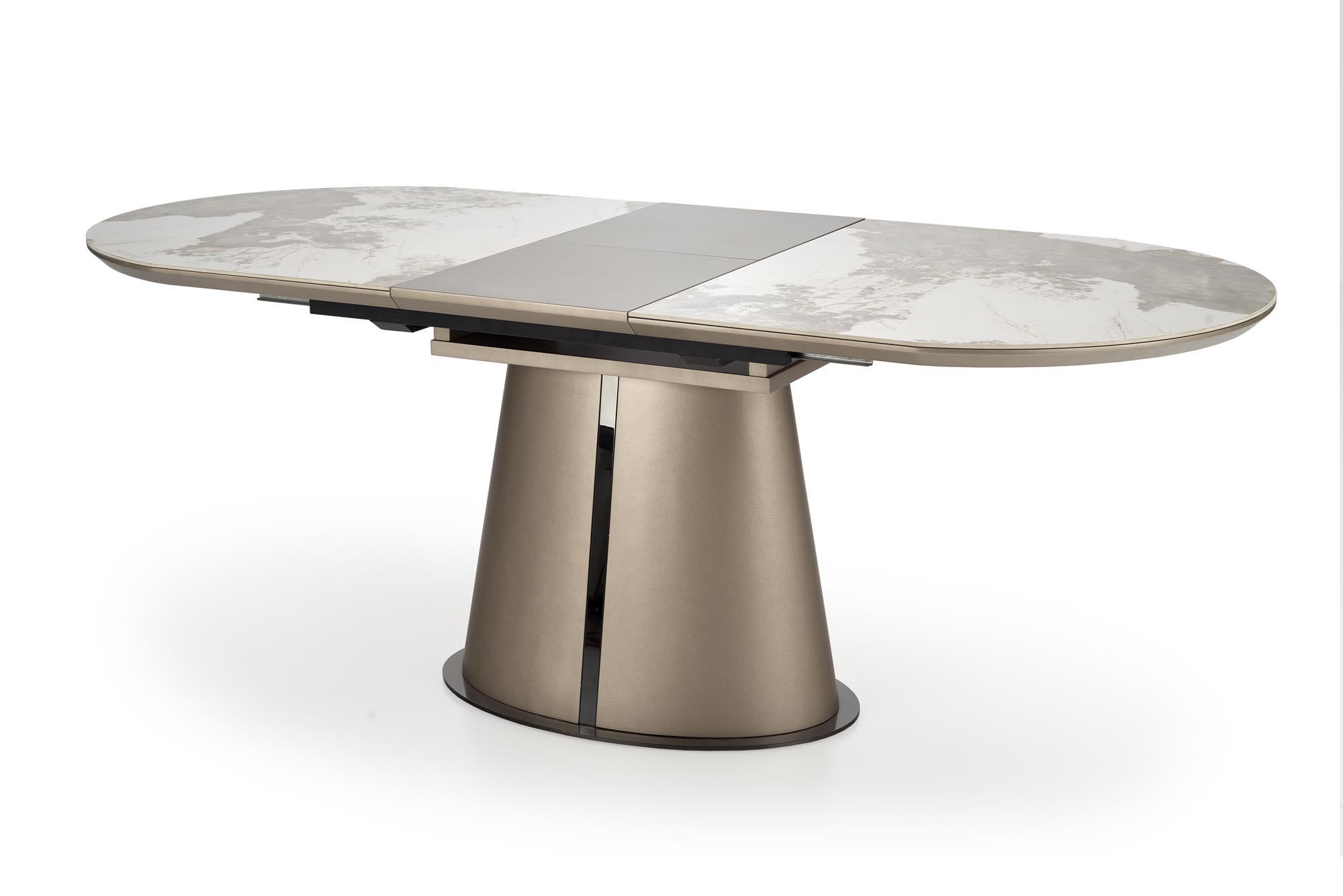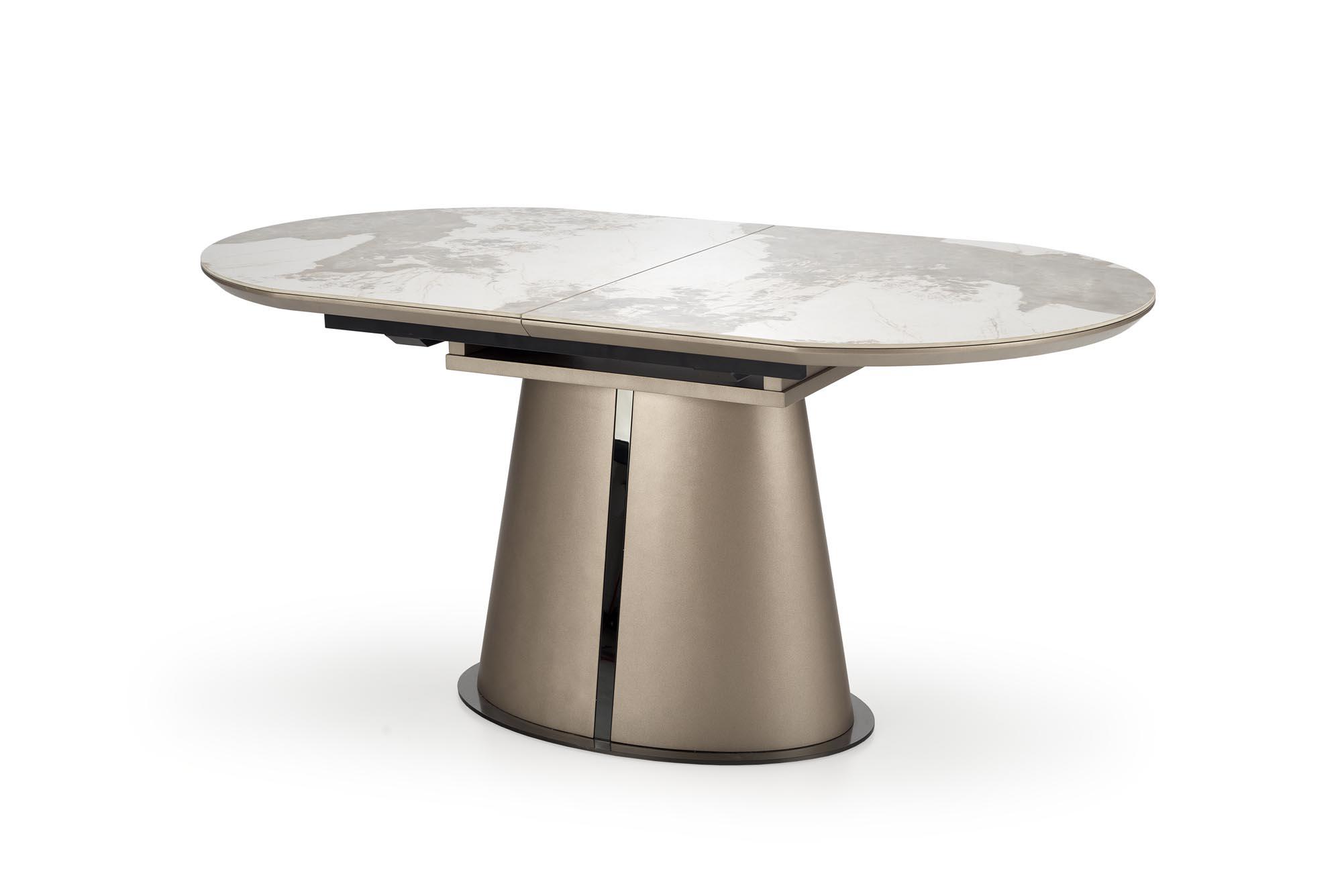 Stół wykonano z materiału: ceramika / MDF lakierowany / stal malowana proszkowo, kolor blat - beżowy marmur / cappuccino, noga - cappuccino - czarny