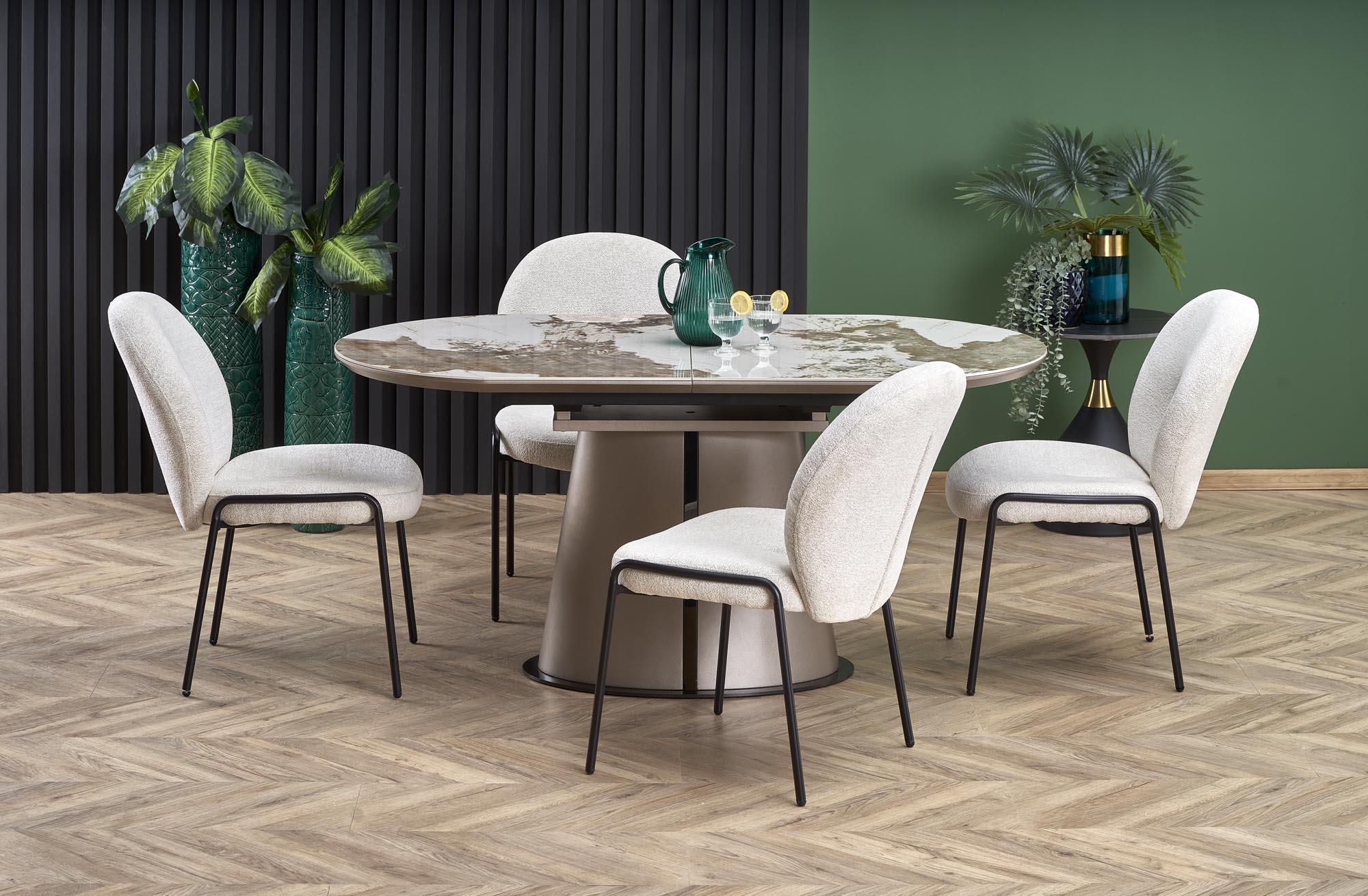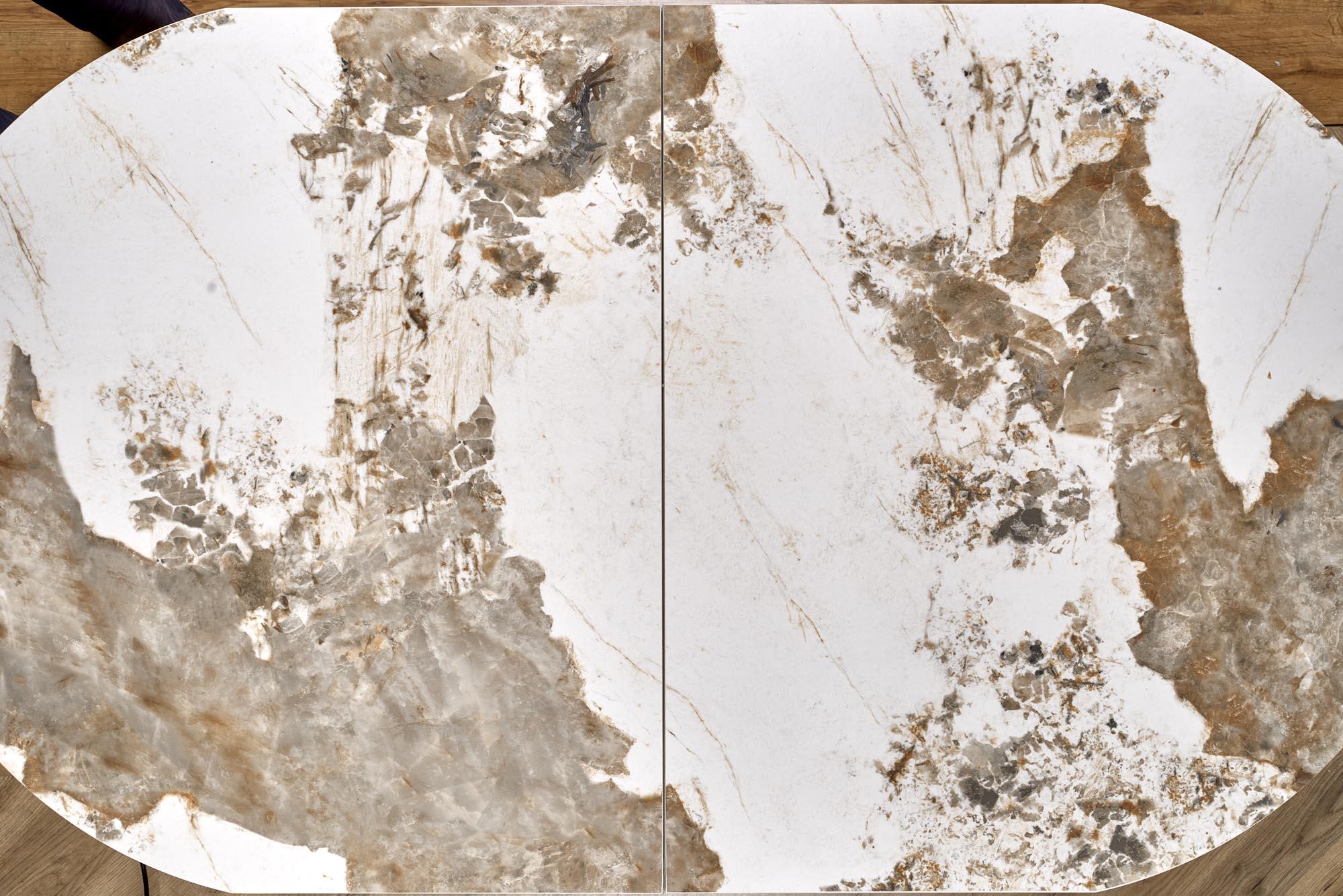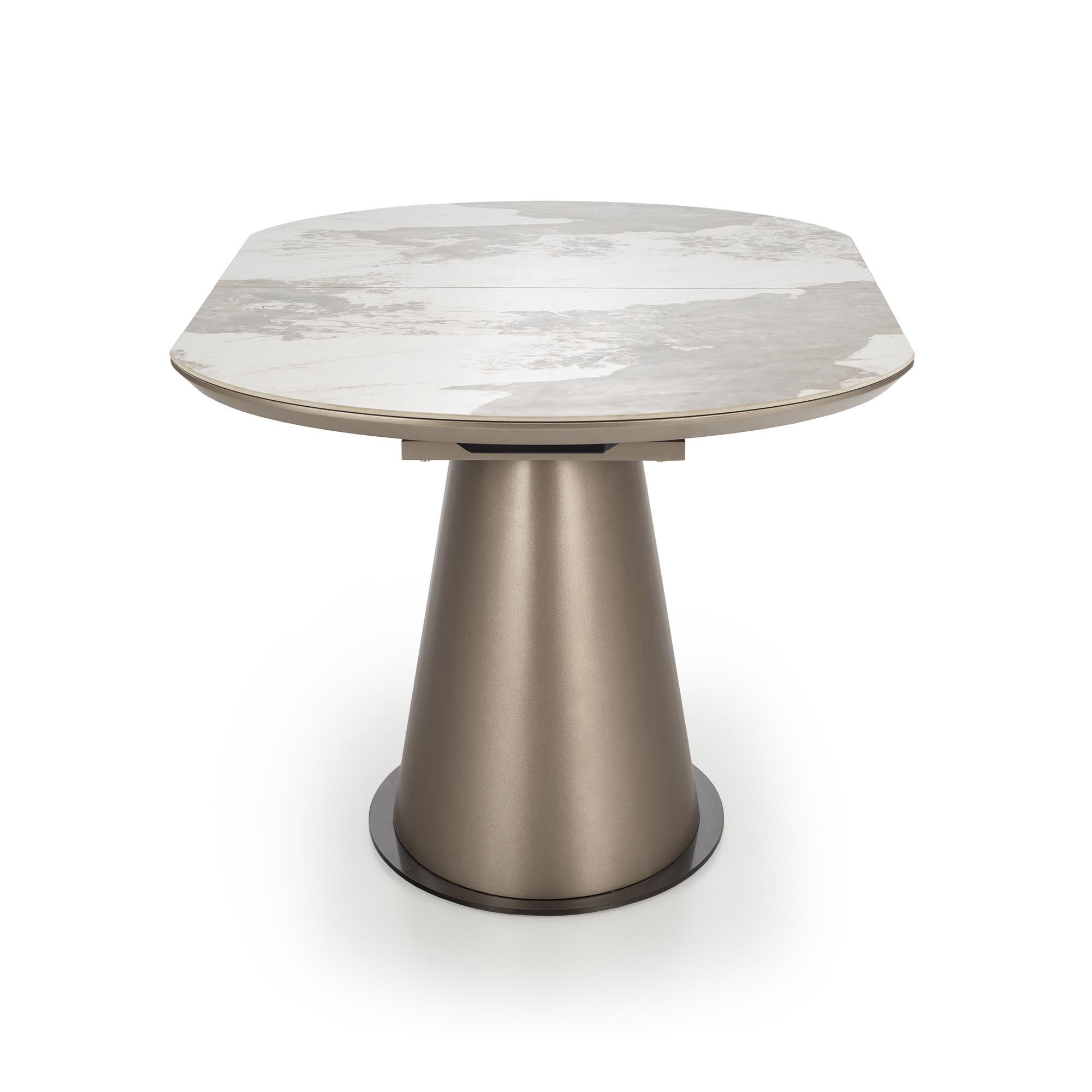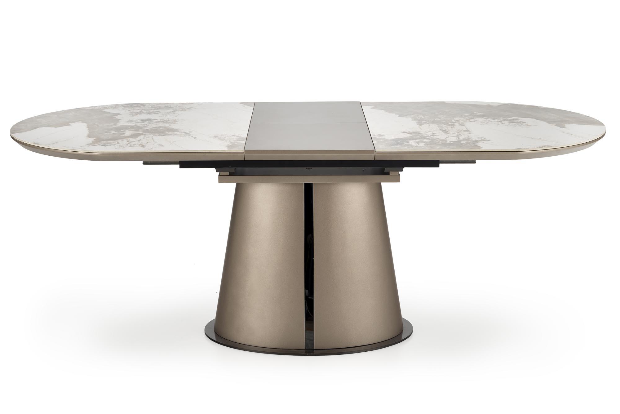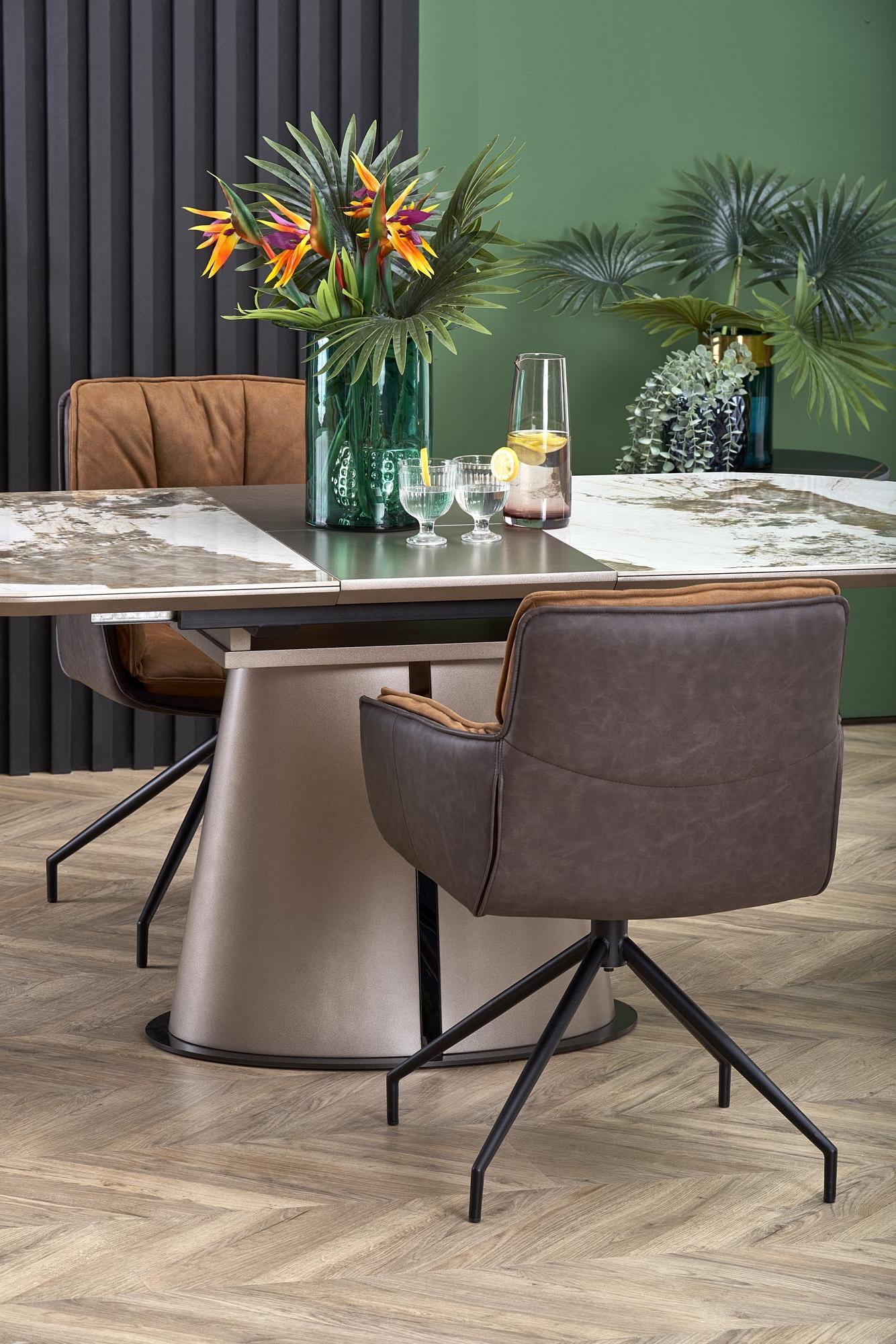 Stół wykonano z materiału: ceramika / MDF lakierowany / stal malowana proszkowo, kolor blat - beżowy marmur / cappuccino, noga - cappuccino - czarny