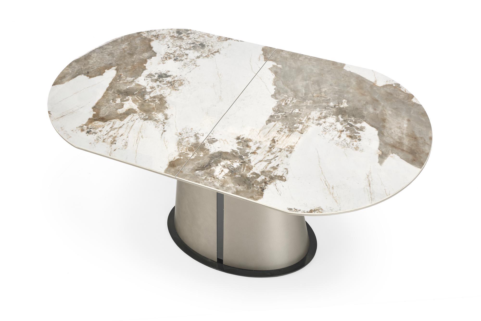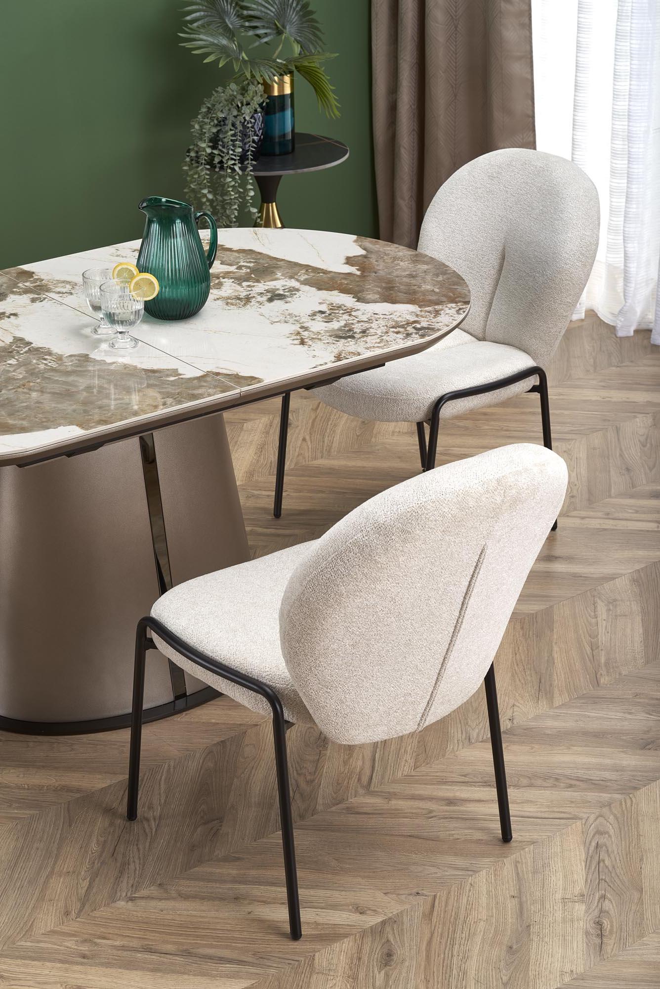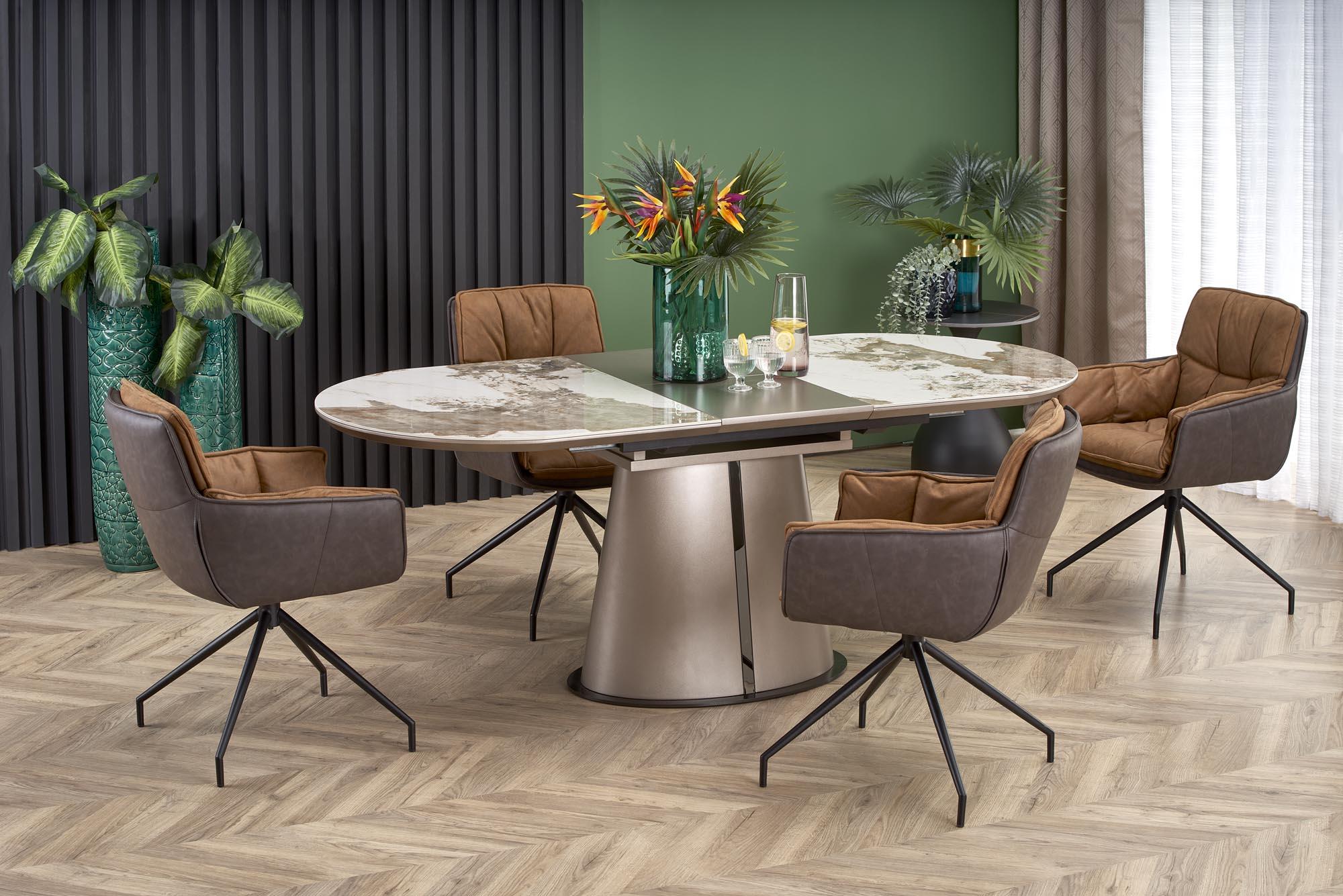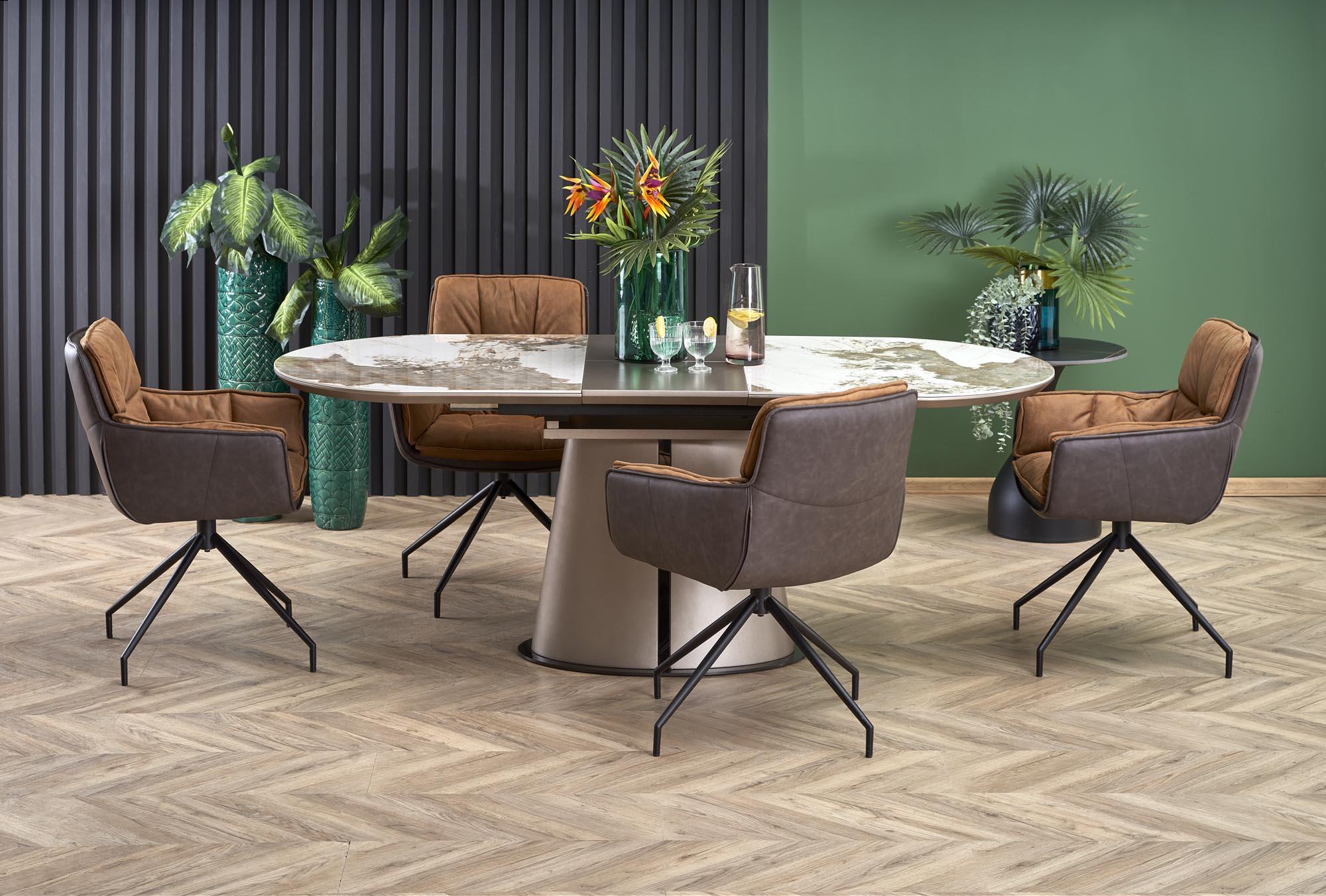 Stół wykonano z materiału: ceramika / MDF lakierowany / stal malowana proszkowo, kolor blat - beżowy marmur / cappuccino, noga - cappuccino - czarny