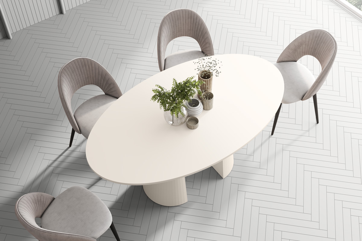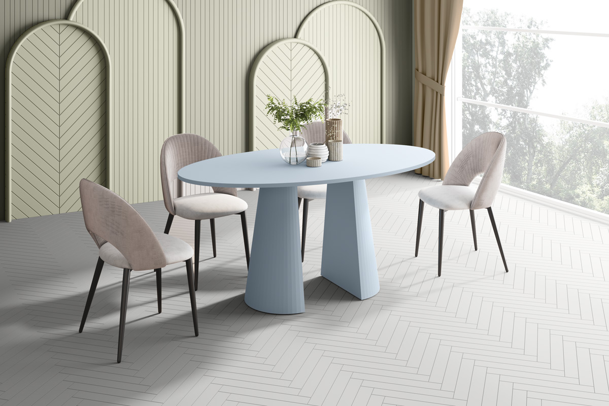 Stół LAZIO z kolekcji Amore Colore zachwyca swoją wyjątkową formą, która łączy w sobie nowoczesność i subtelny luksus. Jego owalny blat, pokryty aksamitnie matową powierzchnią, wyróżnia się głębią koloru i delikatnym, eleganckim wykończeniem. Najbardziej intrygującym elementem tego modelu jest nietuzinkowo podzielona, zaoblona noga, która stanowi designerski akcent.
