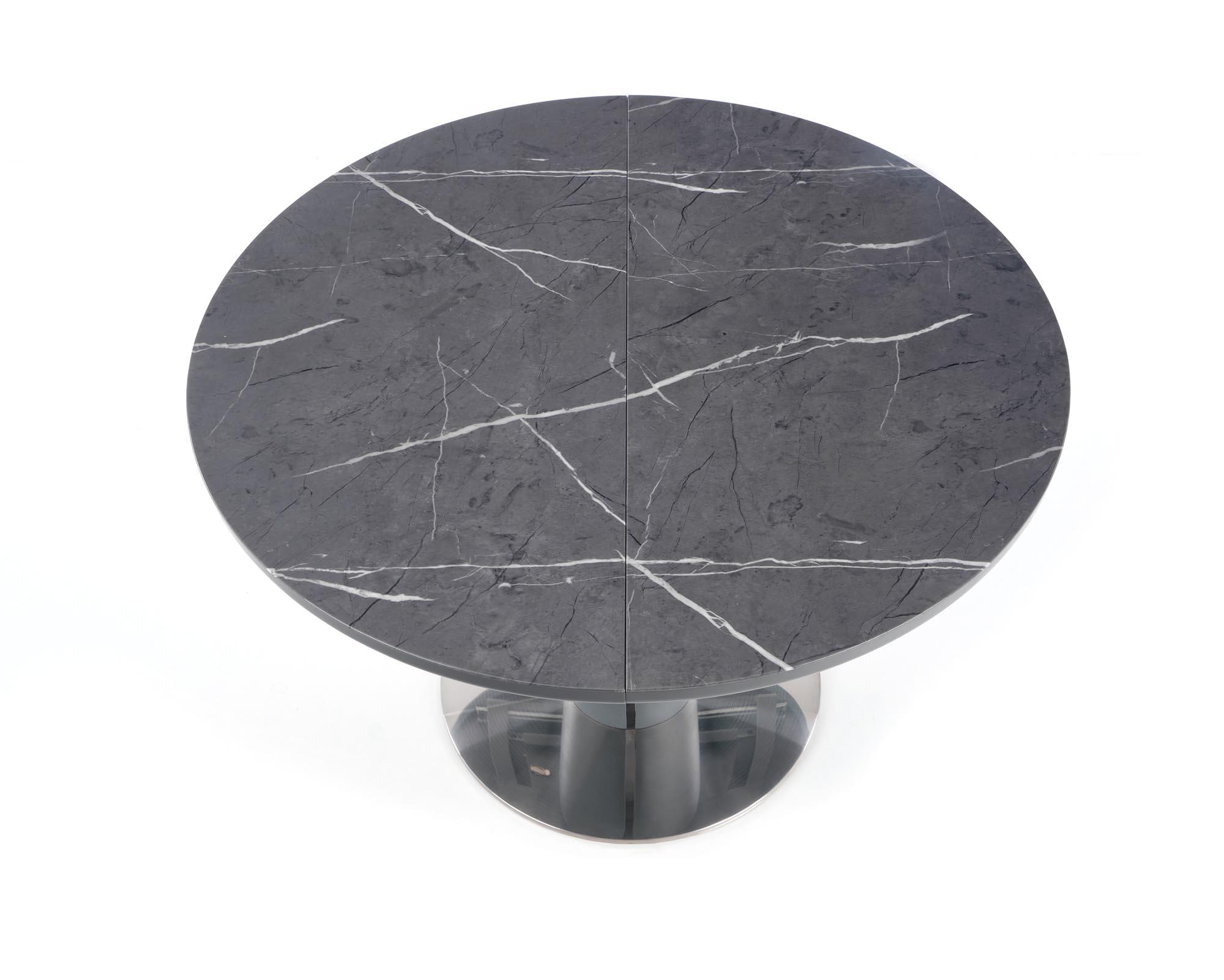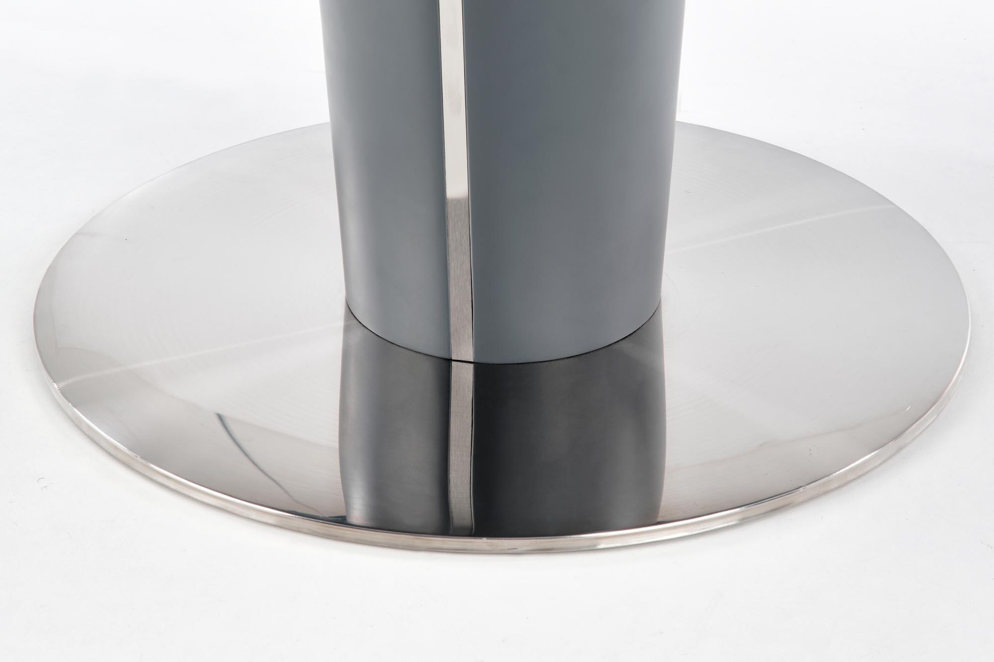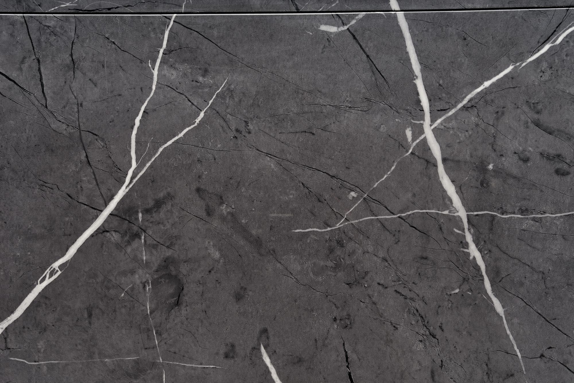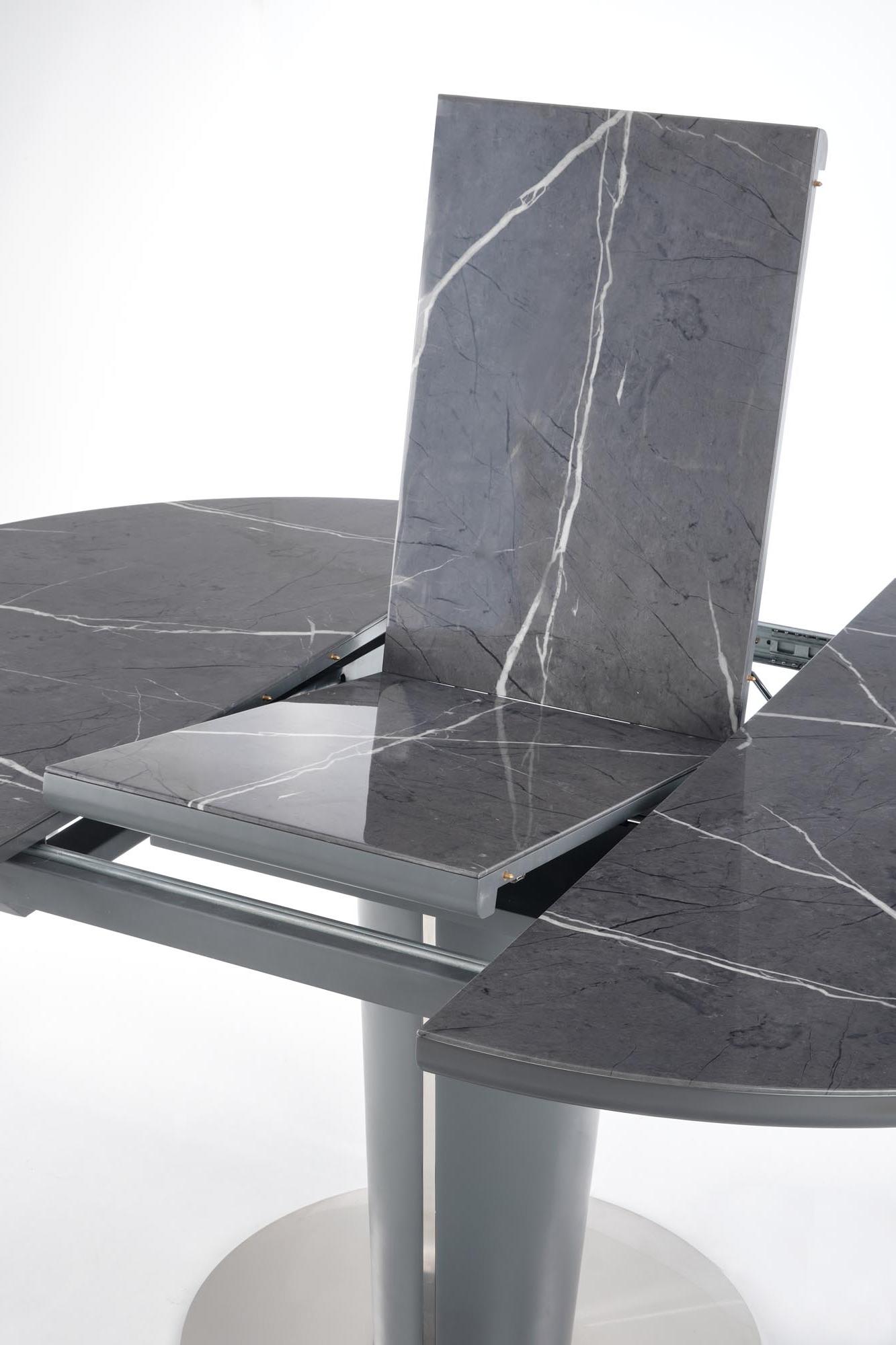 Stół wykonano z materiału: szkło / MDF lakierowany / stal nierdzewna, kolor blat - popielaty marmur, nogi - ciemny popiel