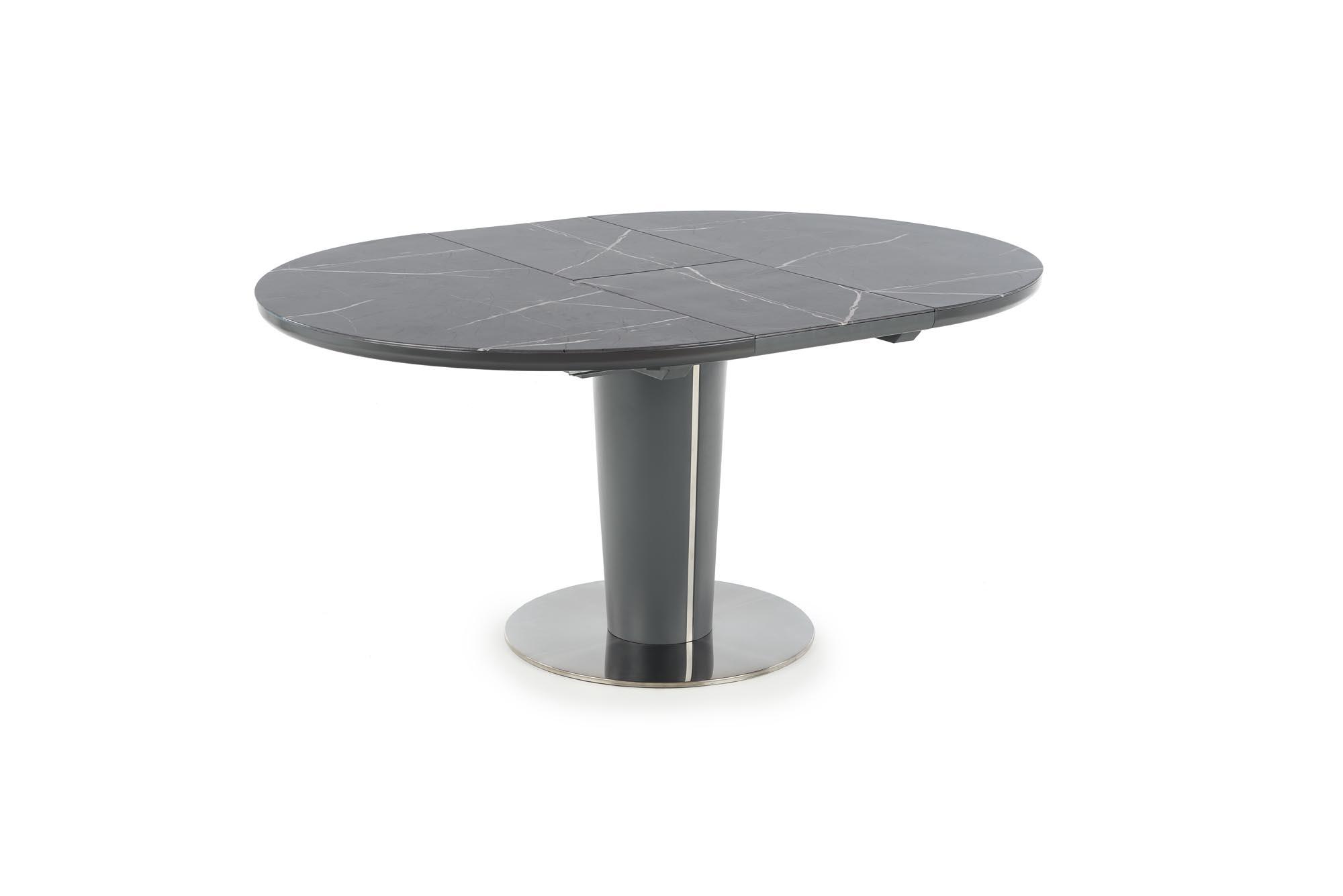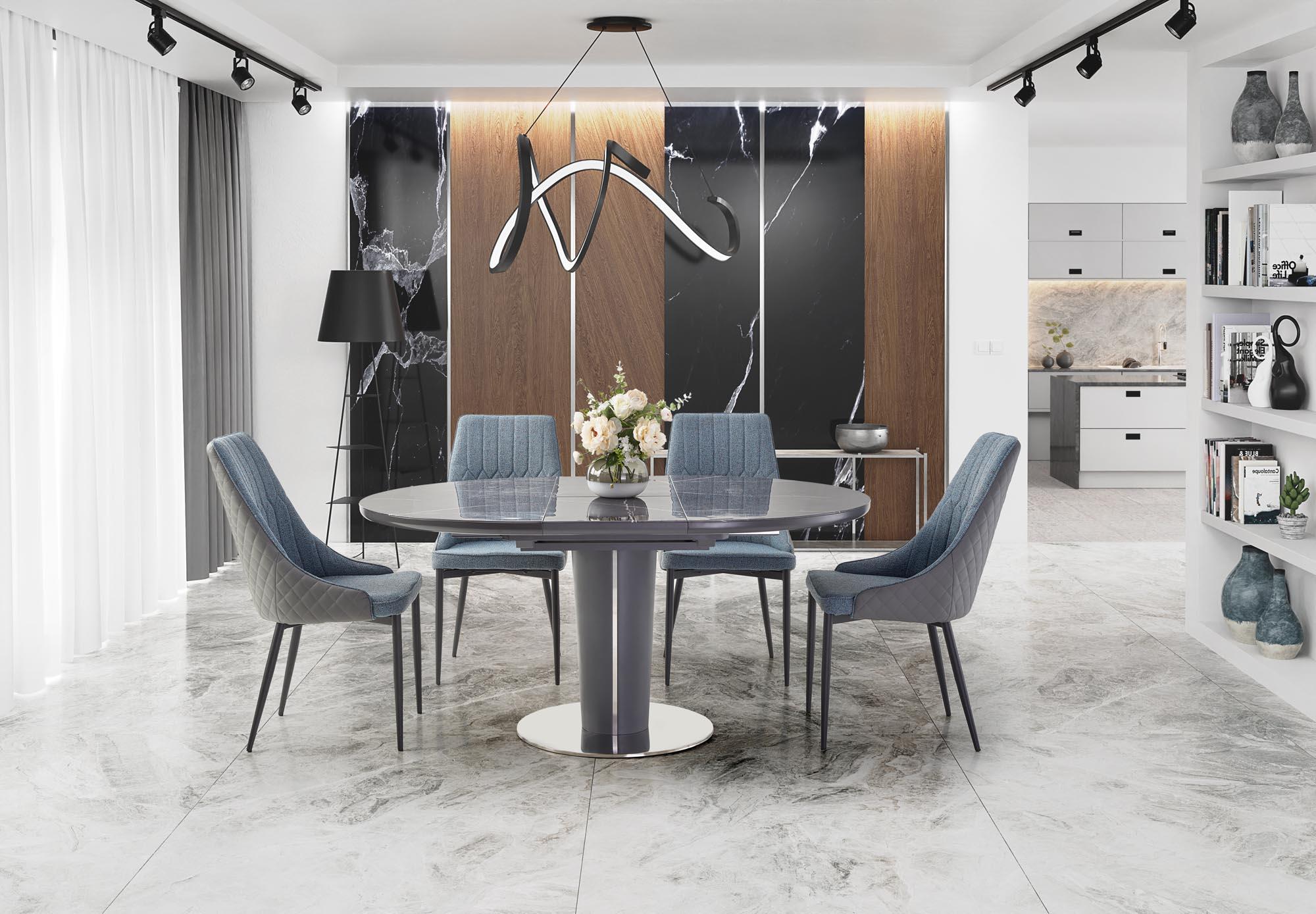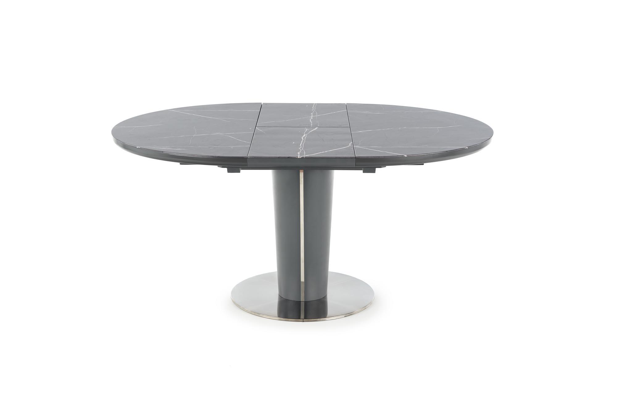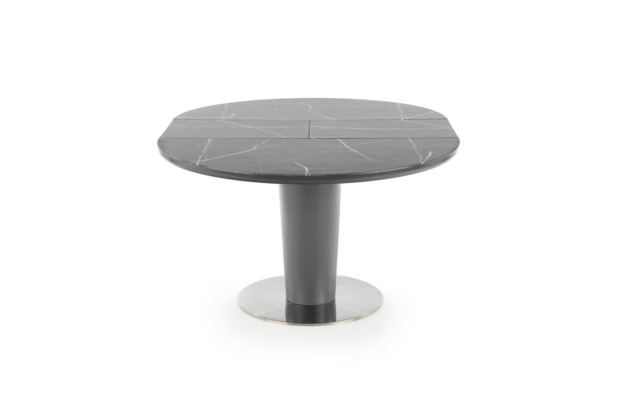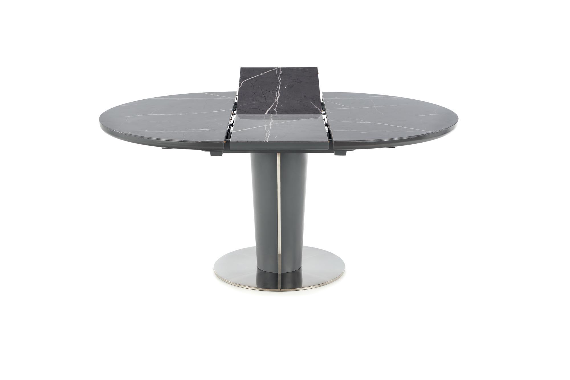 Stół wykonano z materiału: szkło / MDF lakierowany / stal nierdzewna, kolor blat - popielaty marmur, nogi - ciemny popiel