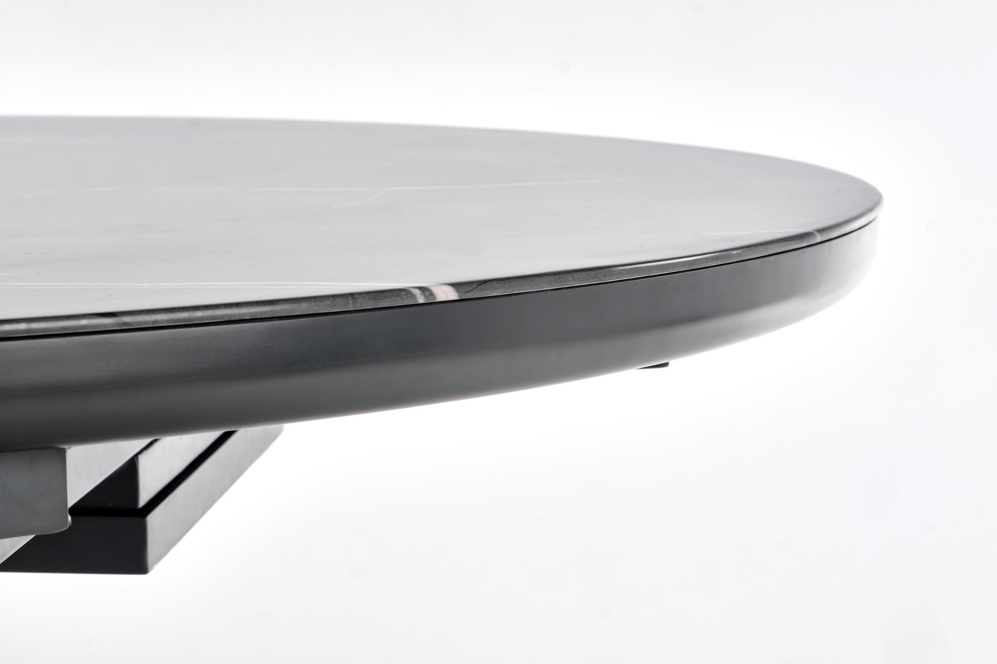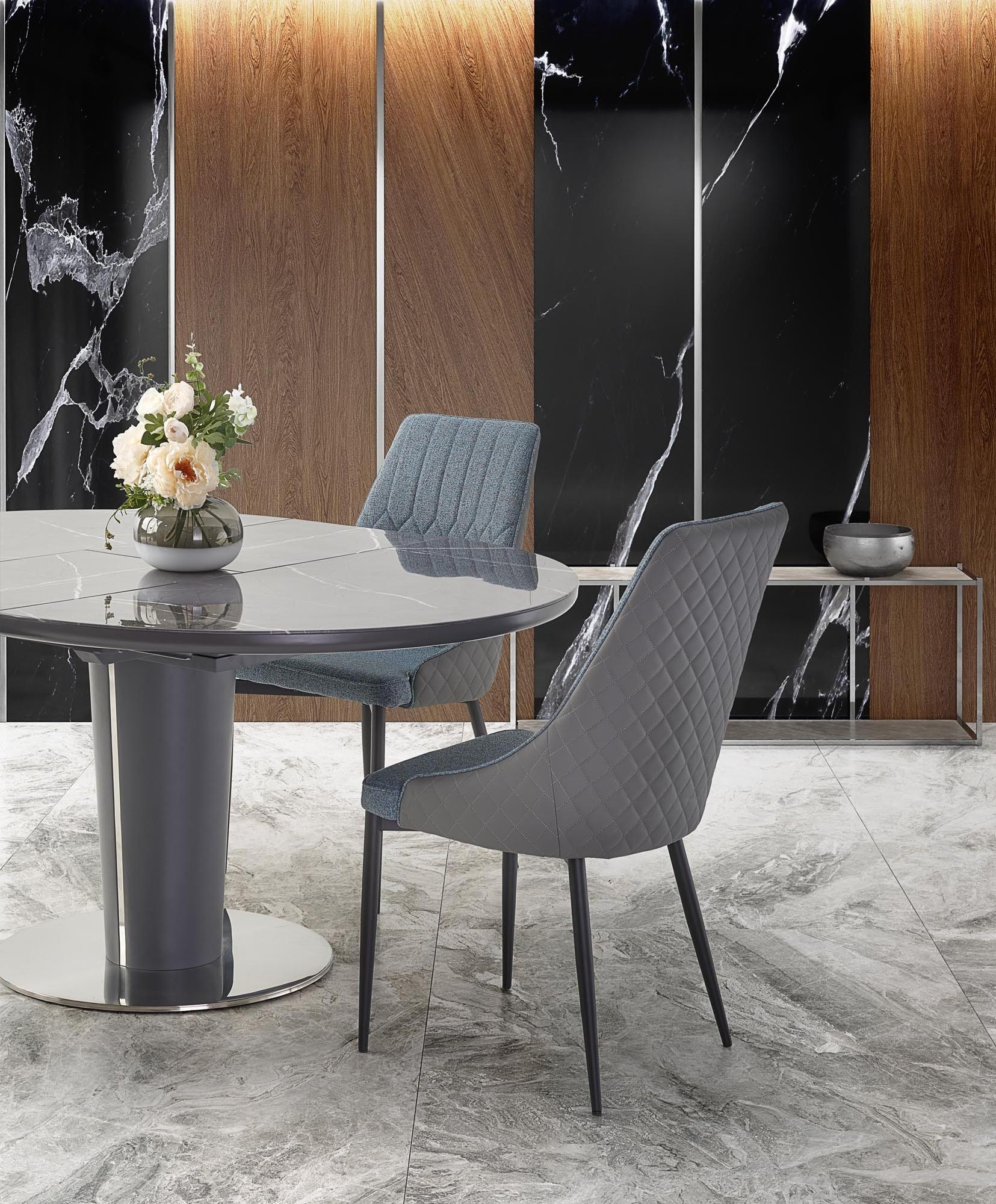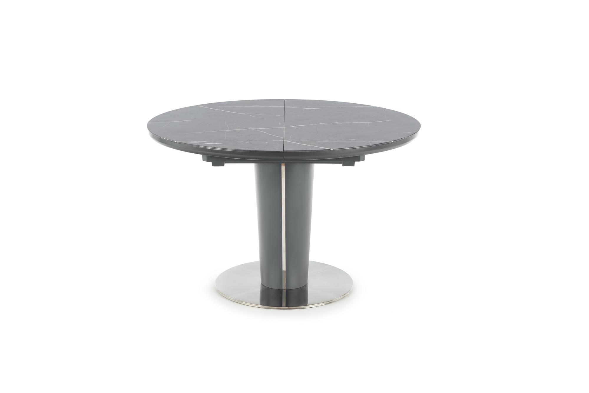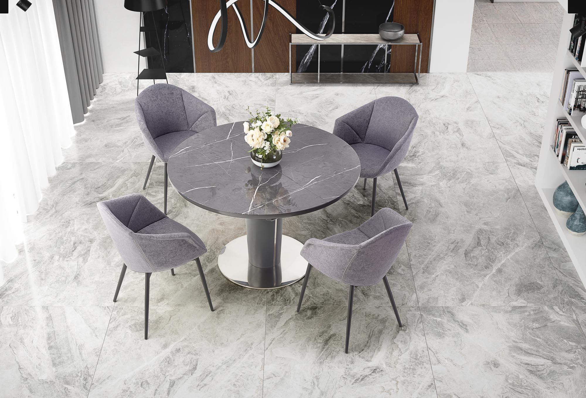 Stół wykonano z materiału: szkło / MDF lakierowany / stal nierdzewna, kolor blat - popielaty marmur, nogi - ciemny popiel