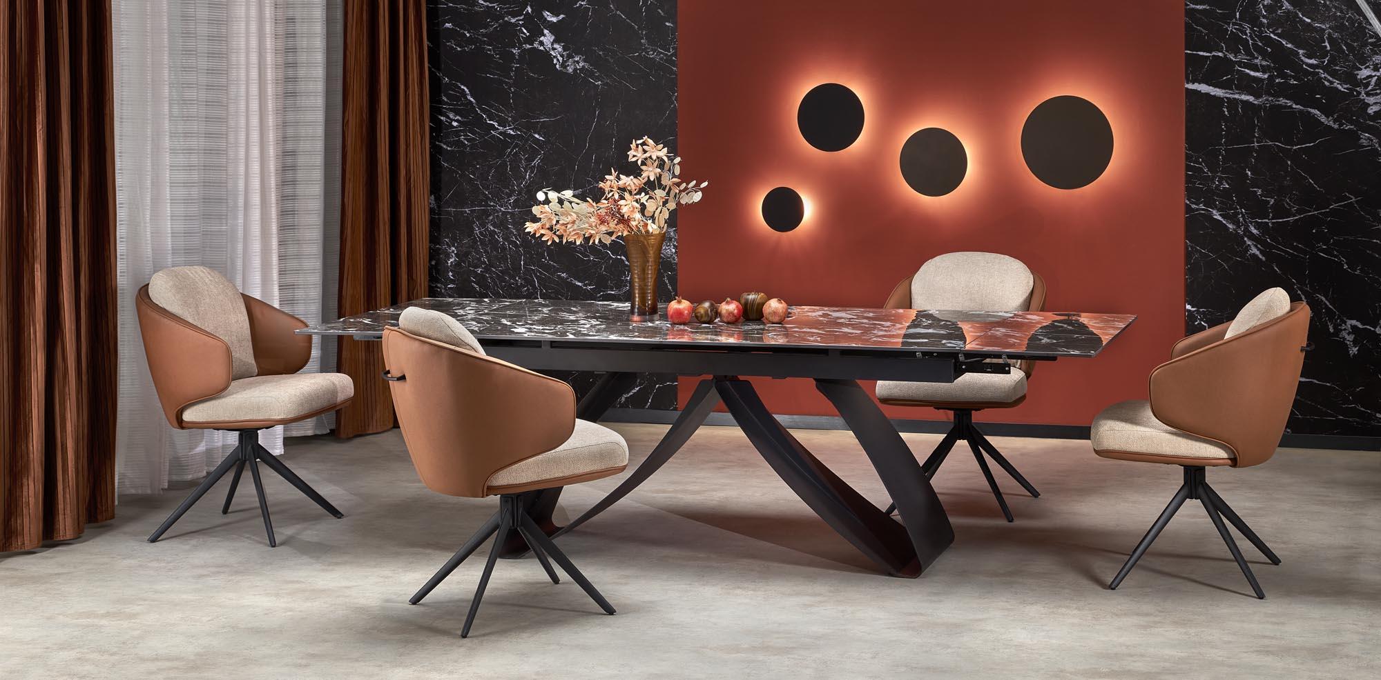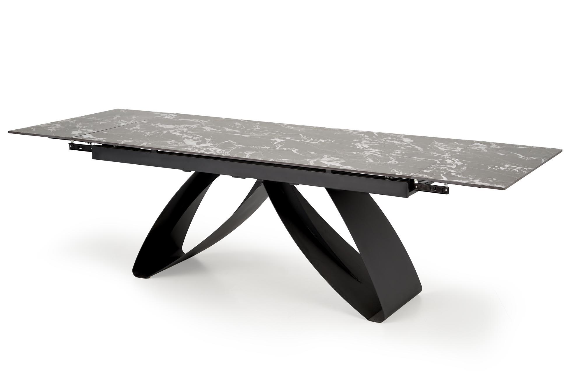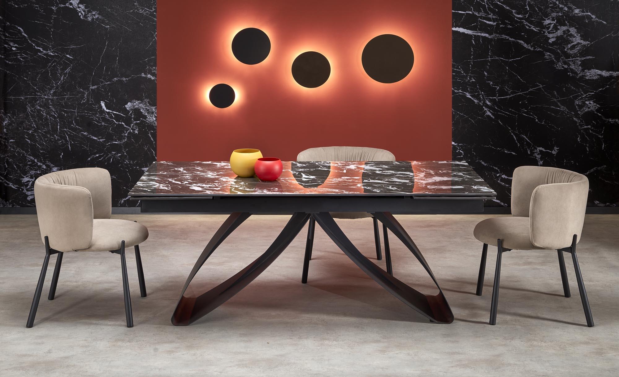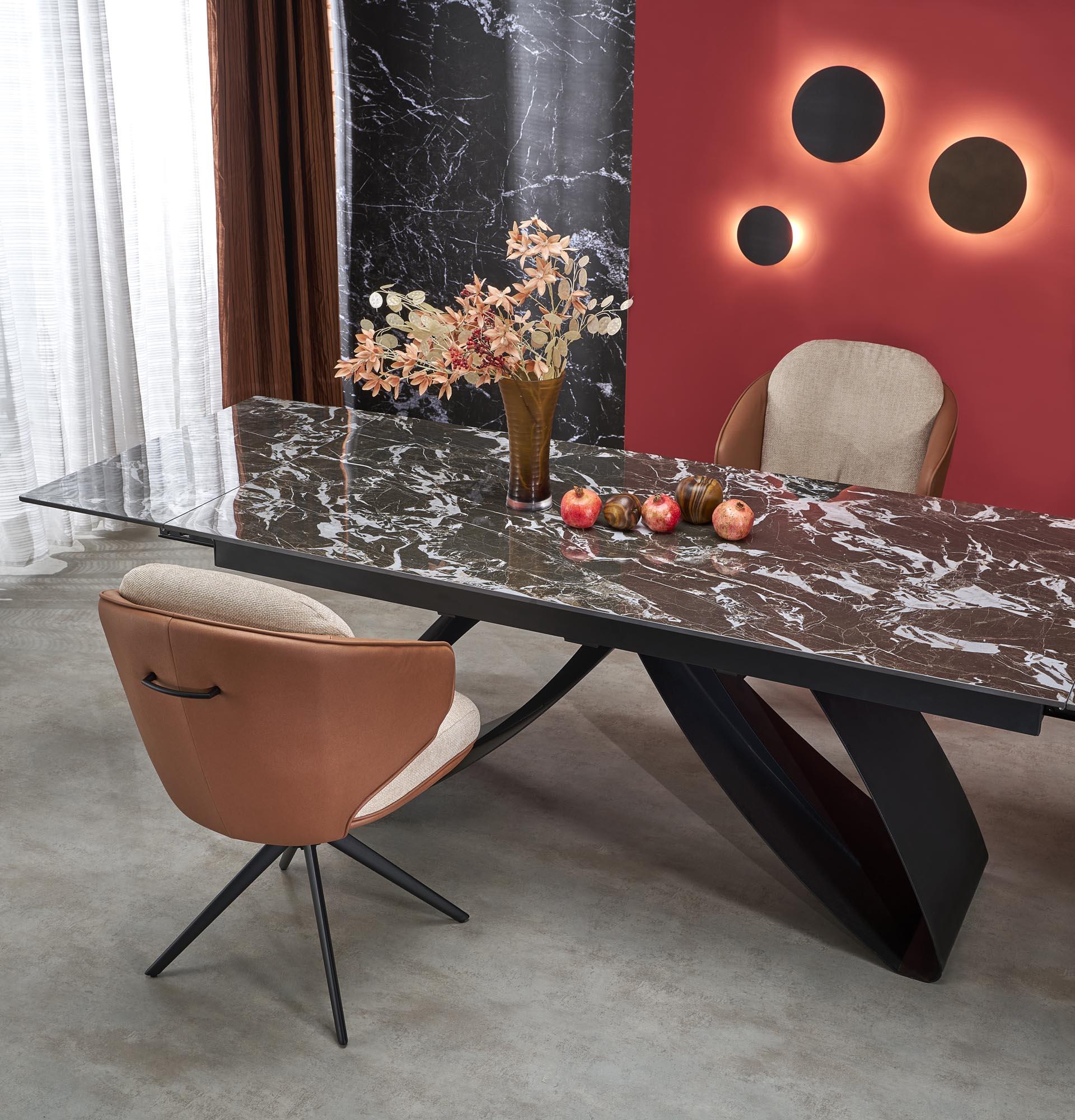 Stół wykonano z materiału: spiek / stal malowana proszkowo, kolor blat - czarny marmur, nogi - czarny