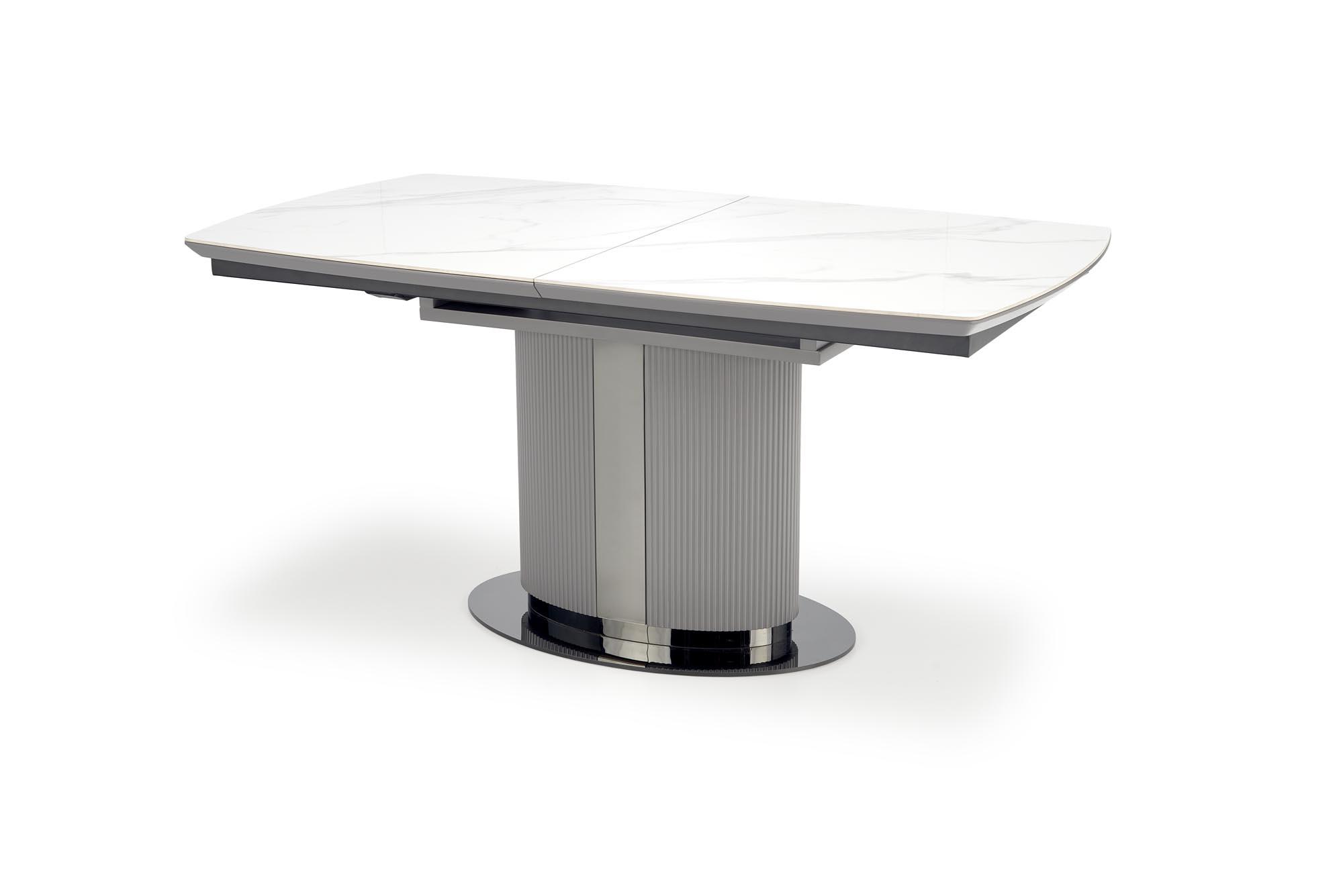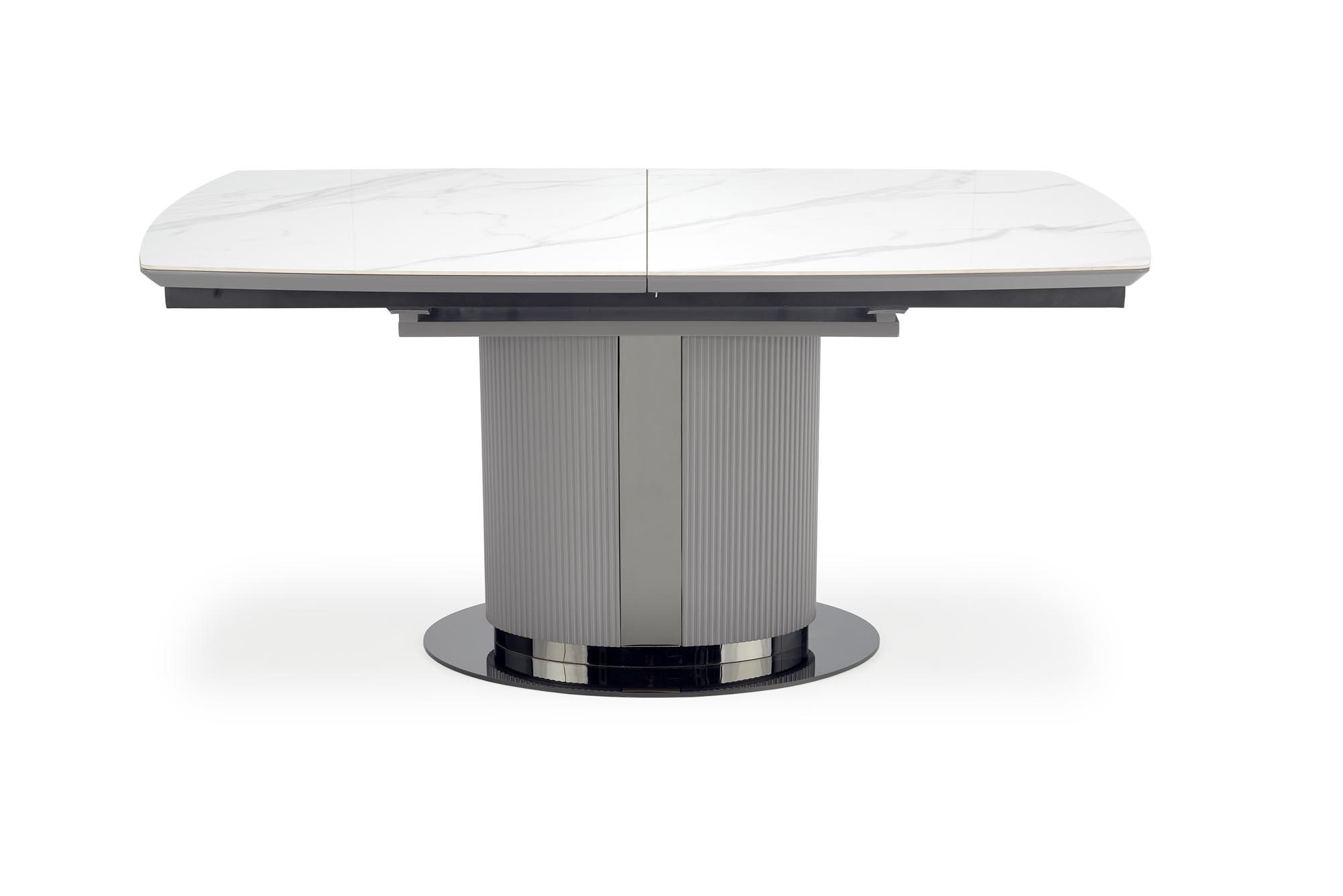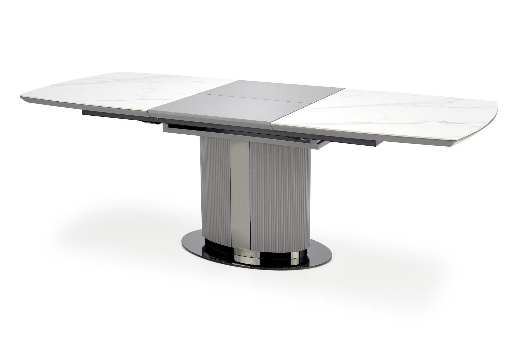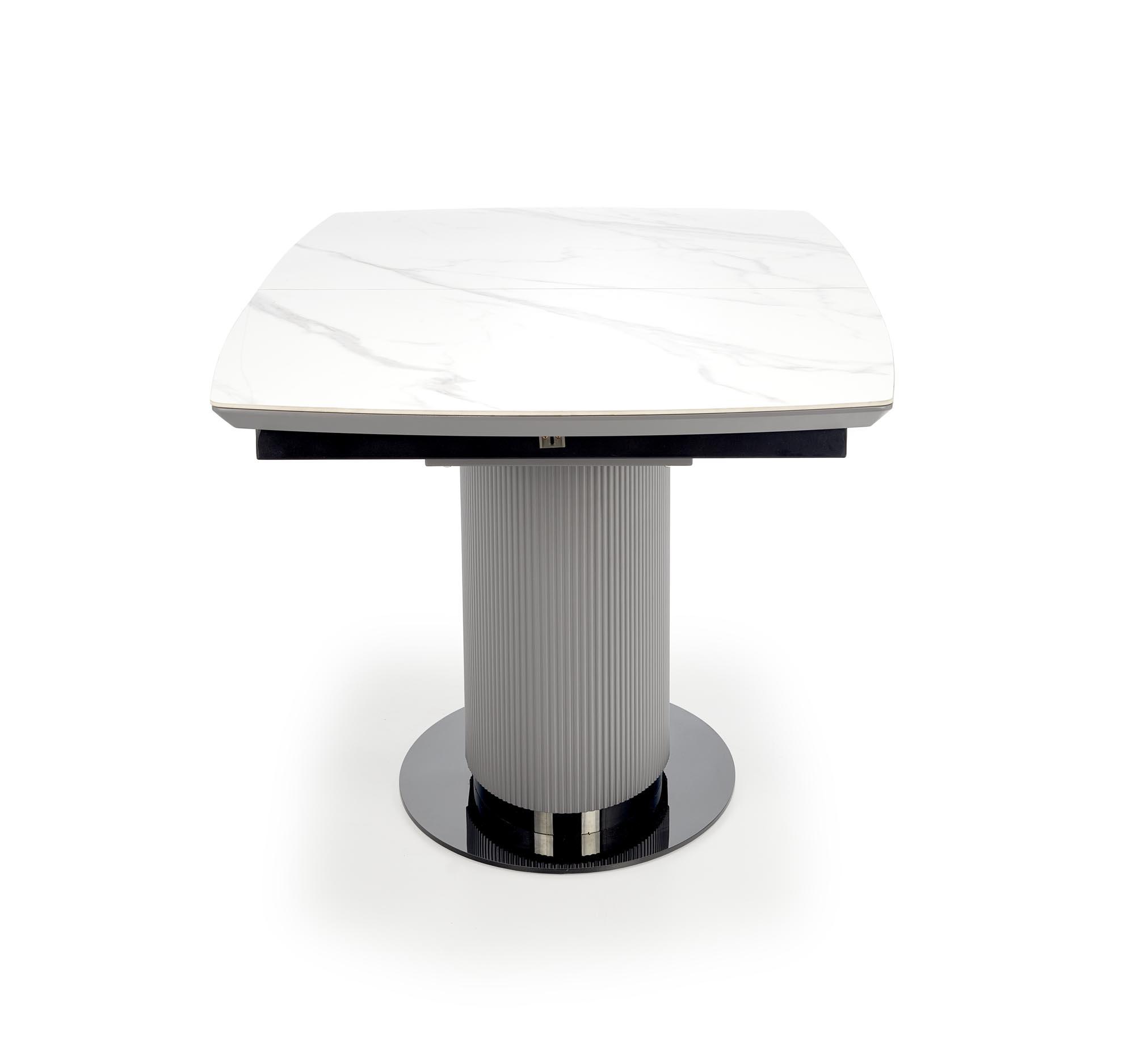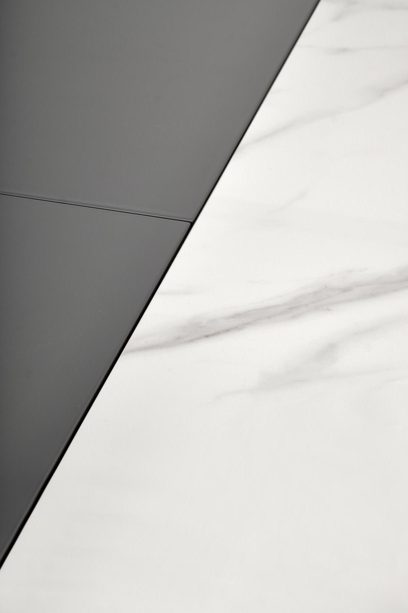 Stół wykonano z materiału: ceramika / MDF lakierowany / stal malowana proszkowo, kolor blat - biały marmur / popielaty, noga - jasny popiel / czarny