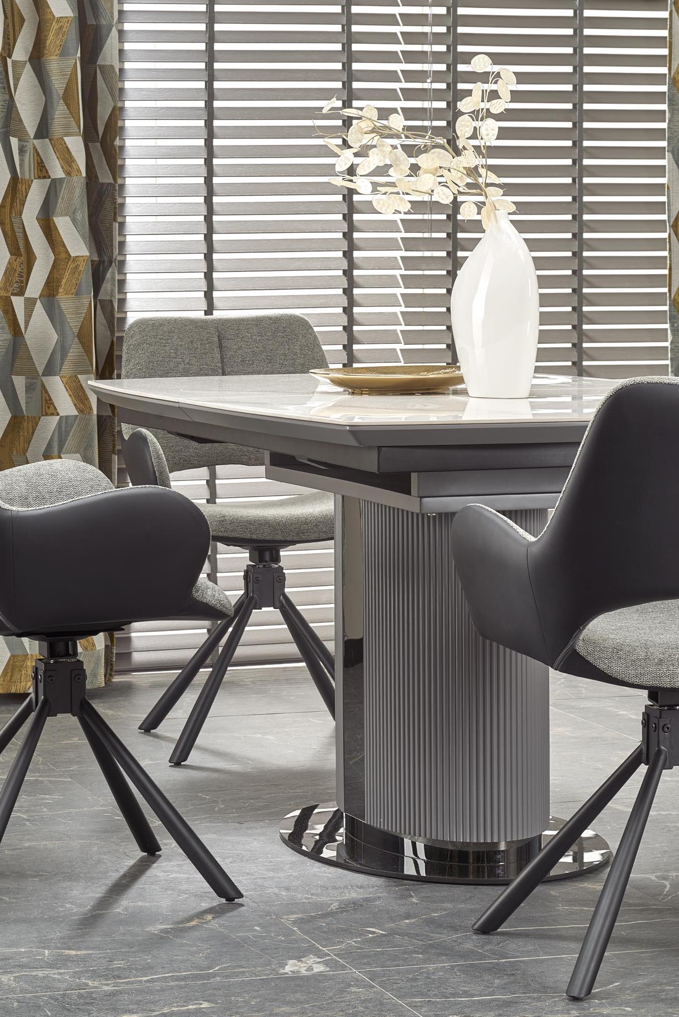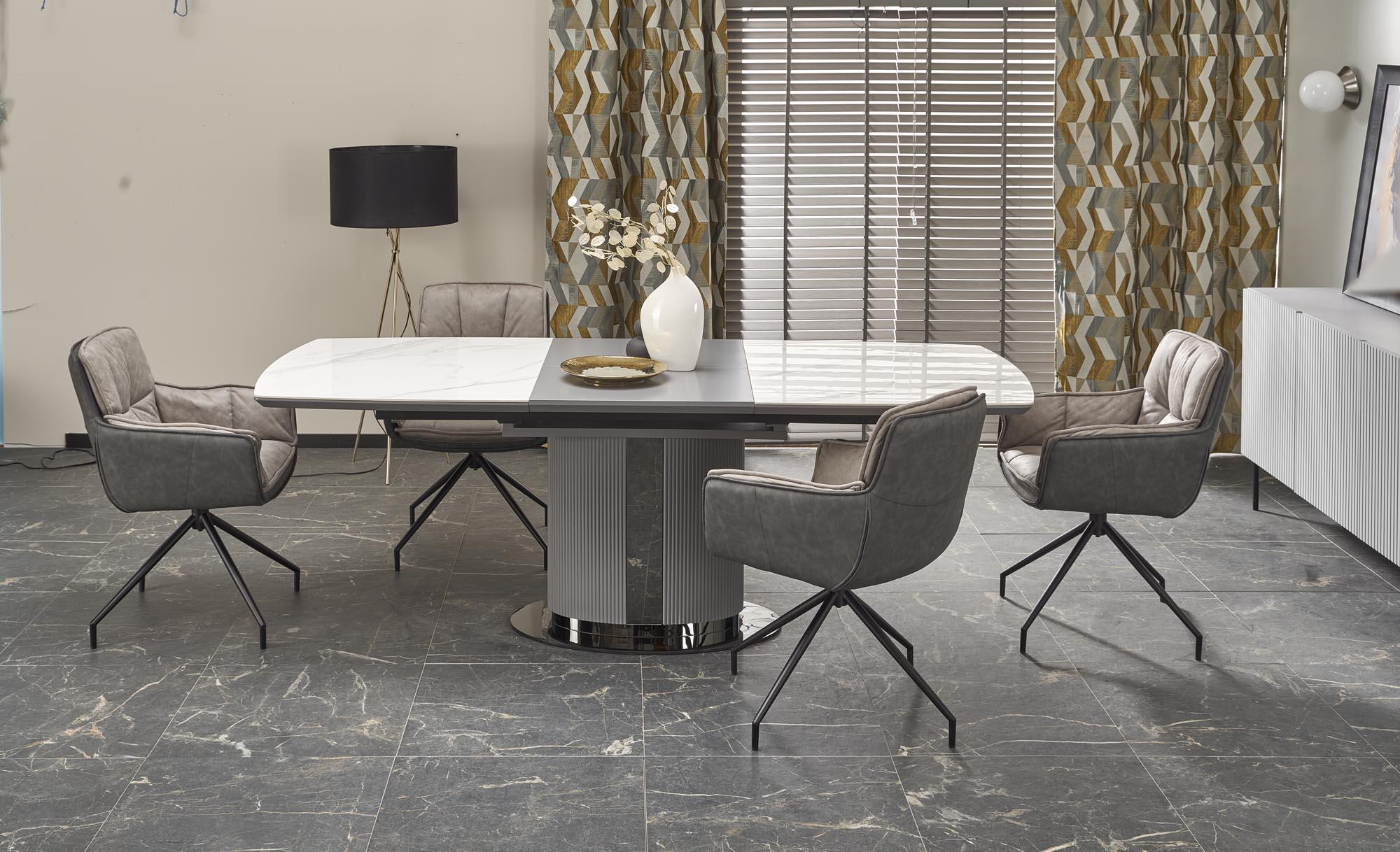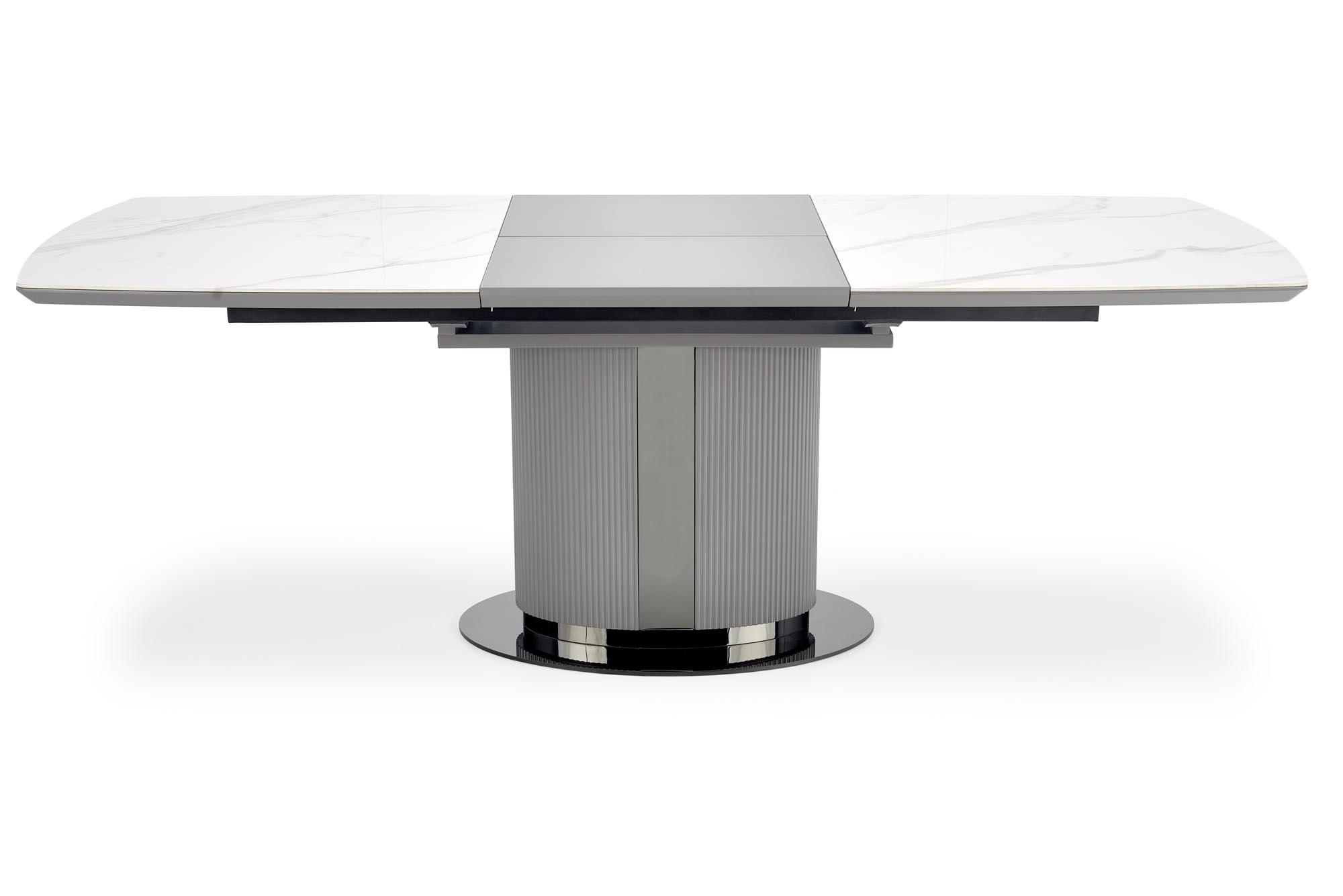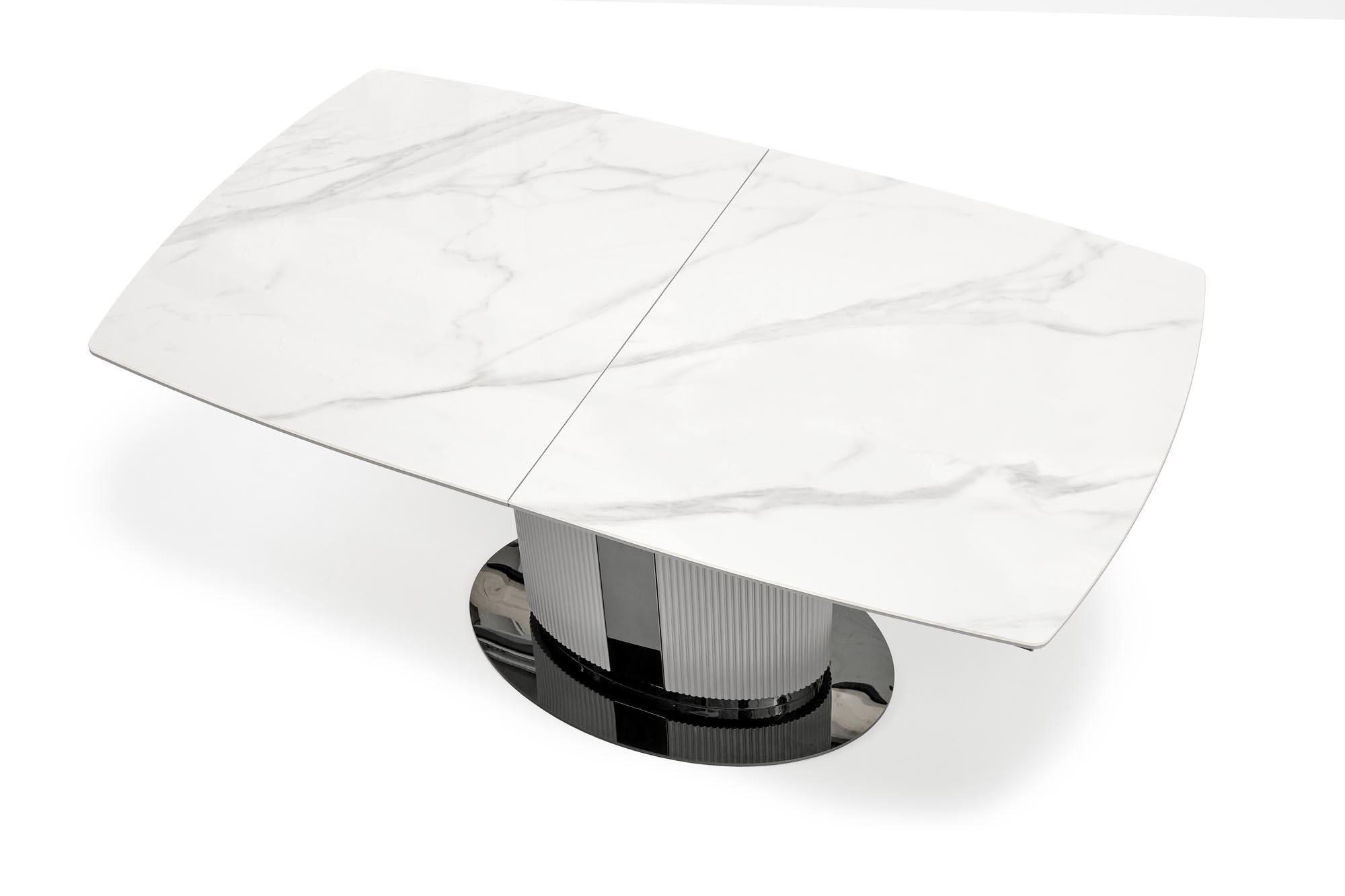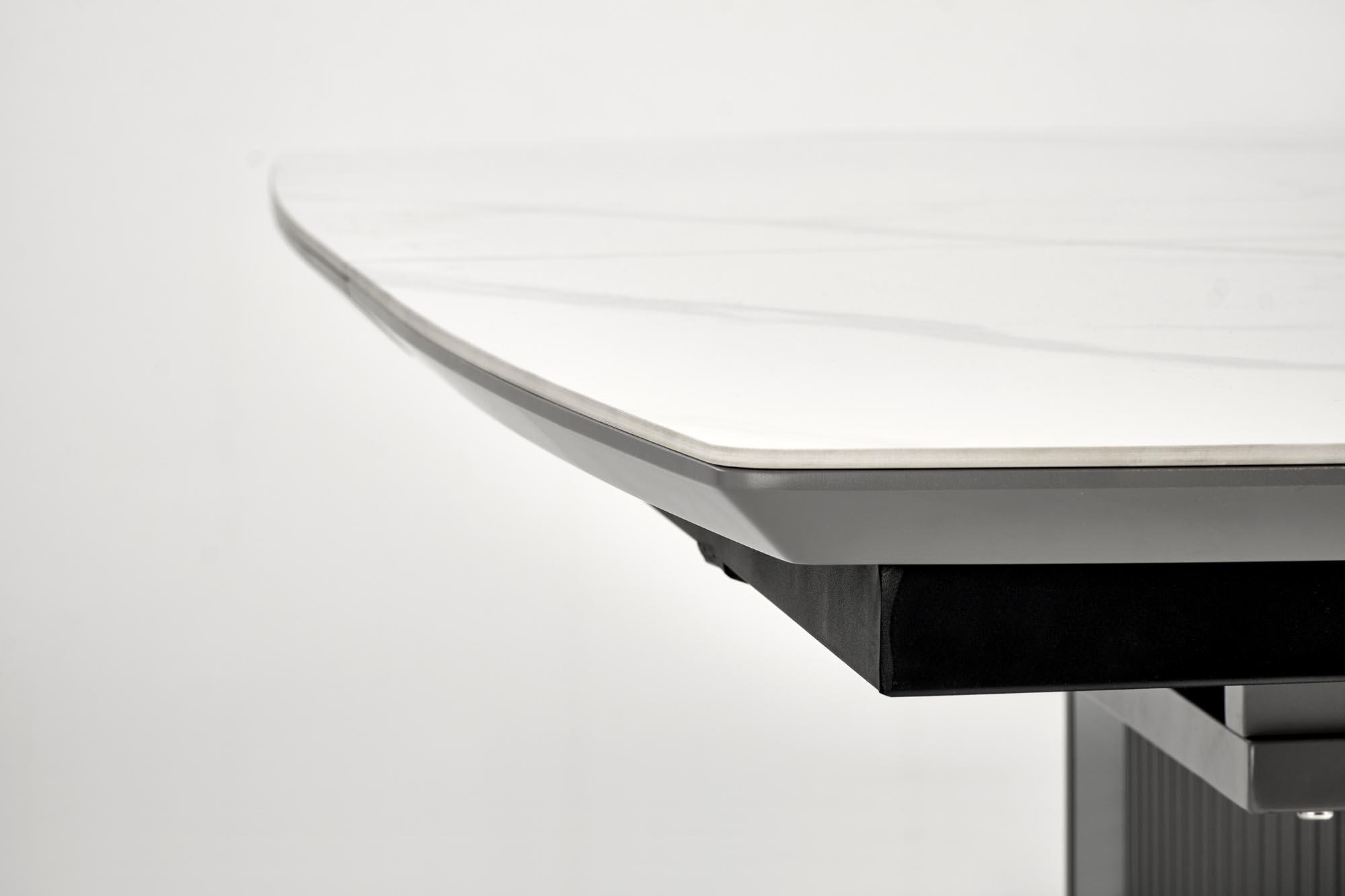 Stół wykonano z materiału: ceramika / MDF lakierowany / stal malowana proszkowo, kolor blat - biały marmur / popielaty, noga - jasny popiel / czarny