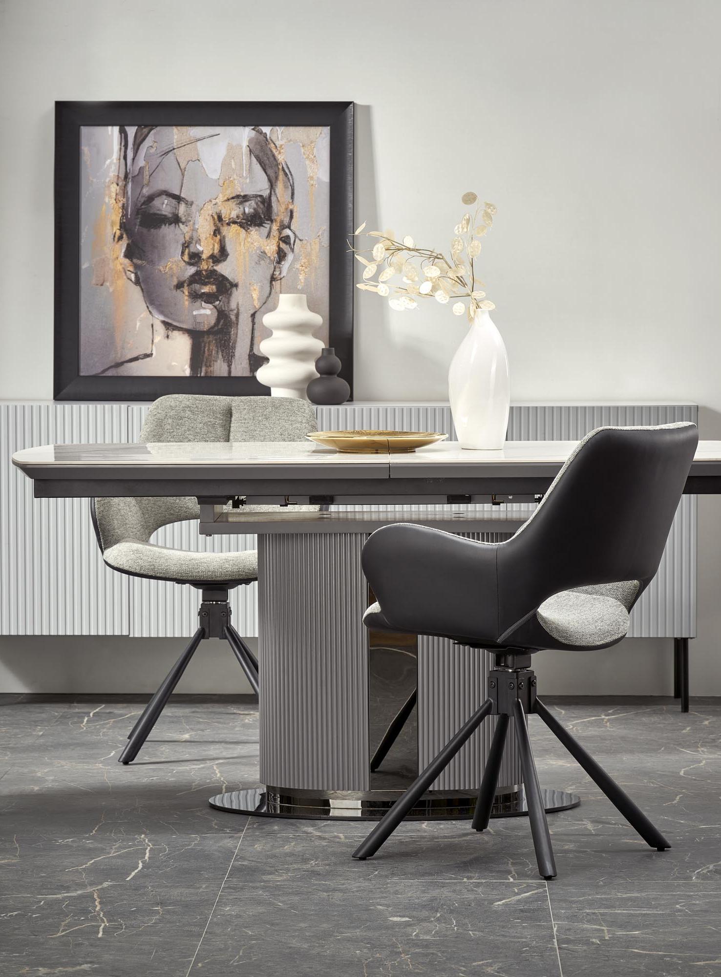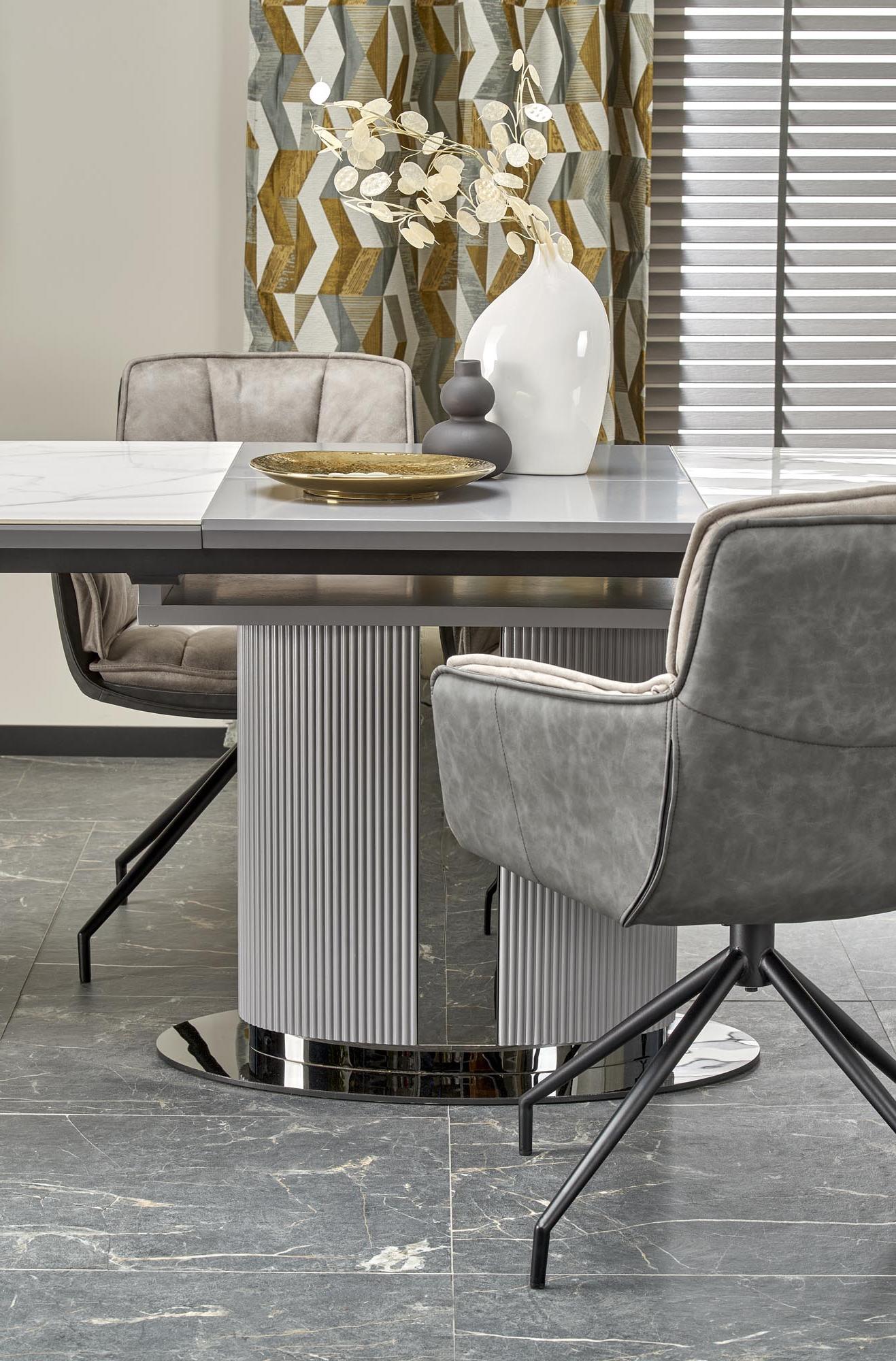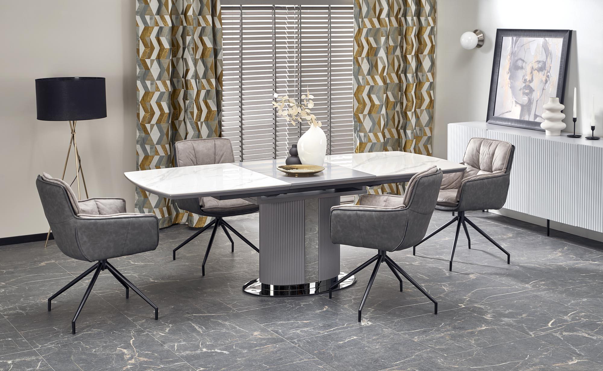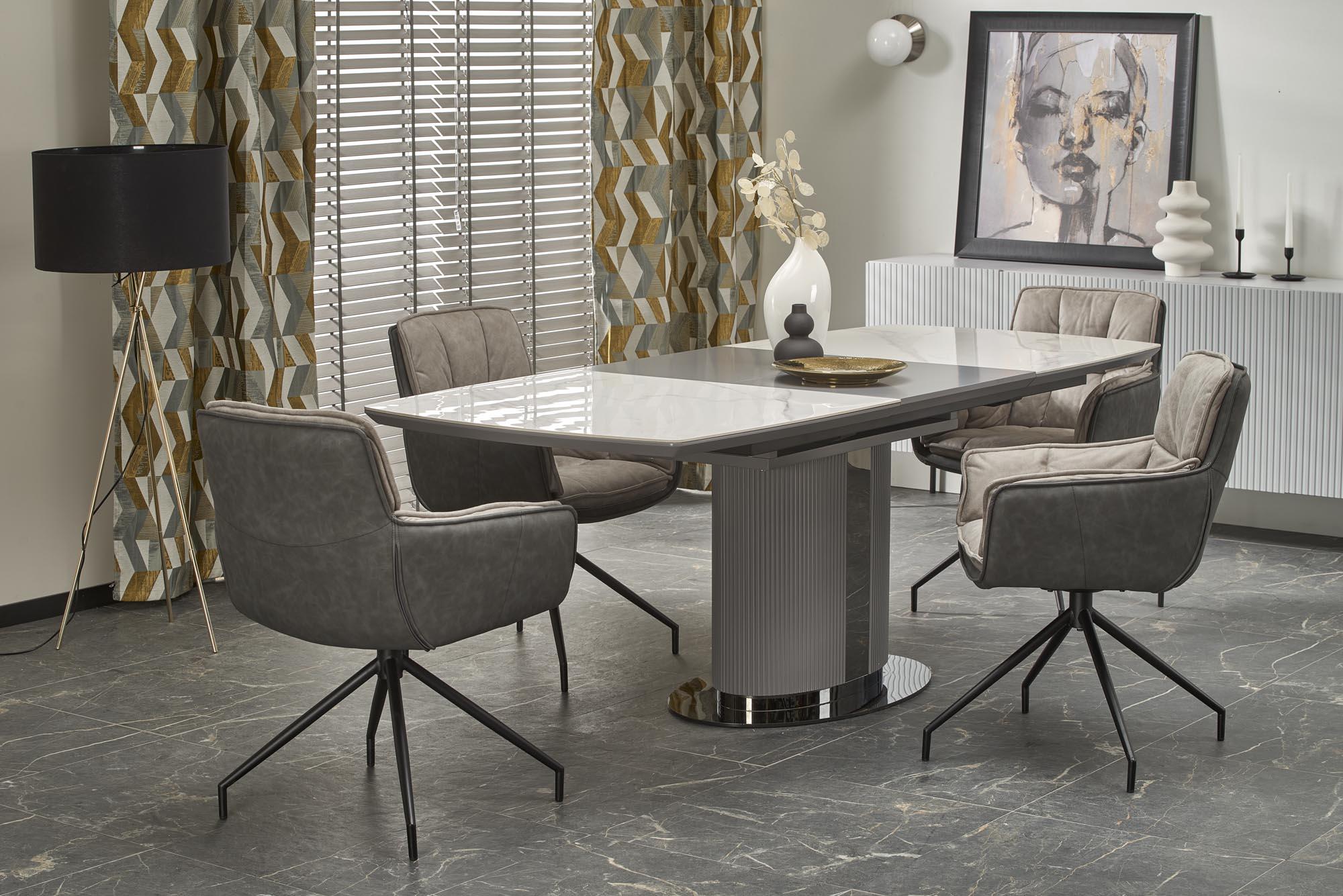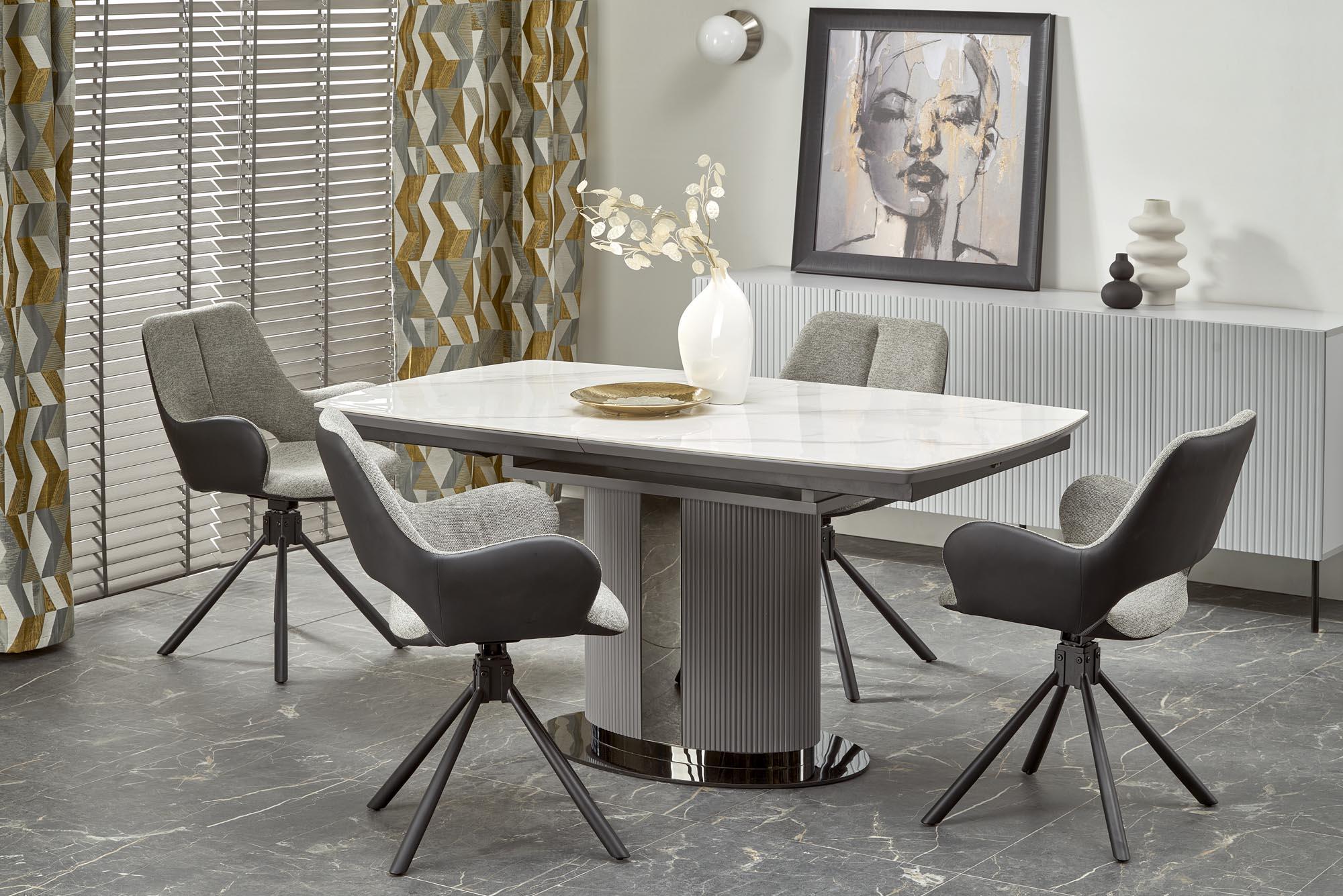 Stół wykonano z materiału: ceramika / MDF lakierowany / stal malowana proszkowo, kolor blat - biały marmur / popielaty, noga - jasny popiel / czarny