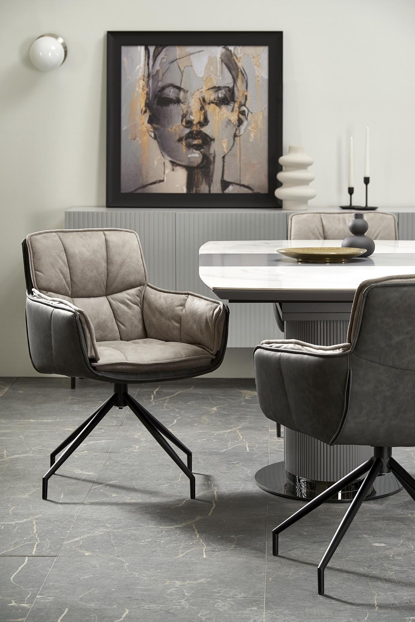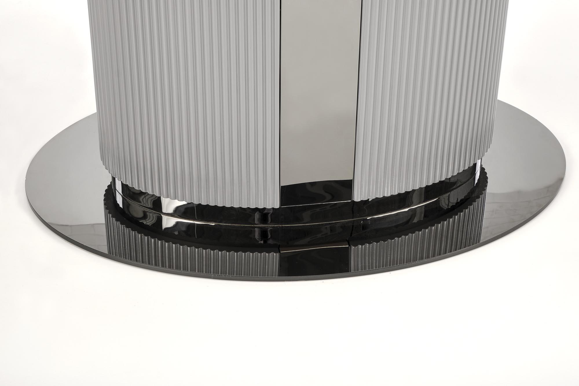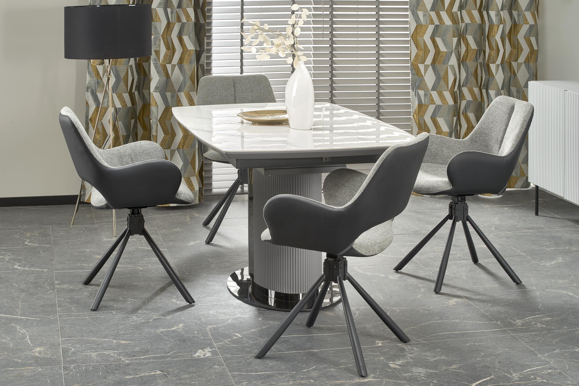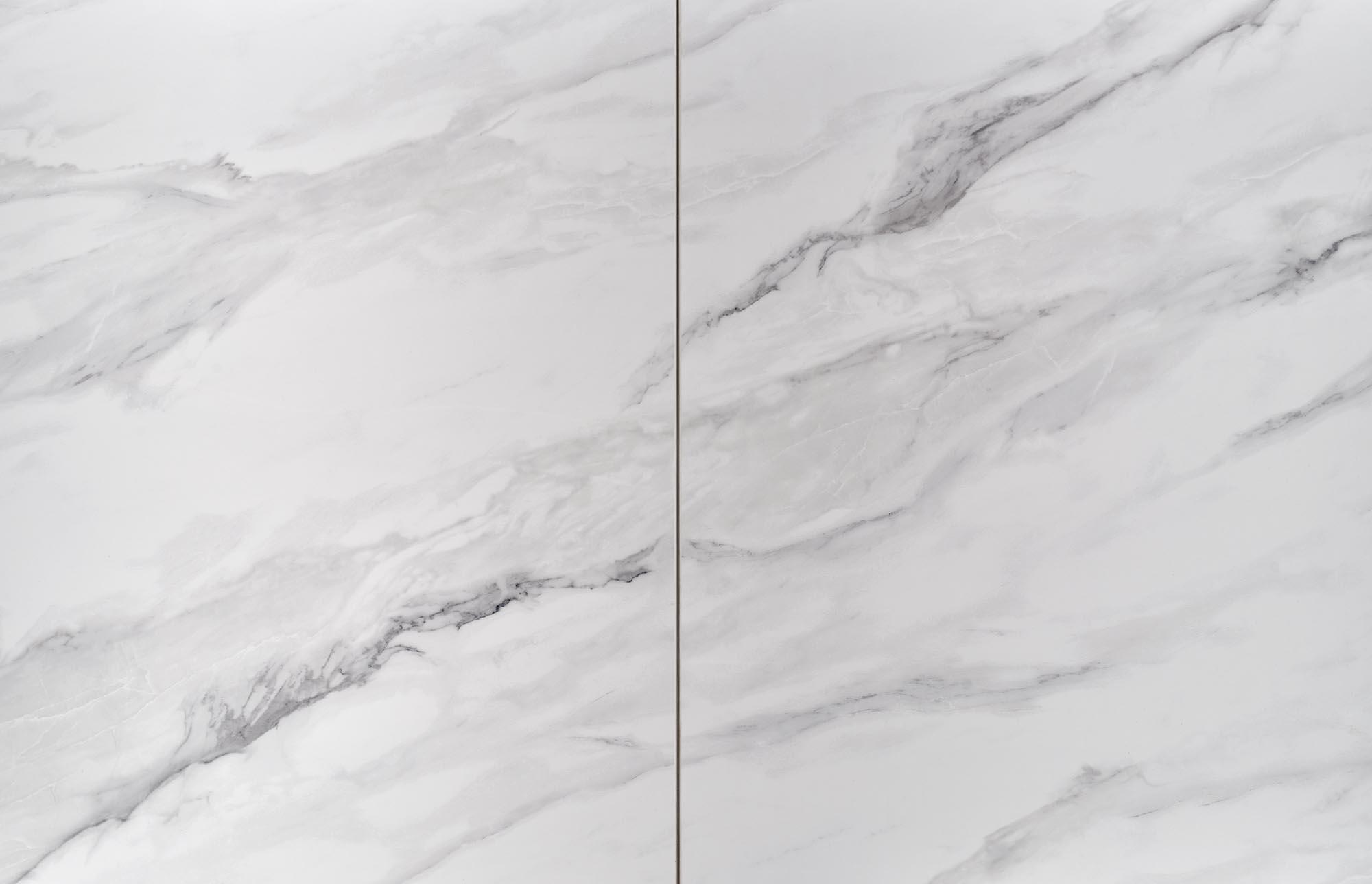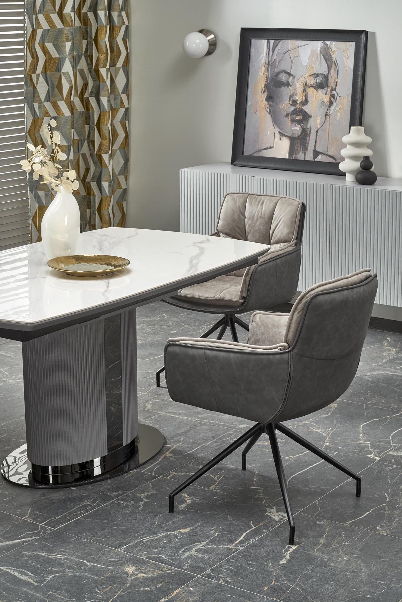 Stół wykonano z materiału: ceramika / MDF lakierowany / stal malowana proszkowo, kolor blat - biały marmur / popielaty, noga - jasny popiel / czarny