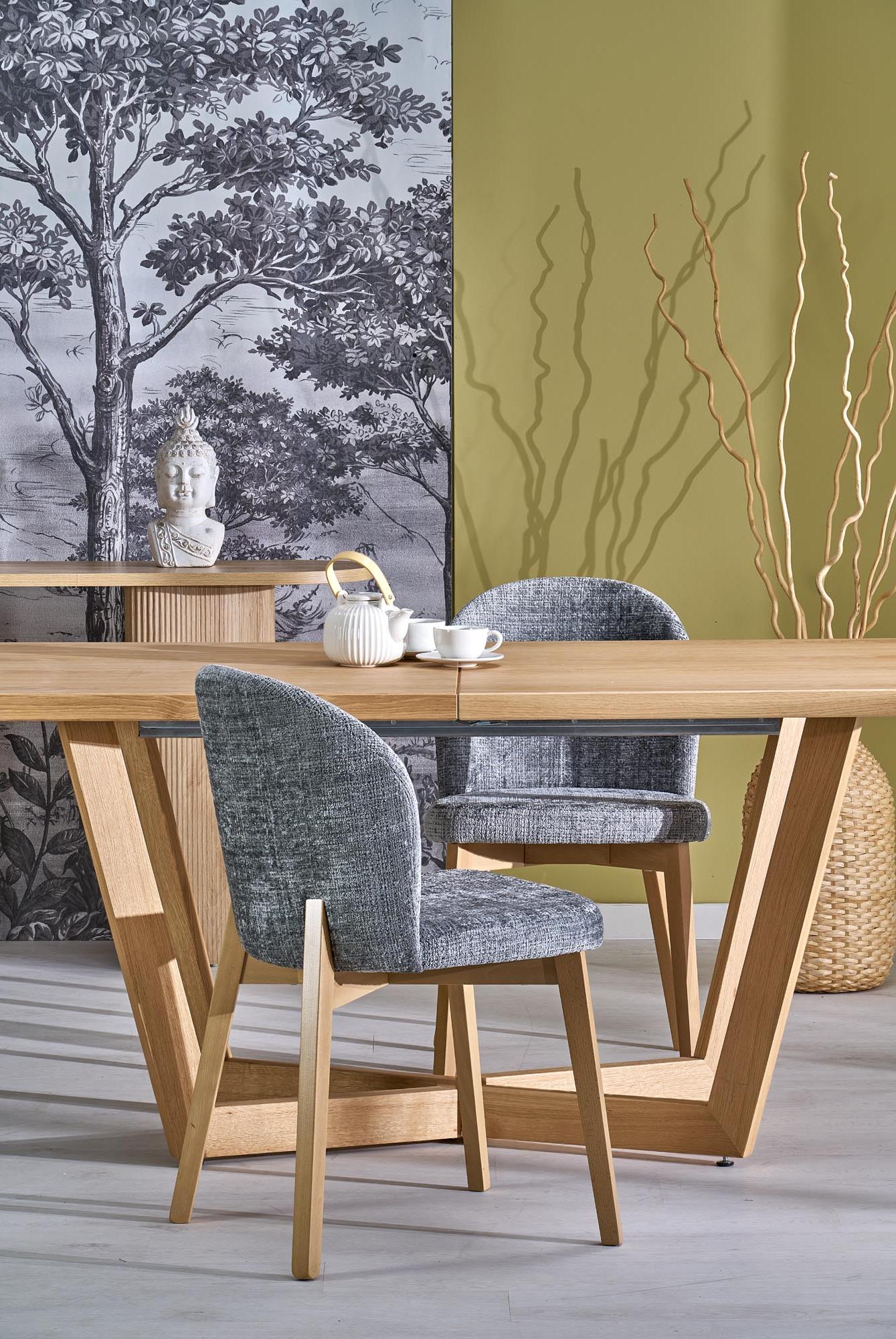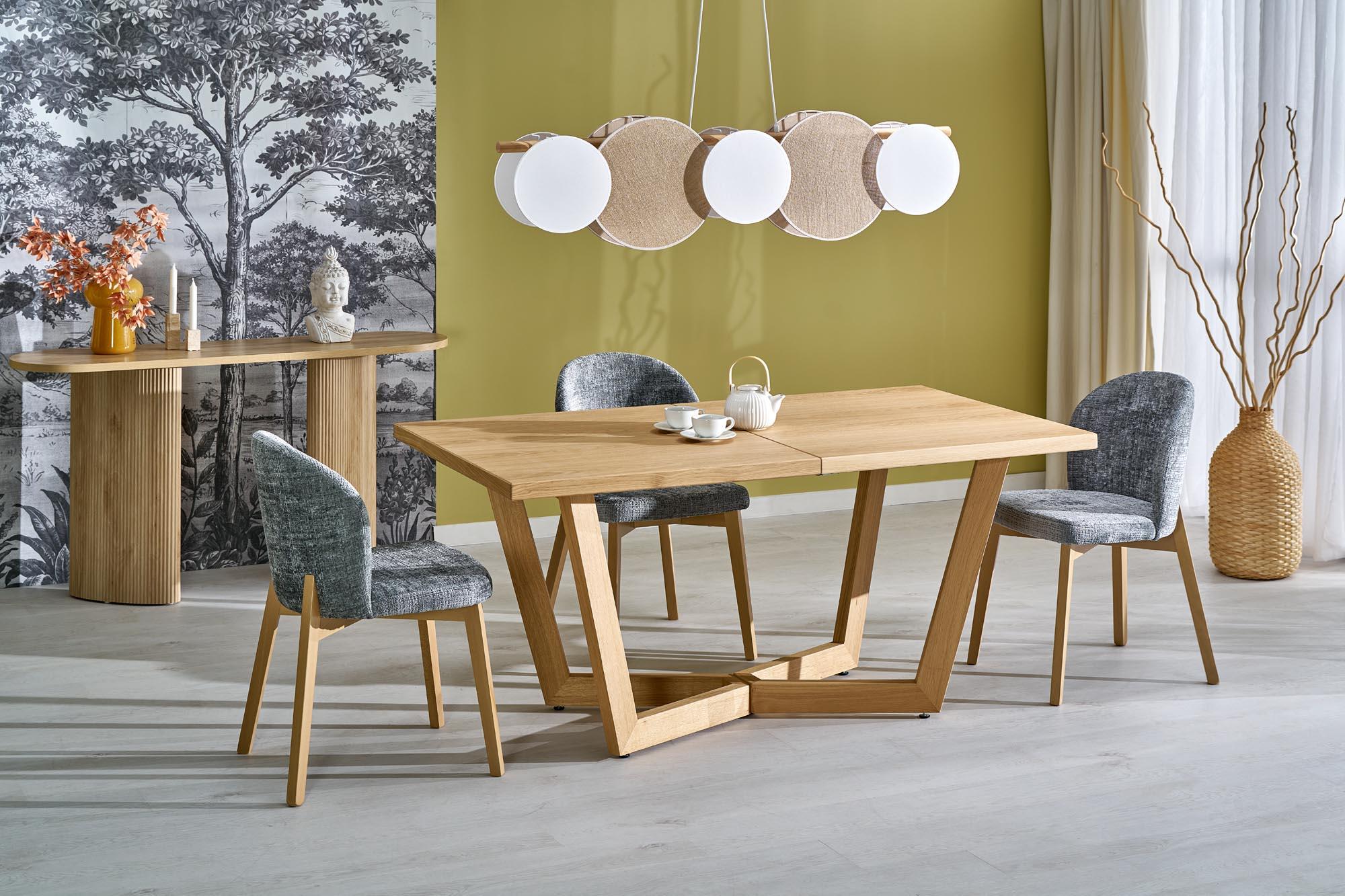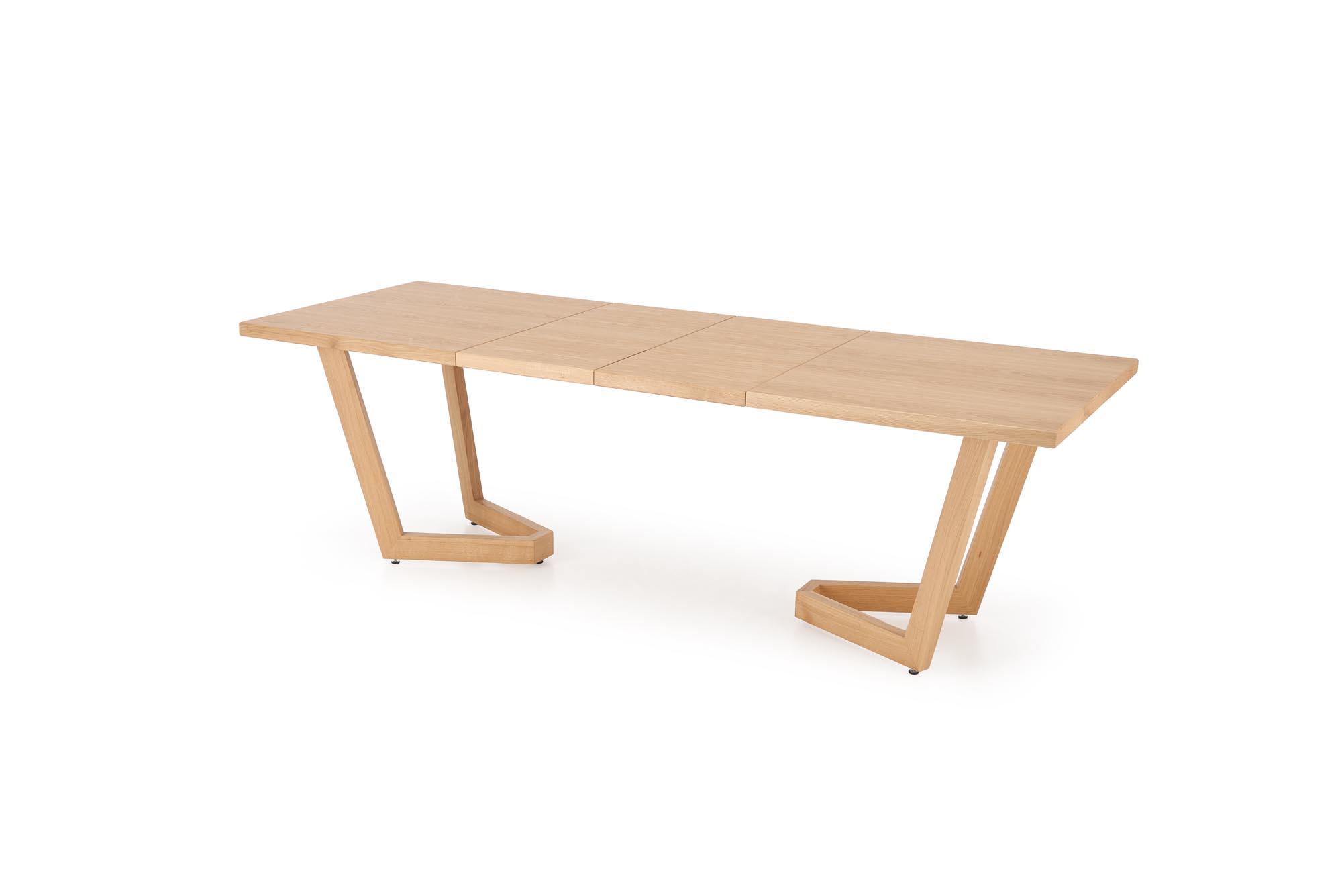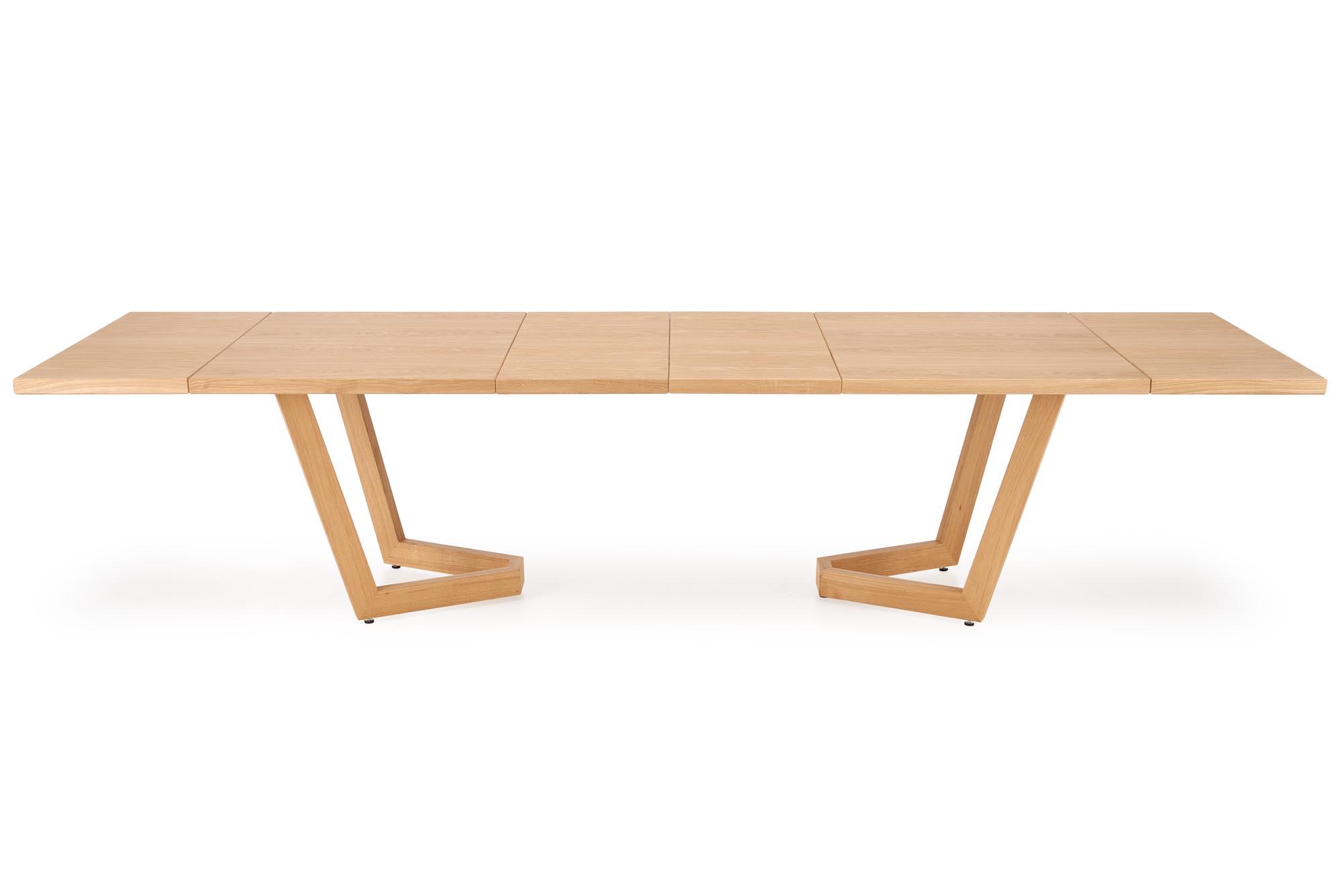 Stół wykonano z materiału: blat - płyta fornirowana, na obrzeżach drewno lite, nogi - drewno lite dębowe, kolor blat – dąb naturalny, nogi - dąb naturalny, * w opcji przedłużki do blatów MASSIVE 3 (wymiary 45x90 cm - 2 szt.)
