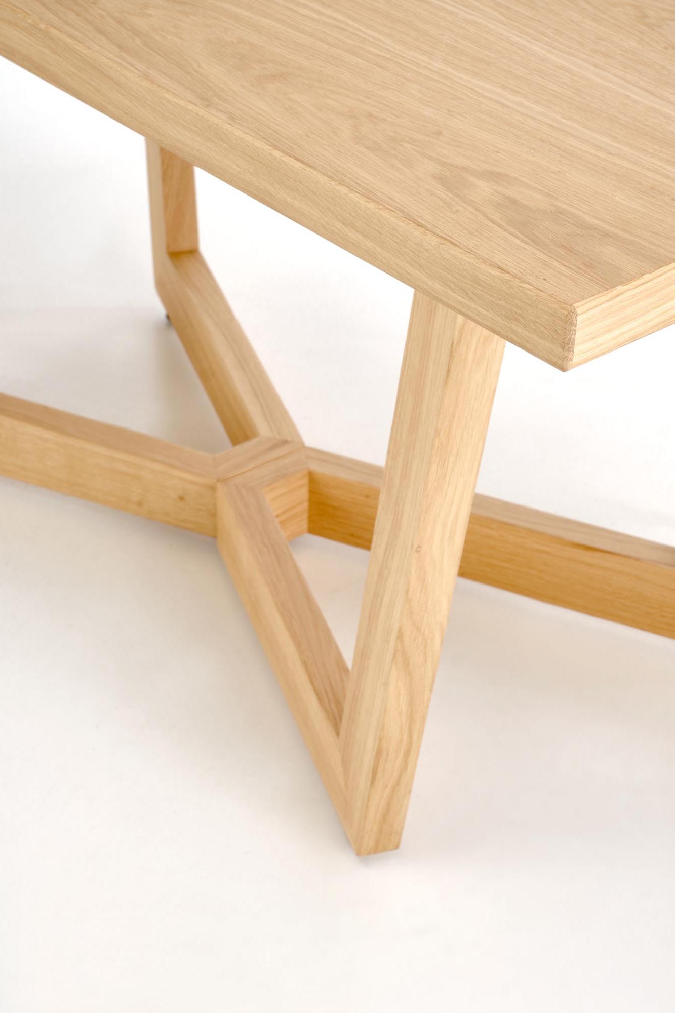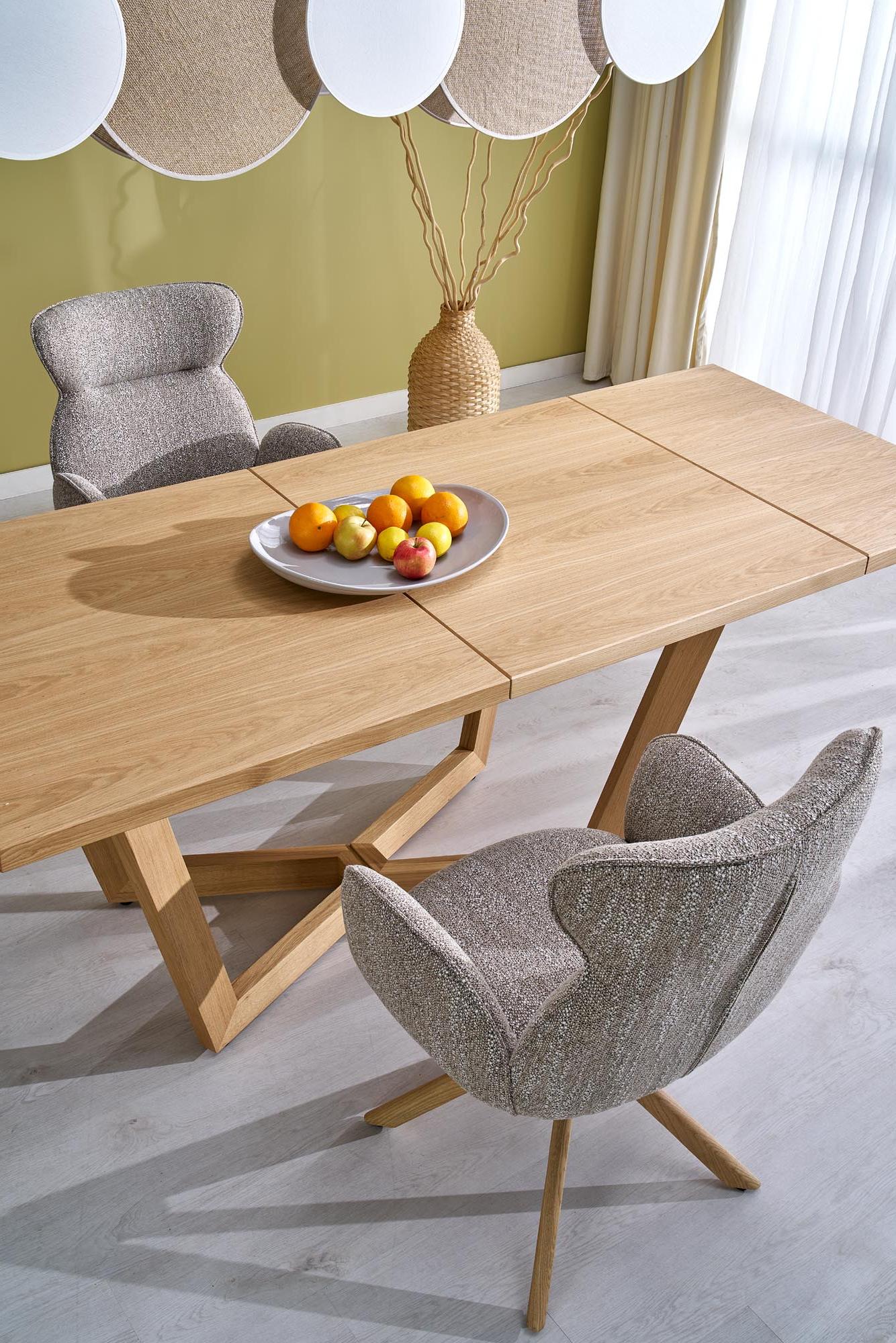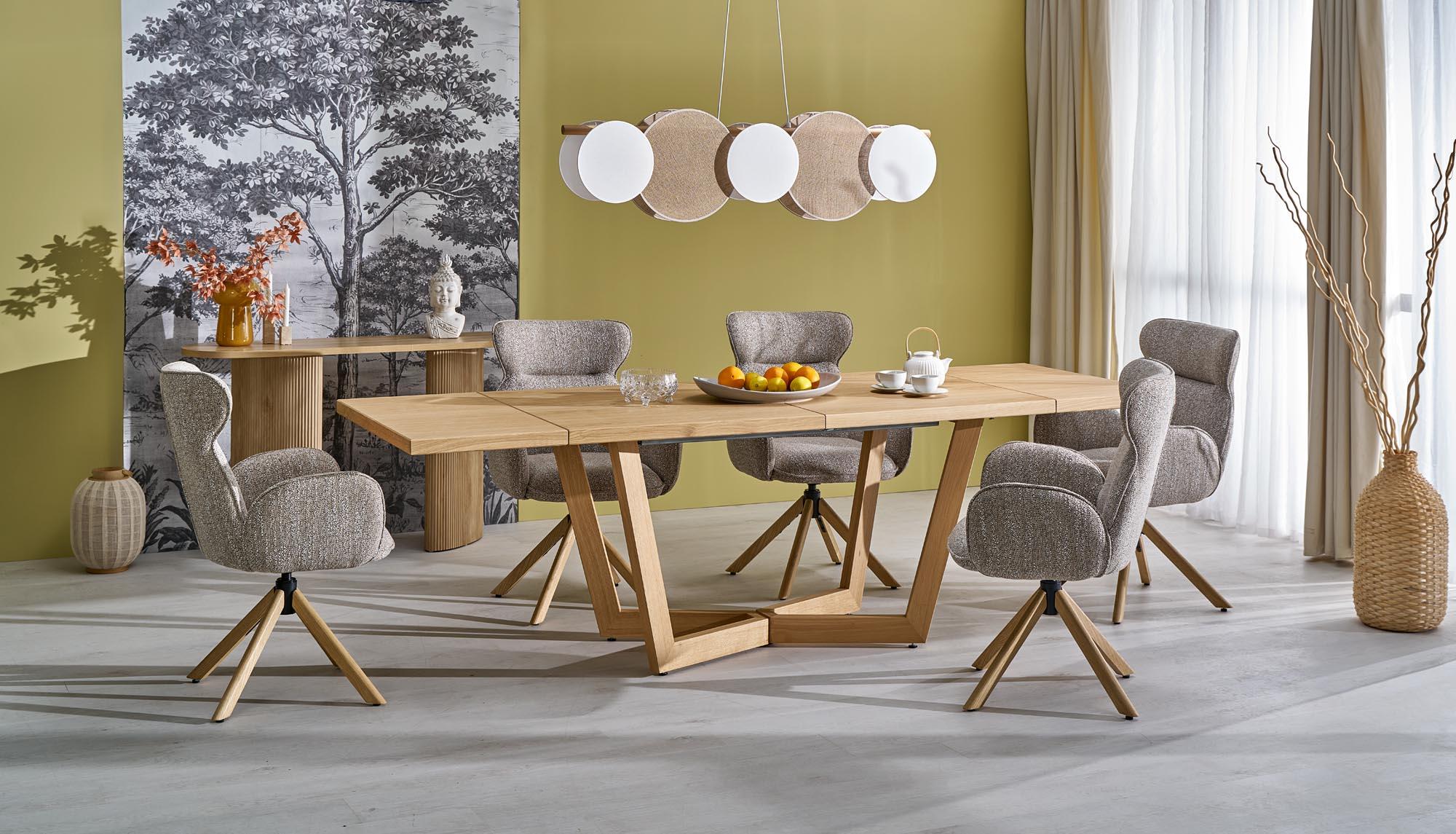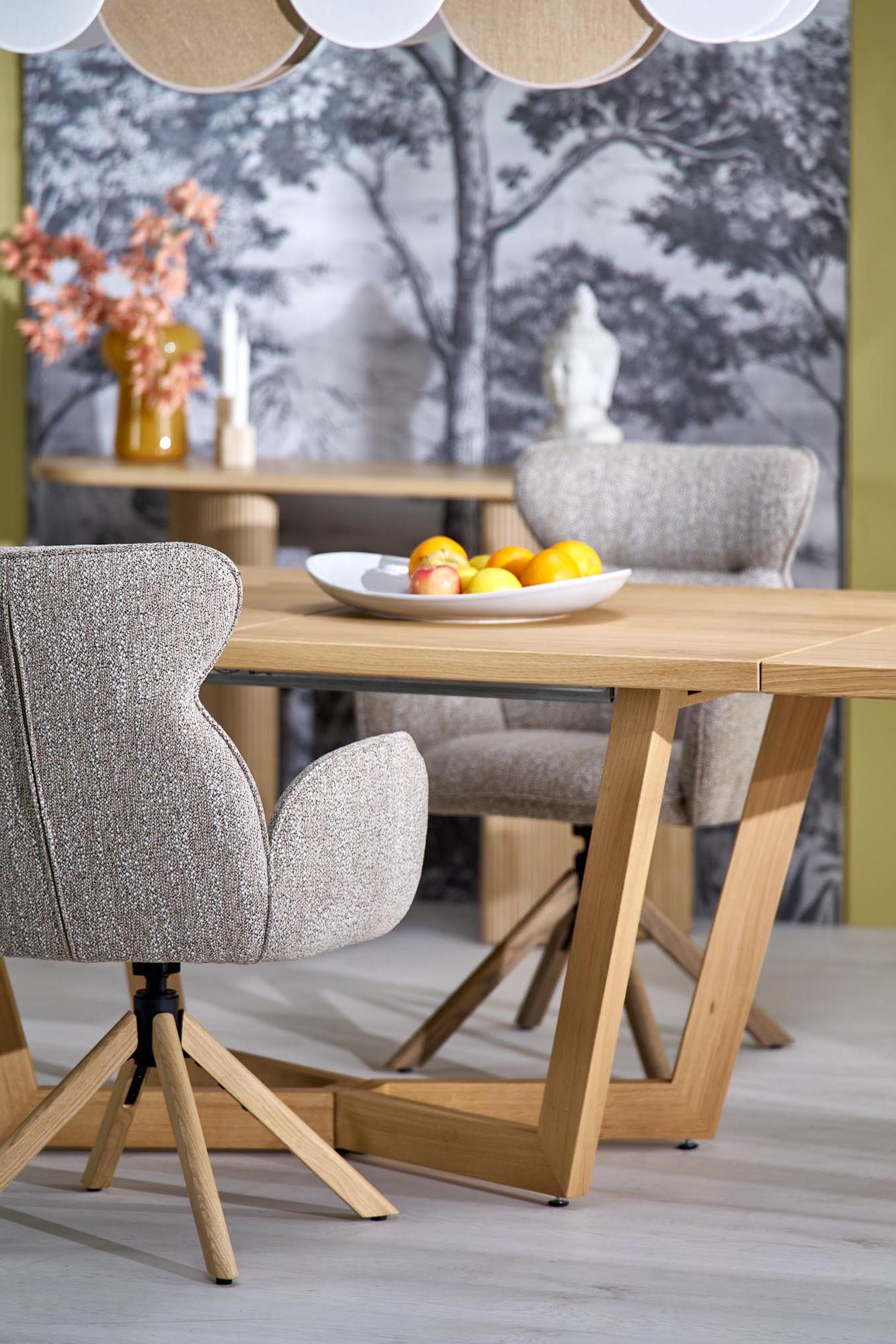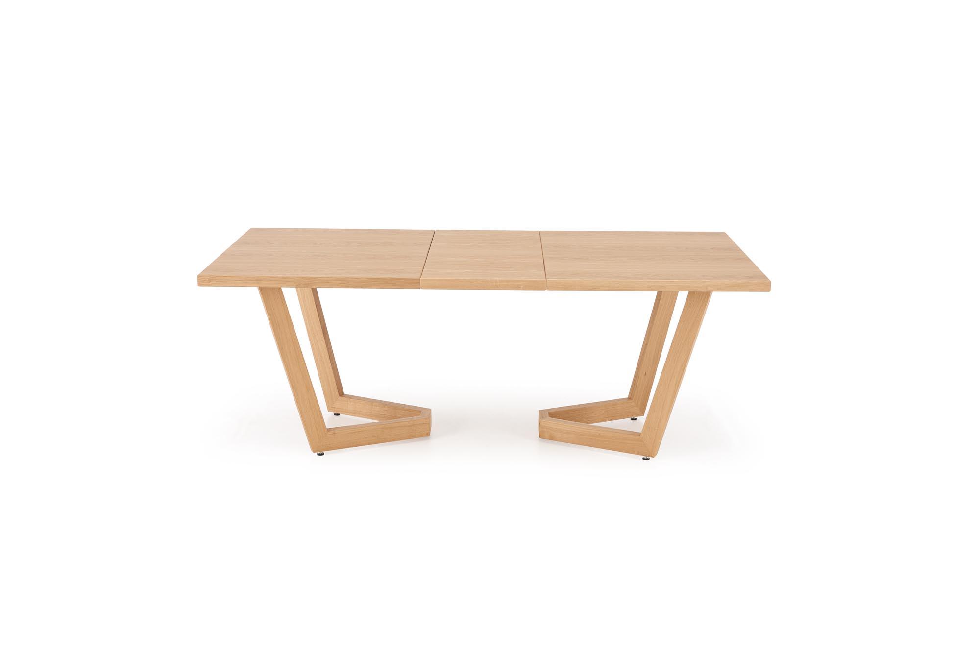 Stół wykonano z materiału: blat - płyta fornirowana, na obrzeżach drewno lite, nogi - drewno lite dębowe, kolor blat – dąb naturalny, nogi - dąb naturalny, * w opcji przedłużki do blatów MASSIVE 3 (wymiary 45x90 cm - 2 szt.)