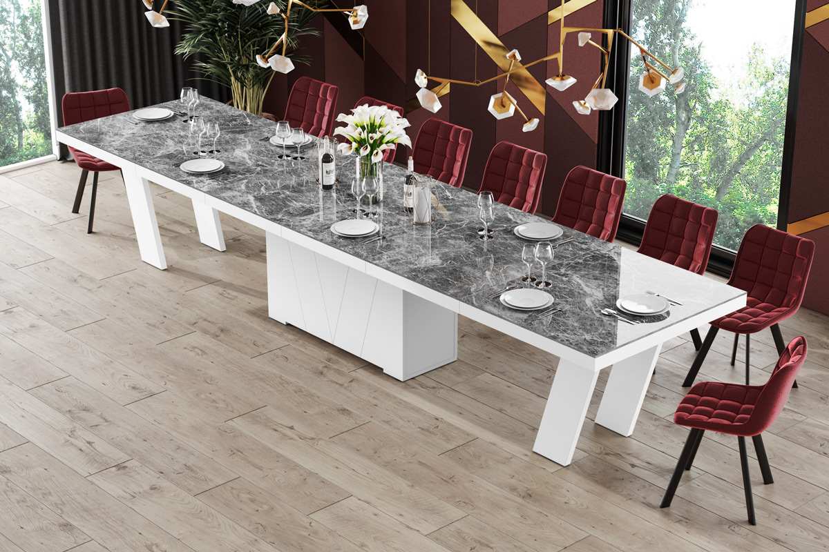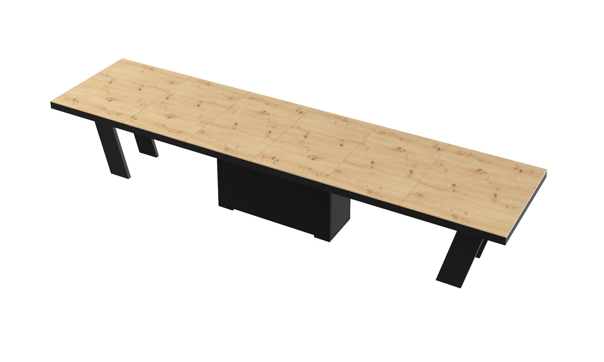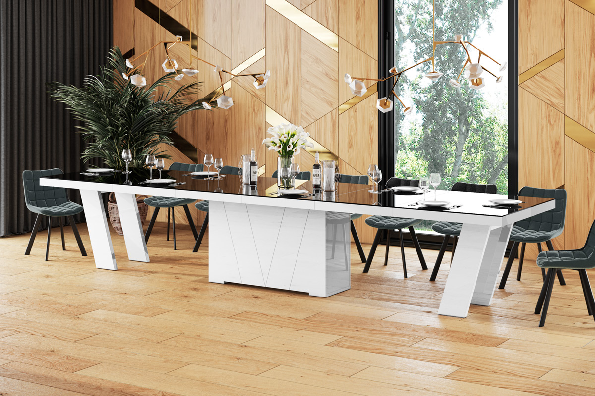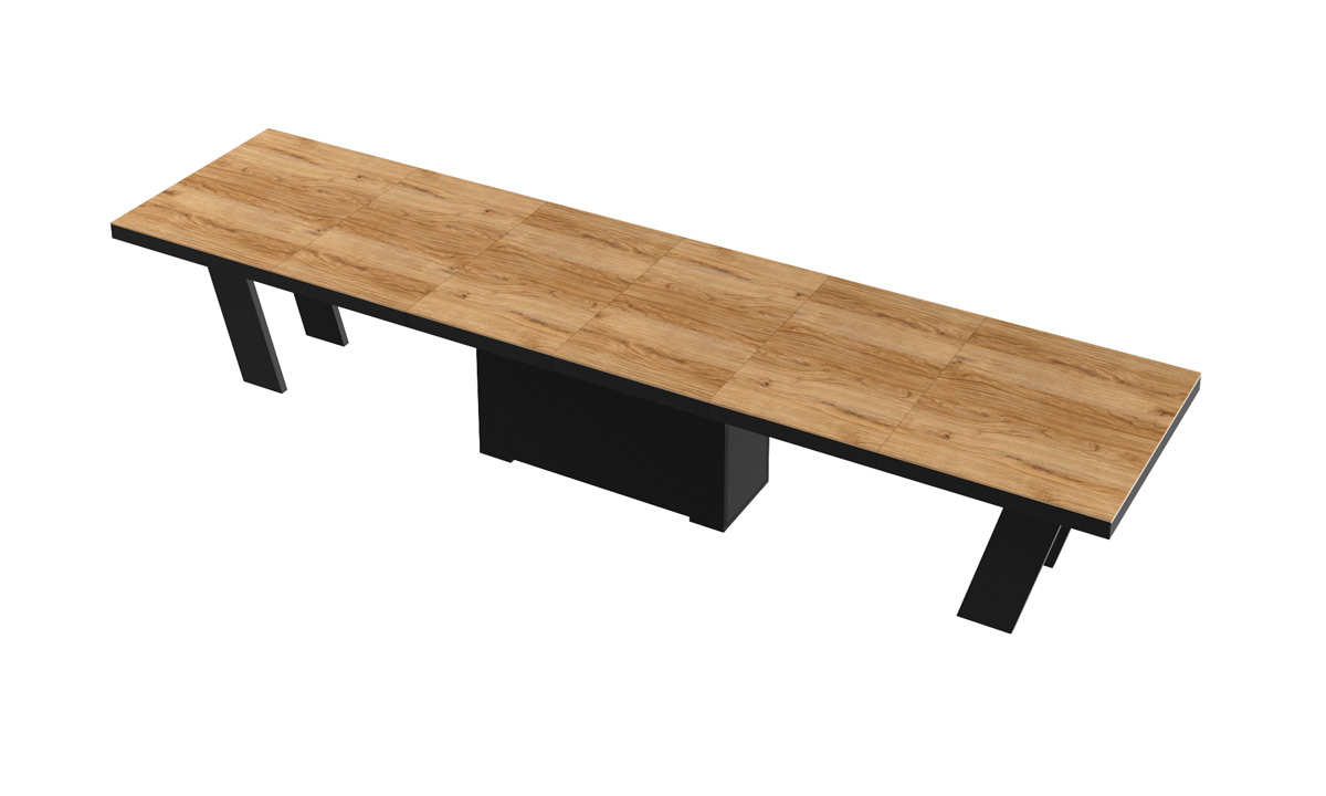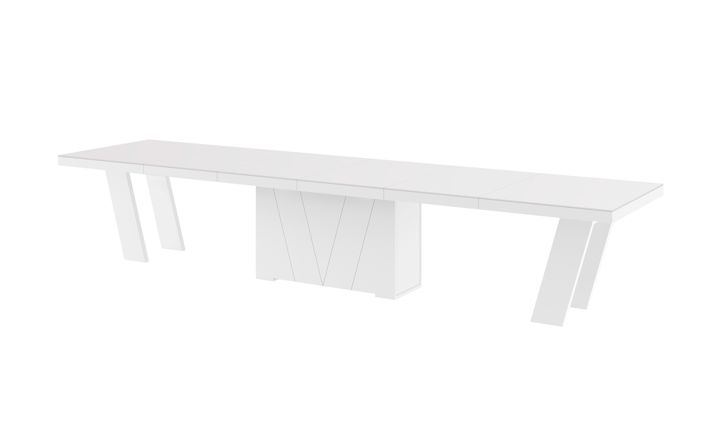 ​Stół GRANDE to kwintesencja designu firmy Hubertus. Prosta, nowoczesna forma połączona z eleganckim wyglądem i wysoką funkcjonalnością. Blat główny opiera się na szerokiej kolumnie, która w środku wyposażona jest w schowek na dodatkowe blaty powiększające oraz na 4 dodatkowych nogach ułożonych ukośnie w kształt litery V.
