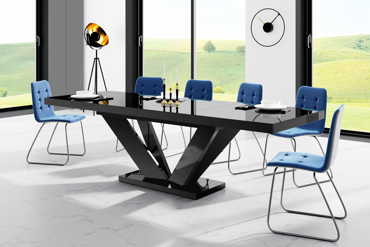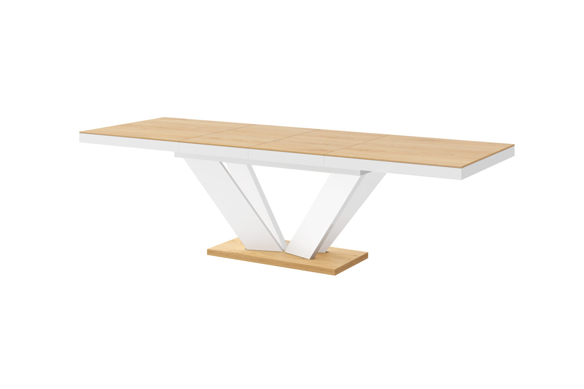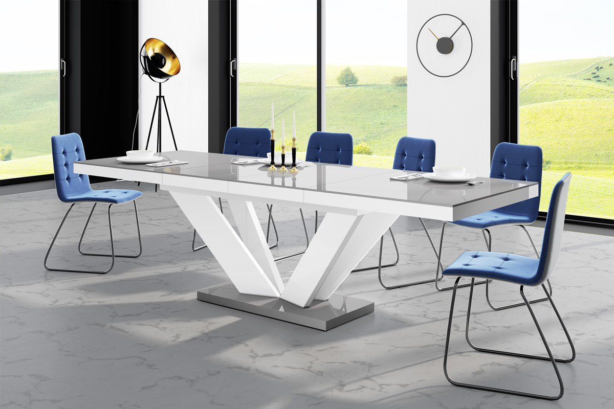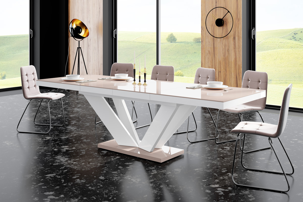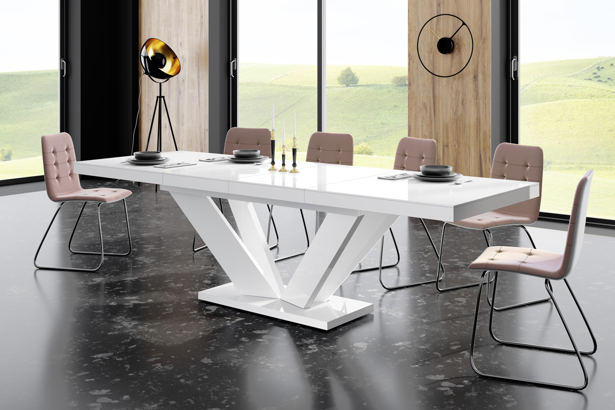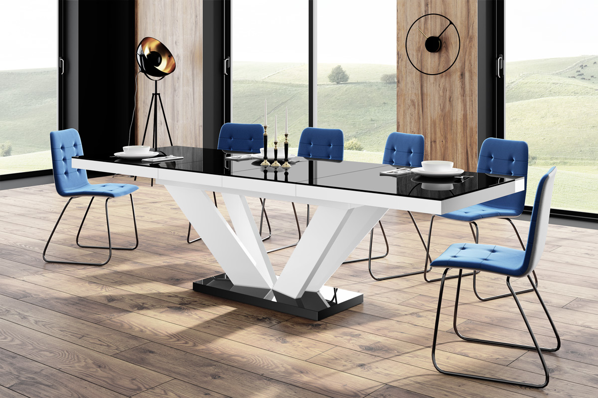 Stół VIVA 2 to oryginalny i niezwykle elegancki projekt firmy Hubertus. Wyróżnia go niespotykany design (podstawa stołu w kształcie delikatnych, prostokątnych czterech nóg ułożonych w kształt liter V) oraz funkcjonalność (rozkładany blat z miejscem do przechowywania dodatkowych wkładek pod blatem).