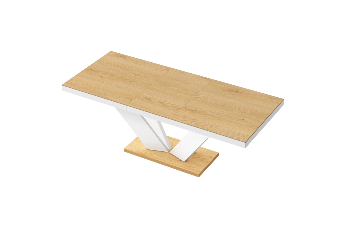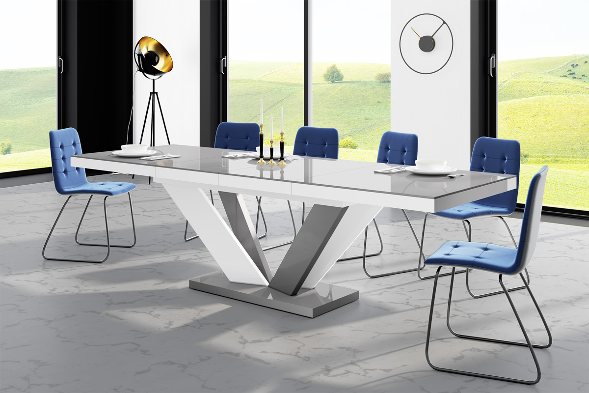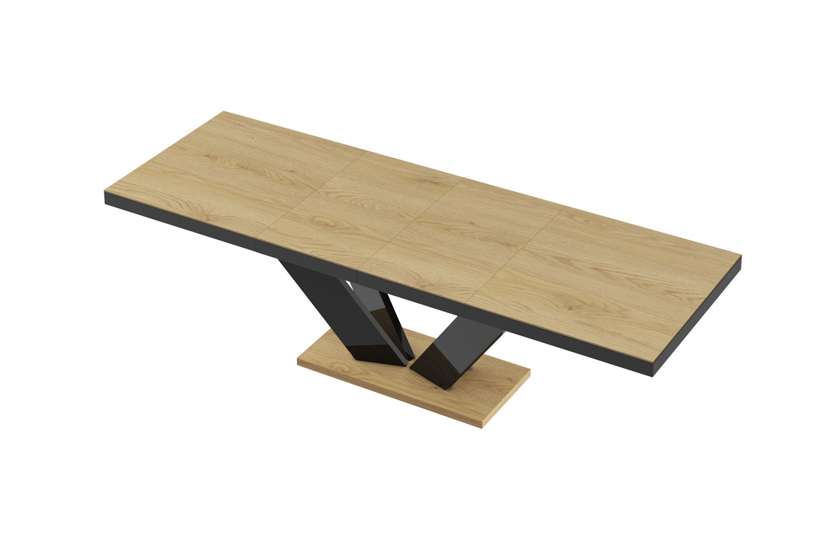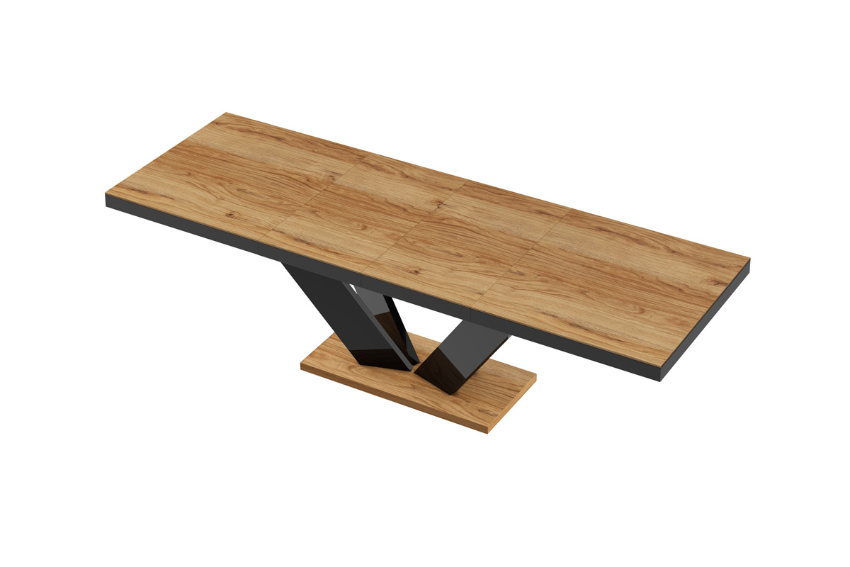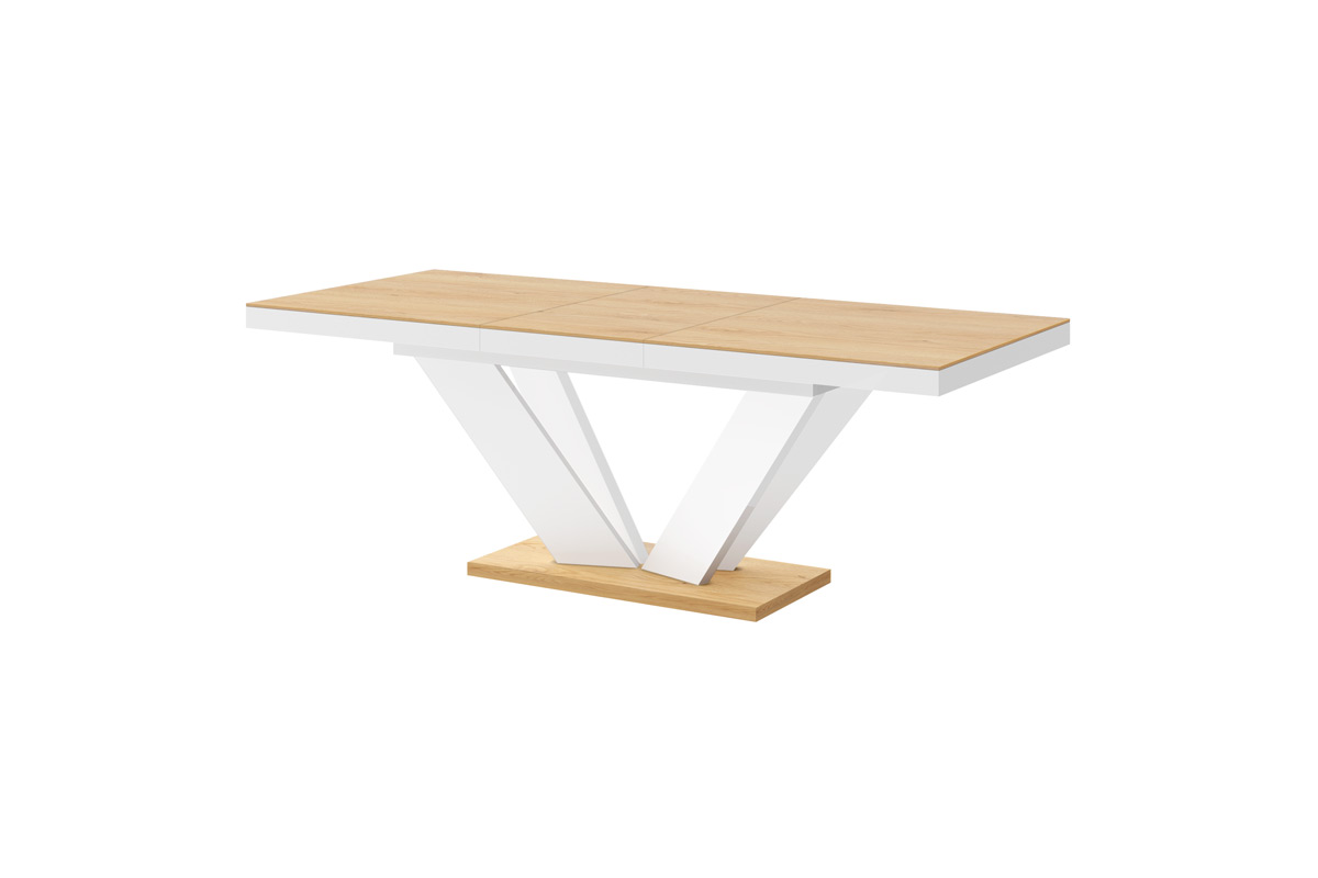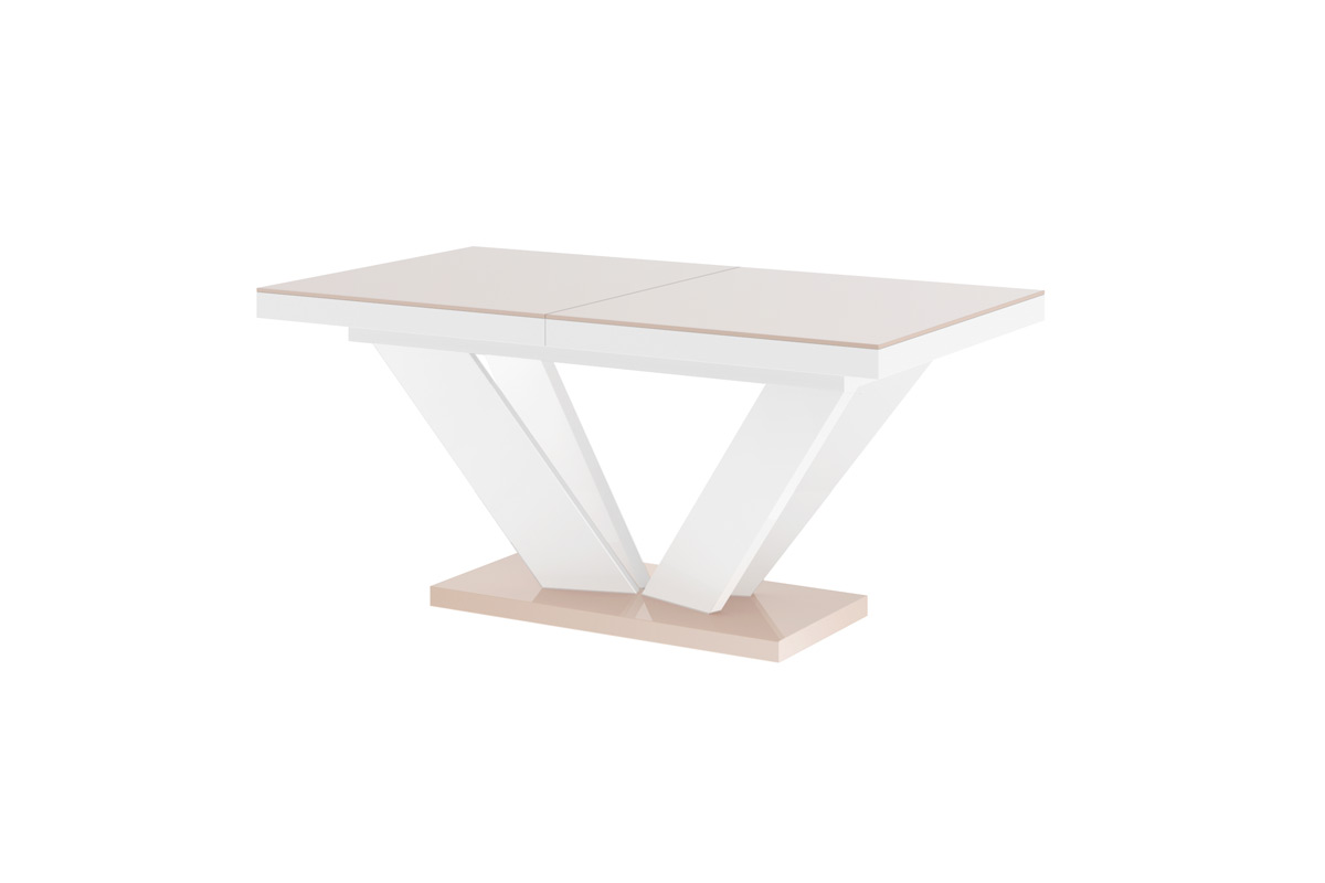 Stół VIVA 2 to oryginalny i niezwykle elegancki projekt firmy Hubertus. Wyróżnia go niespotykany design (podstawa stołu w kształcie delikatnych, prostokątnych czterech nóg ułożonych w kształt liter V) oraz funkcjonalność (rozkładany blat z miejscem do przechowywania dodatkowych wkładek pod blatem).