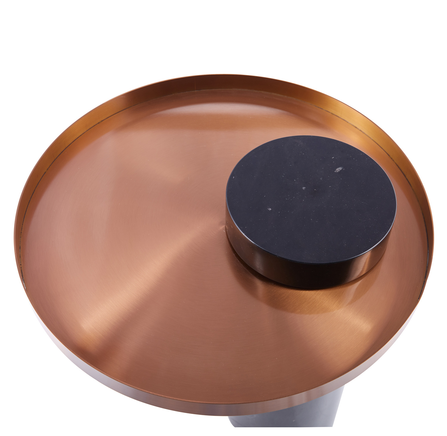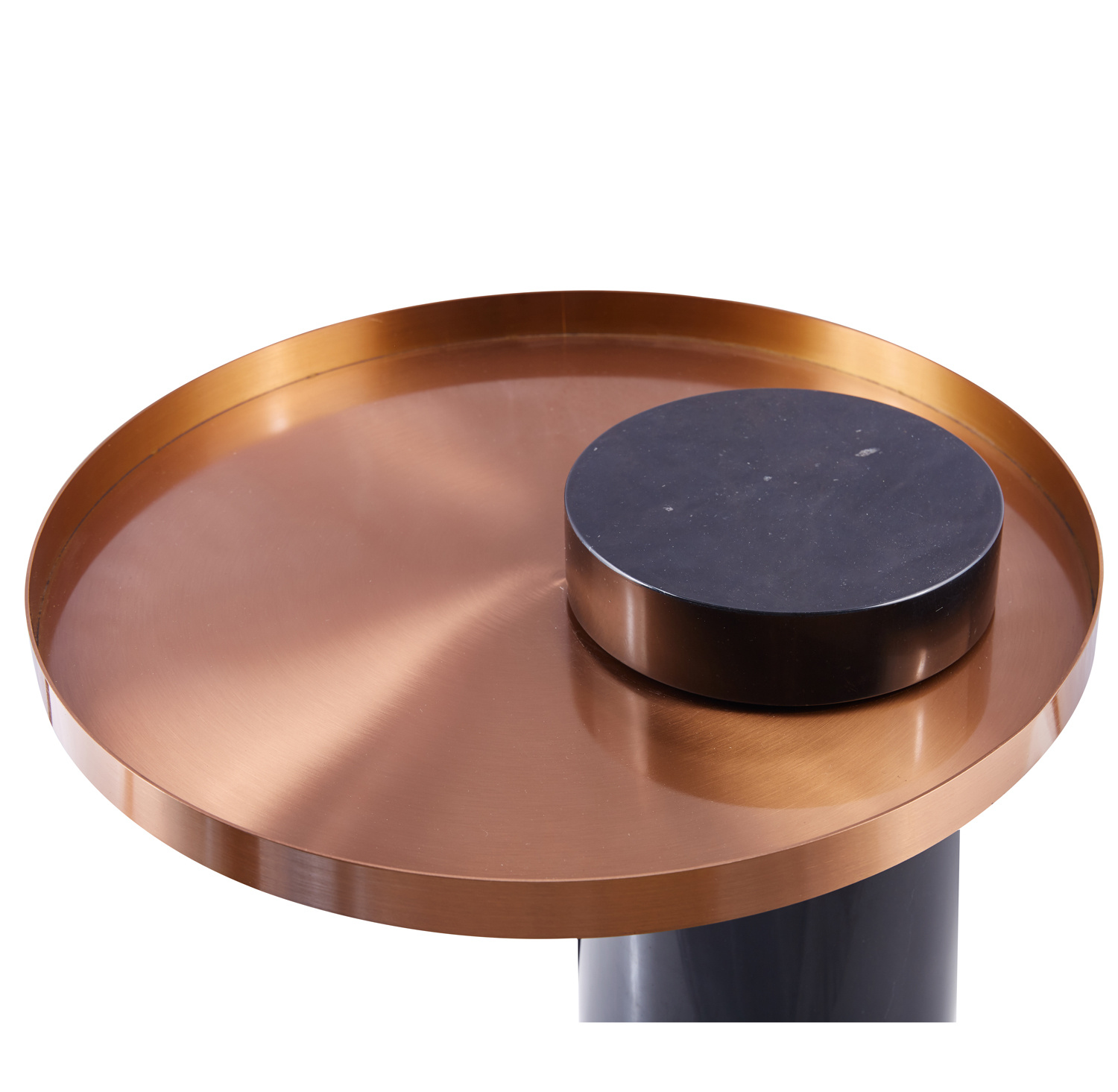 Stolik kawowy COLUMN to elegancki mebel, który łączy w sobie naturalne piękno czarnego marmuru z nowoczesnym akcentem szczotkowanej stali w miedzianym kolorze.
