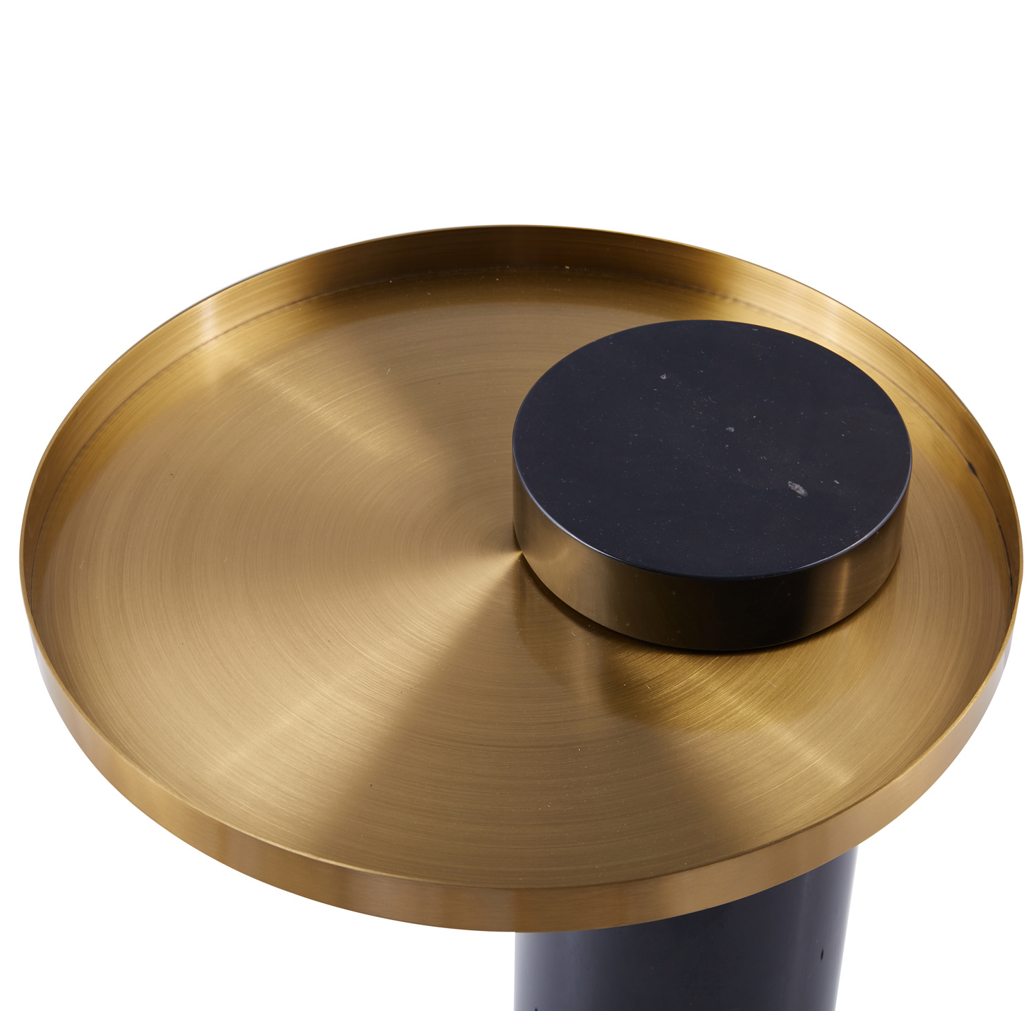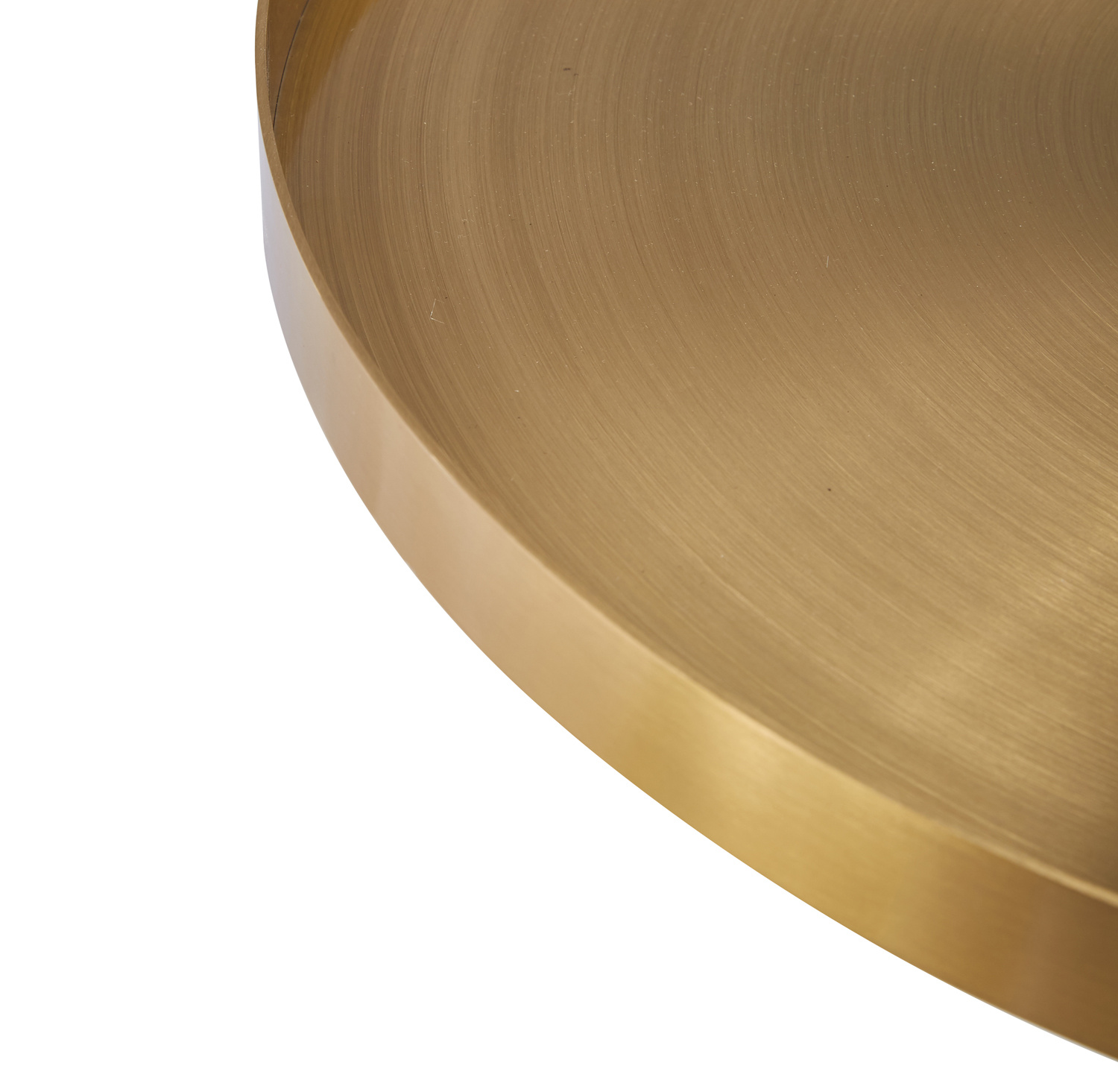 Blat stolika ma formę okrągłej tacy wykonanej z stali szczotkowanej w kolorze złotym.