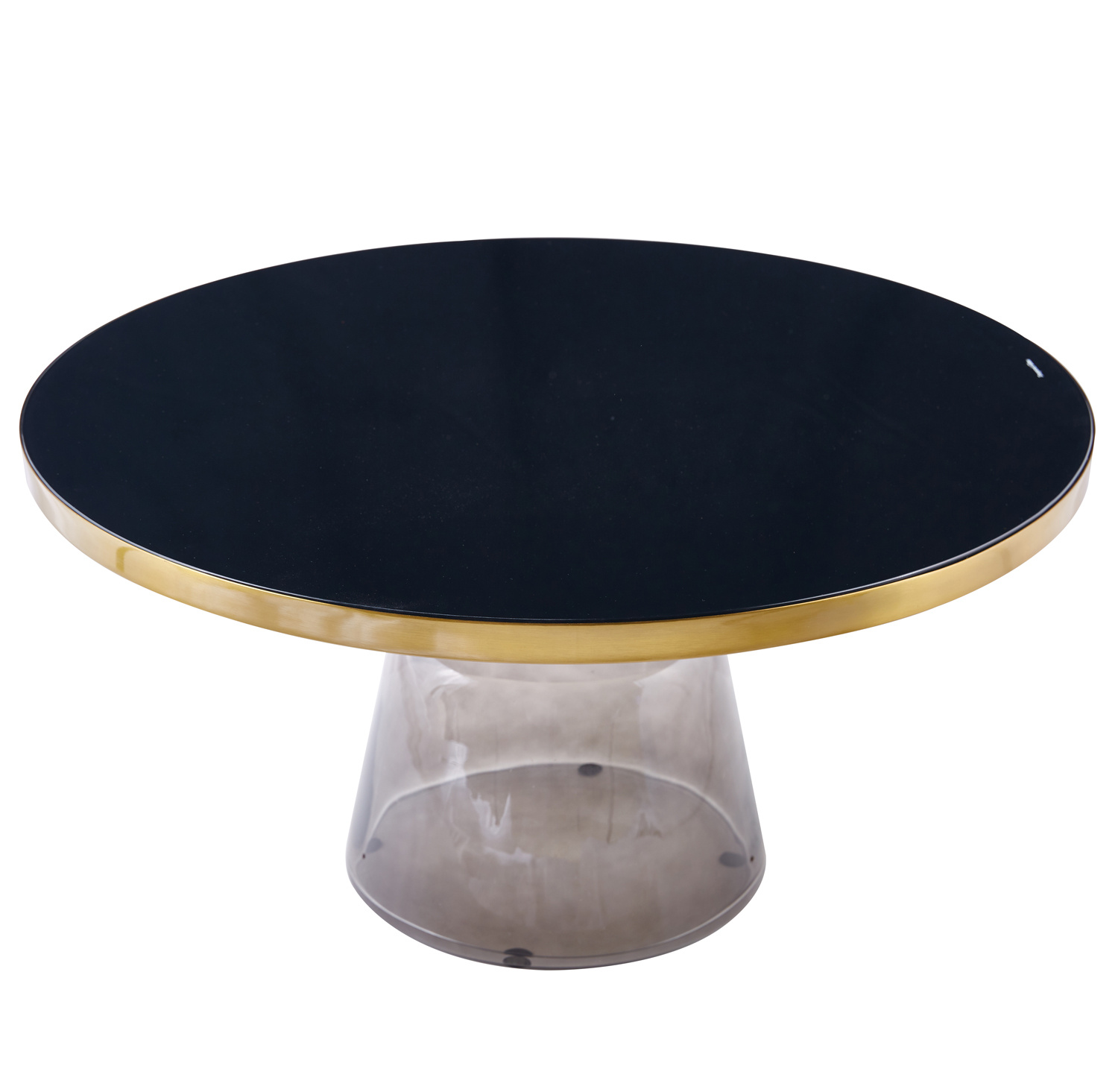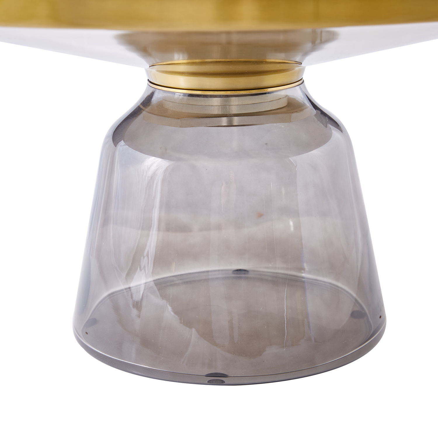 Najbardziej charakterystycznym elementem stolika jest jego solidna noga wykonana z przezroczystego, szarego szkła. Jej organiczny, zaokrąglony kształt, przywodzący na myśl elegancki wazon, nadaje stolikowi lekkości wizualnej i subtelnej nowoczesności. Dymny odcień szarości wprowadza do wnętrza elegancję i wyrafinowanie.