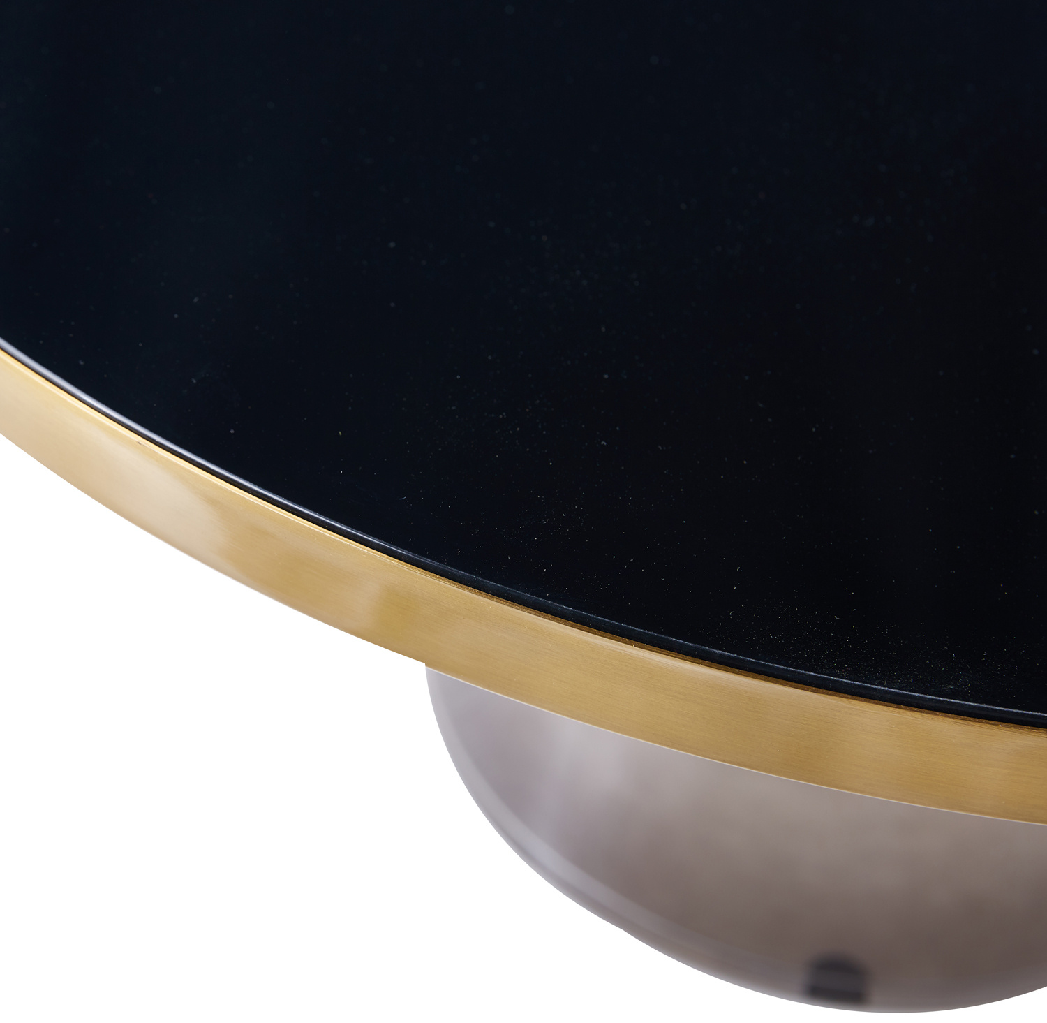 Stolik DOLCE FLAT charakteryzuje się okrągłym blatem wykonanym z gładkiego, czarnego materiału. Jego krawędź zdobi stalowa obręcz w eleganckim kolorze miedzianym, dodająca subtelnego blasku i wyrafinowania.