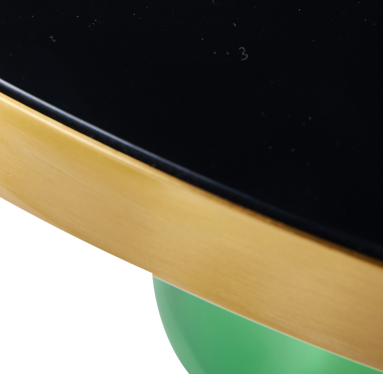 Okrągły blat wykonany z gładkiego, czarnego szkła emanuje spokojem i ponadczasową elegancją. Jego obrzeże wykończone jest miedzianą obręczą ze szczotkowanej stali, która dodaje całości ciepłego akcentu i szlachetnego wyrazu.