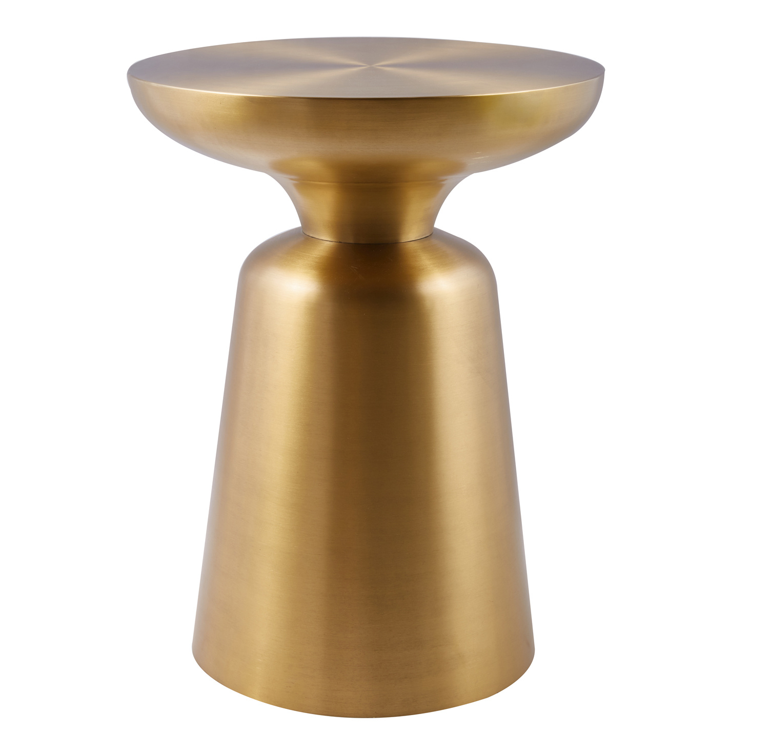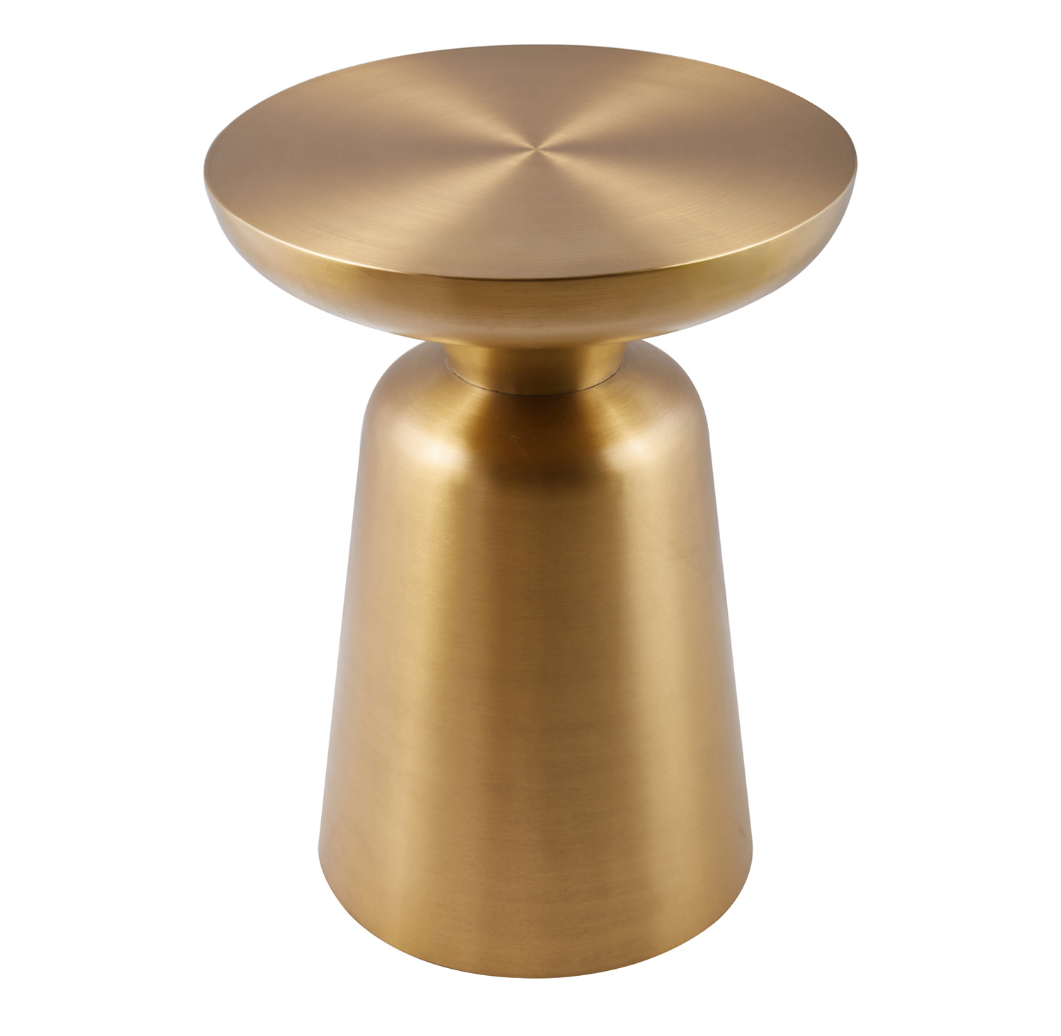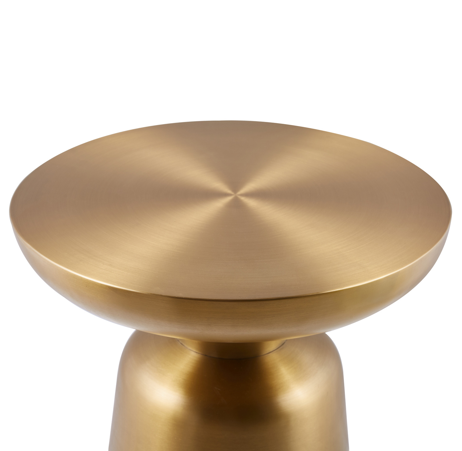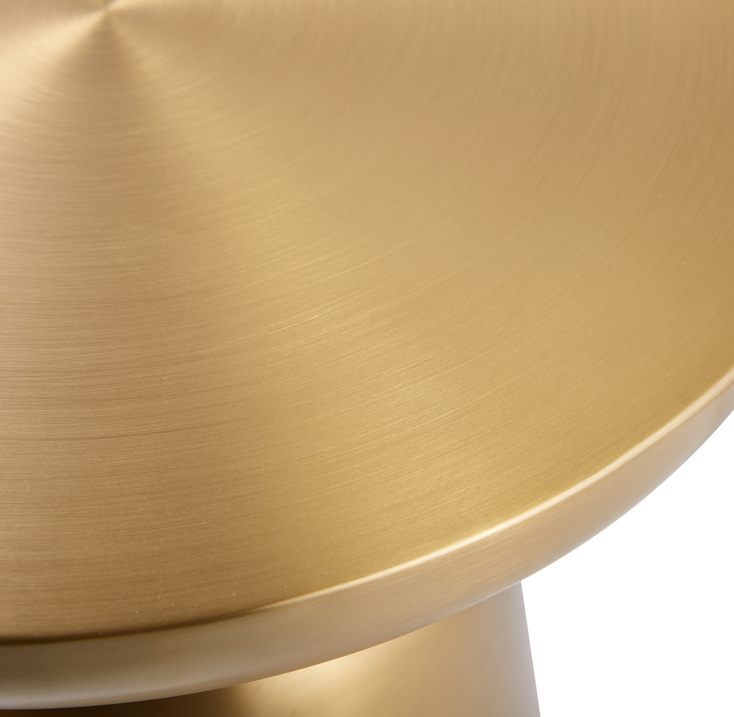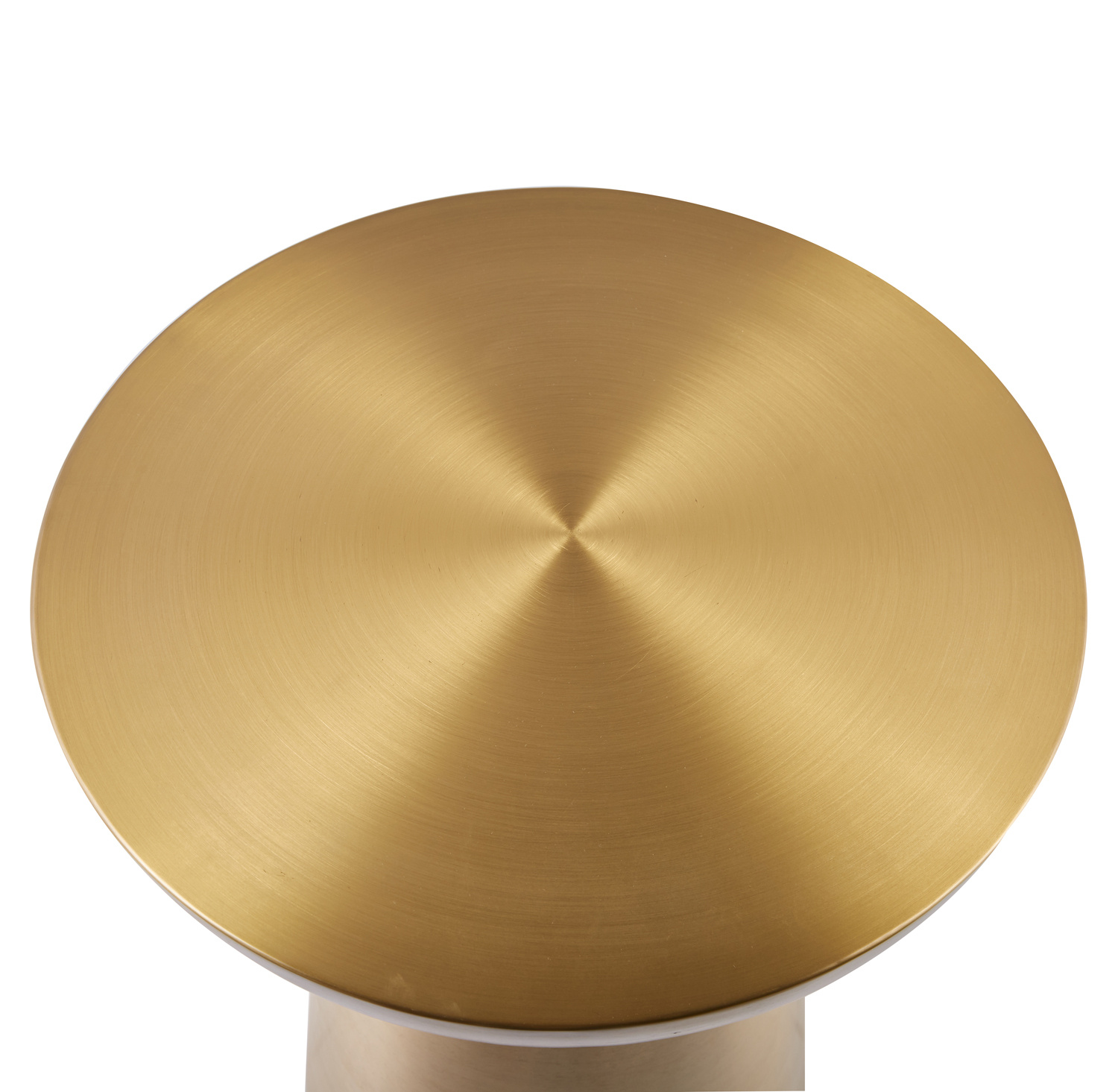 Okrągły blat stolika, również wykonany z szczotkowanej stali w kolorze złotym, idealnie komponuje się z masywną nogą. Jego gładka powierzchnia jest nie tylko elegancka, ale także funkcjonalna i łatwa w czyszczeniu, co czyni go praktycznym dodatkiem do salonu, sypialni czy każdego innego nowoczesnego wnętrza.